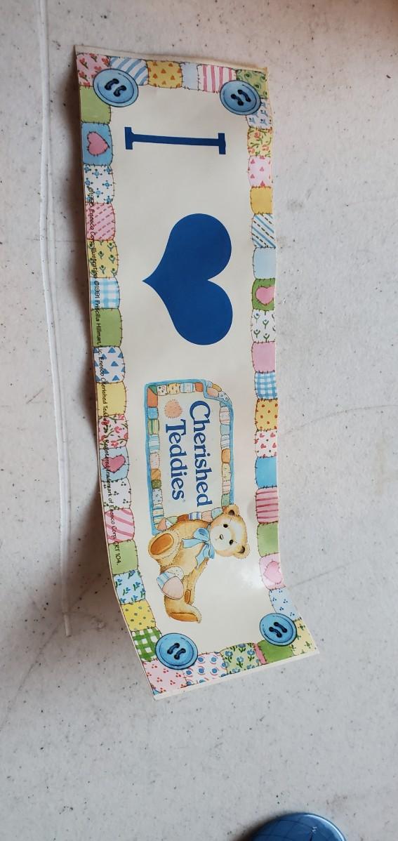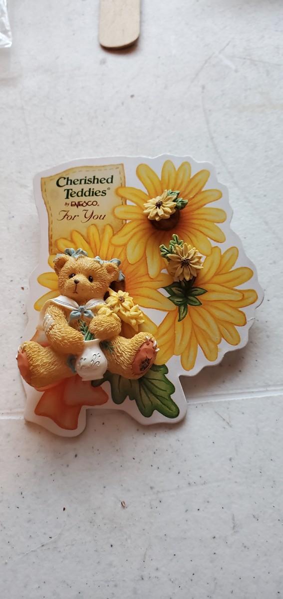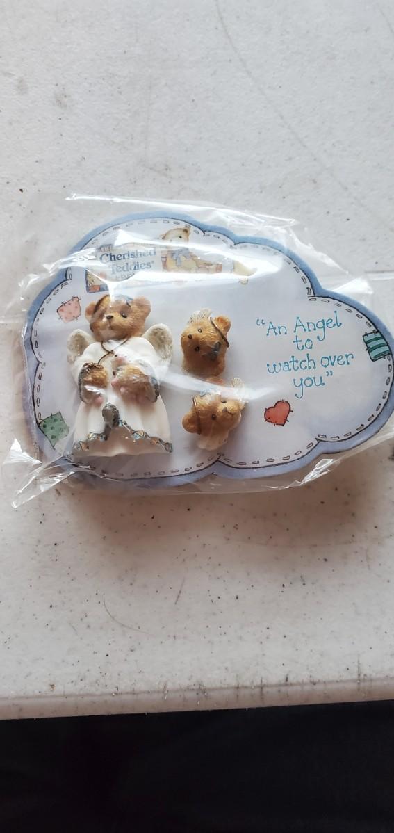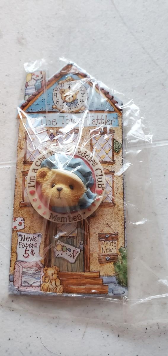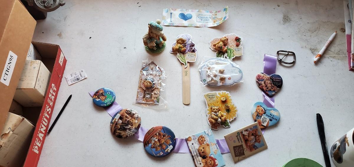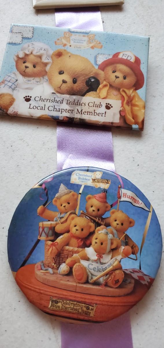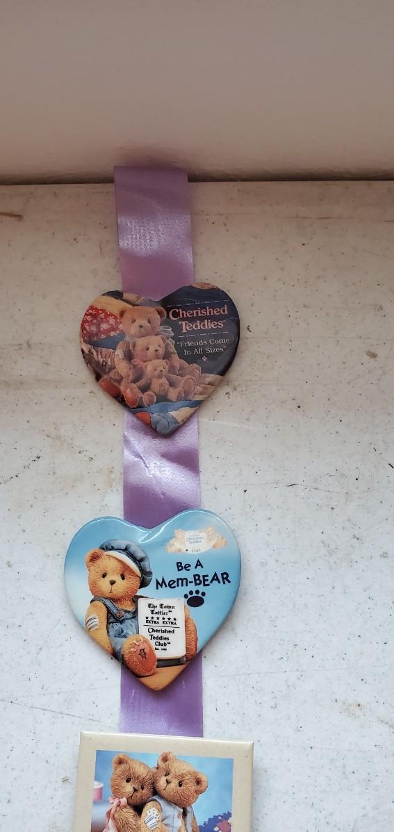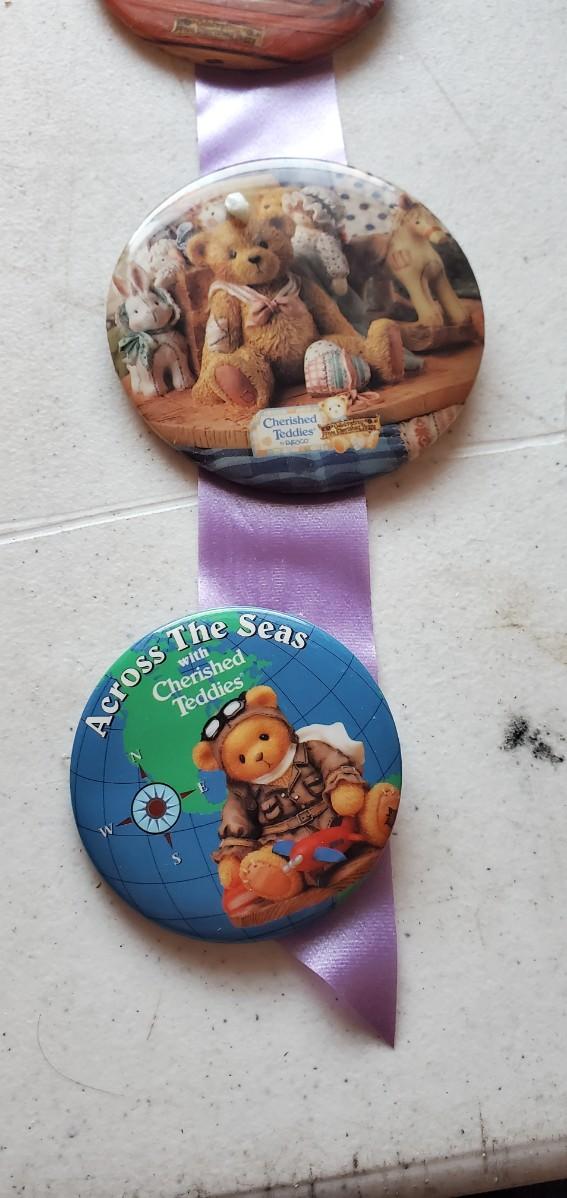 8 piece lot featuring lapel and earrings, cherished teddies sticker, Tom Tom the pipers son,various clip on buttons