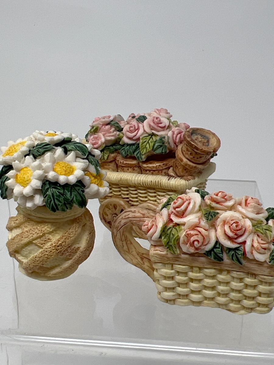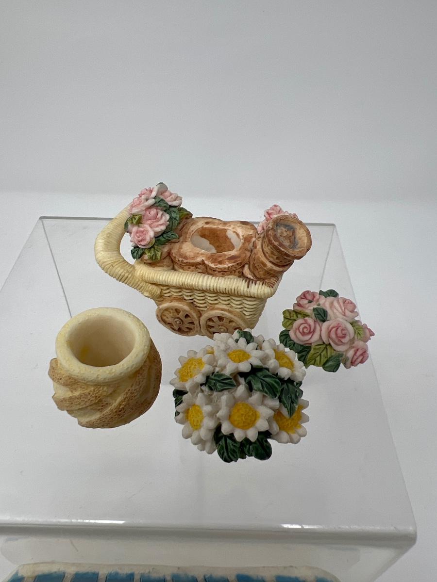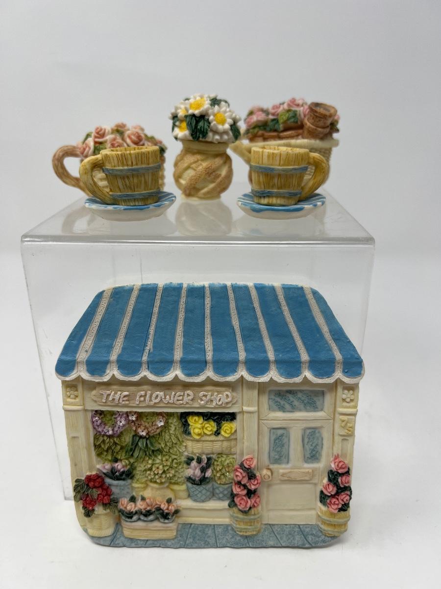 Popular Imports, 1996, miniature Flower Shop with mugs, plates, bouquet flowers, wagon and basket of flowers and flower shop storefront plaque (4.25” x 4.5”)