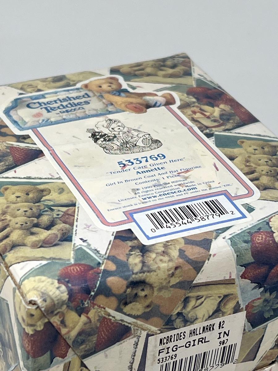 Annette “Tender Care Given Here”, Bear with Tree, 3” tall, 9E8/010, 1999. Box.