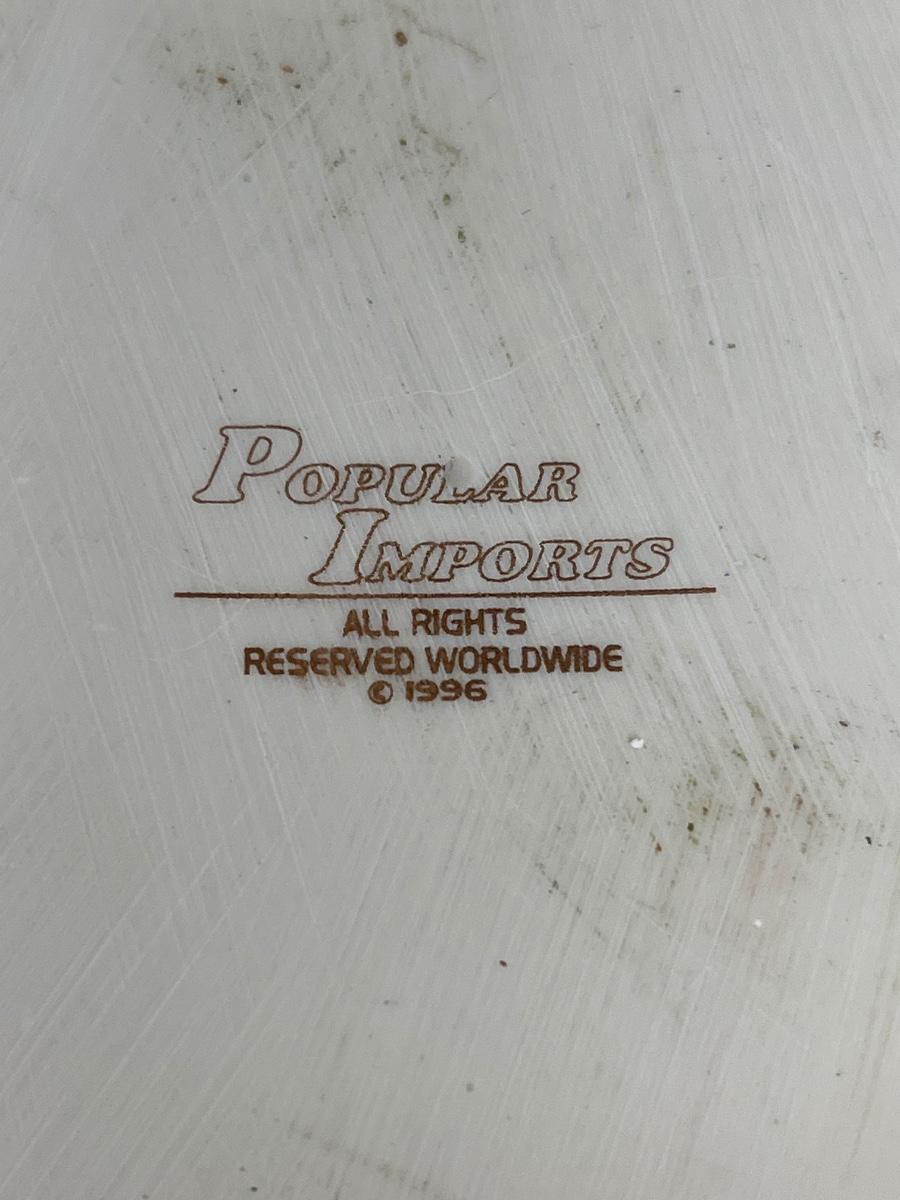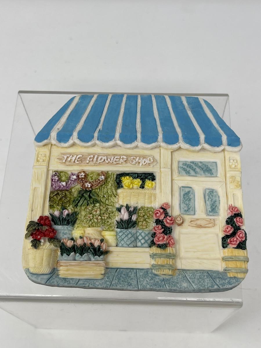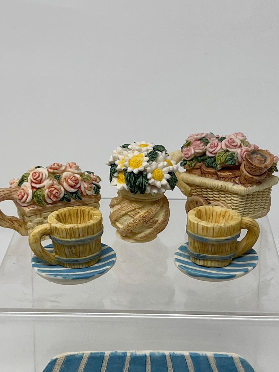 Popular Imports, 1996, miniature Flower Shop with mugs, plates, bouquet flowers, wagon and basket of flowers and flower shop storefront plaque (4.25” x 4.5”)