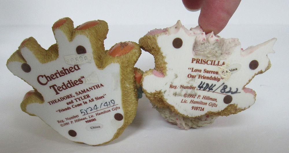 Cherished Teddies, Theodore, Samantha, and Tyler #5V241/419. 1991 & Priscilla, Love Surrounds Our Friendship, 404/822, 1992