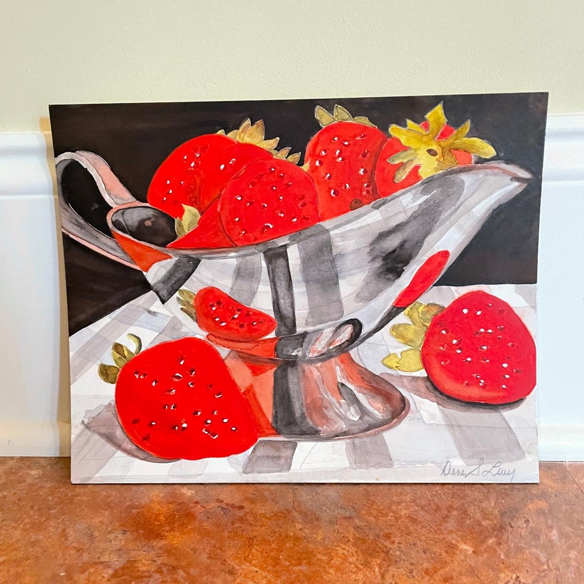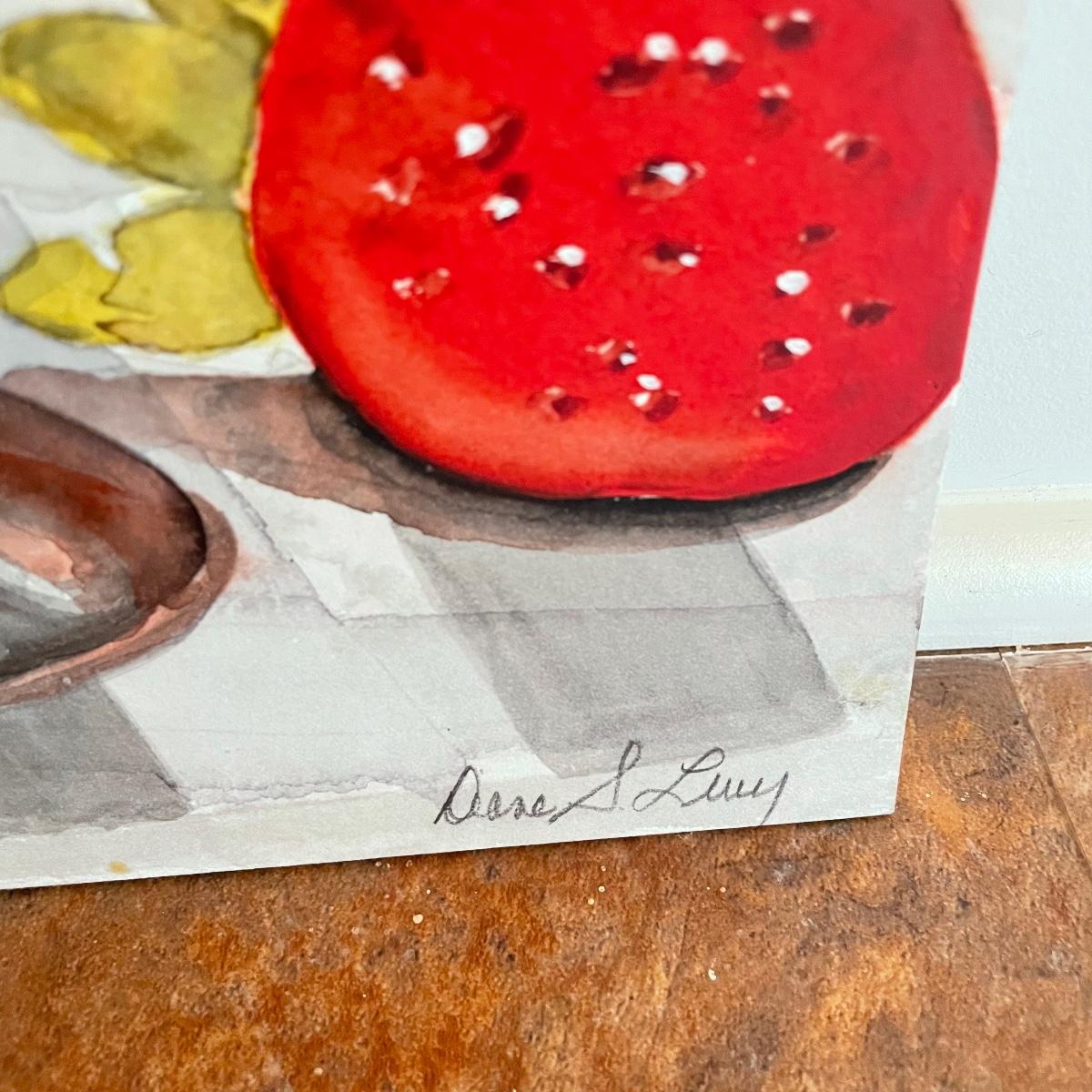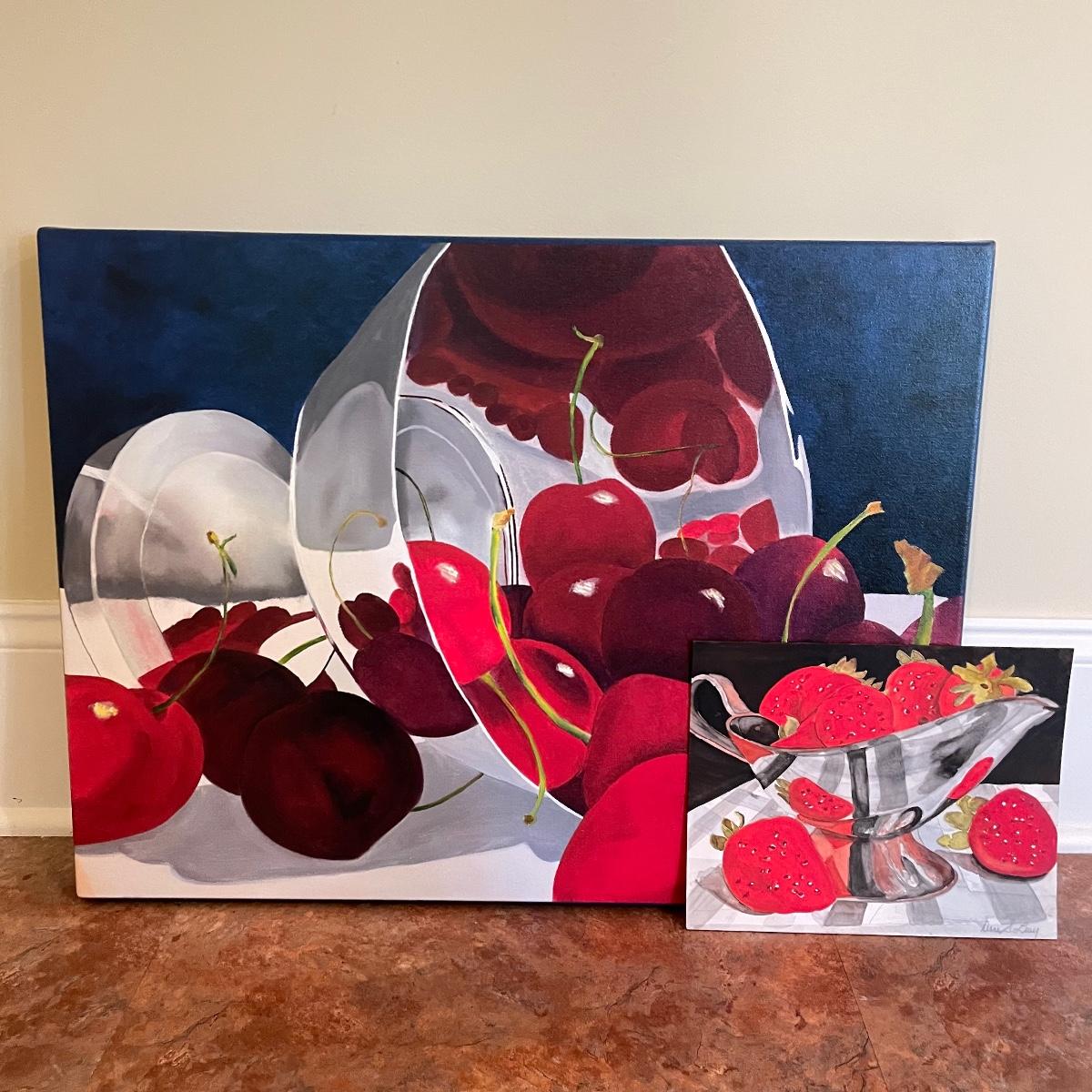 A rolling bowl of cherries giclee signed on wrapped canvas 24” x 16” frame. Next, strawberry art with some watercolors waiting for the perfect frame measures 10” x 8”. Both signed by the artist Diane Levy. Shipping available. Please call UPS with dimensions at 828-252-6930 for a shipping quote prior to bidding.