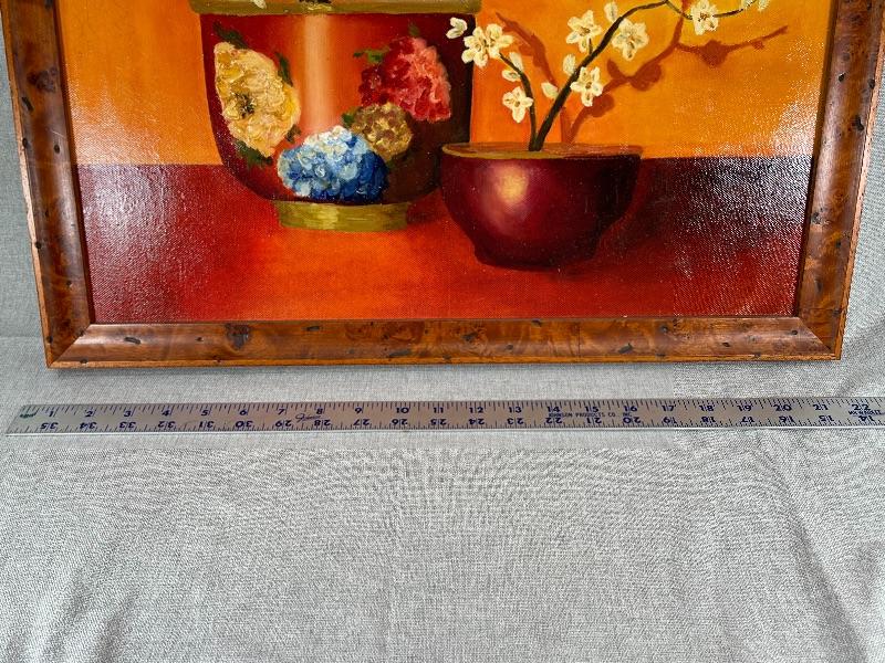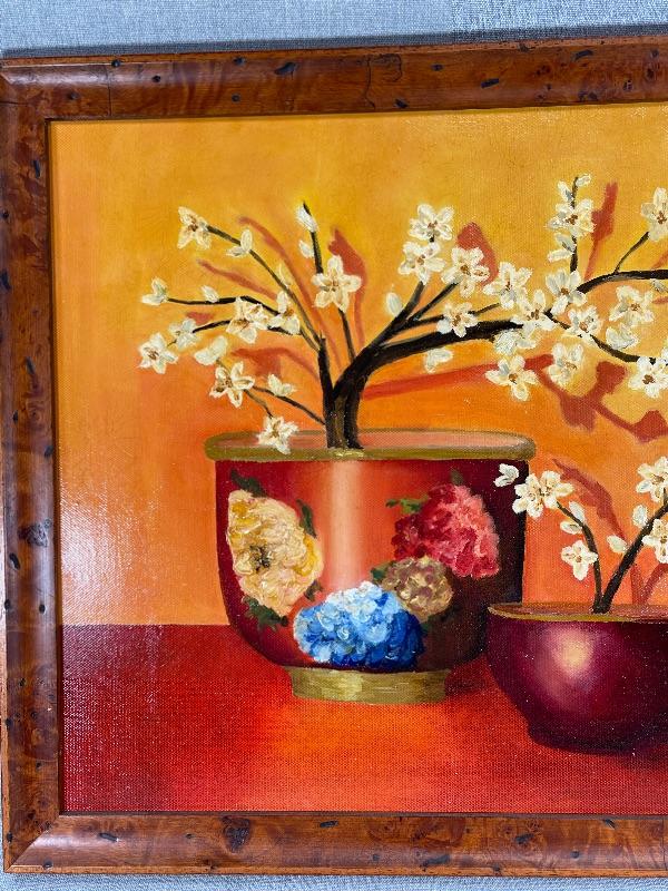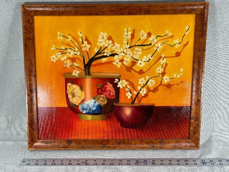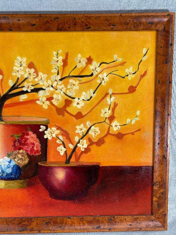 Framed unsigned cherry blossom art. Warm tones in coppers, yellows, & gold. 22" wide.