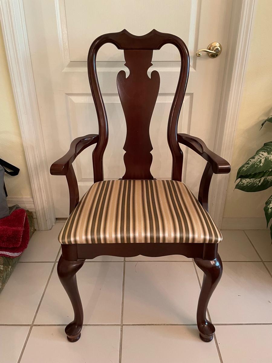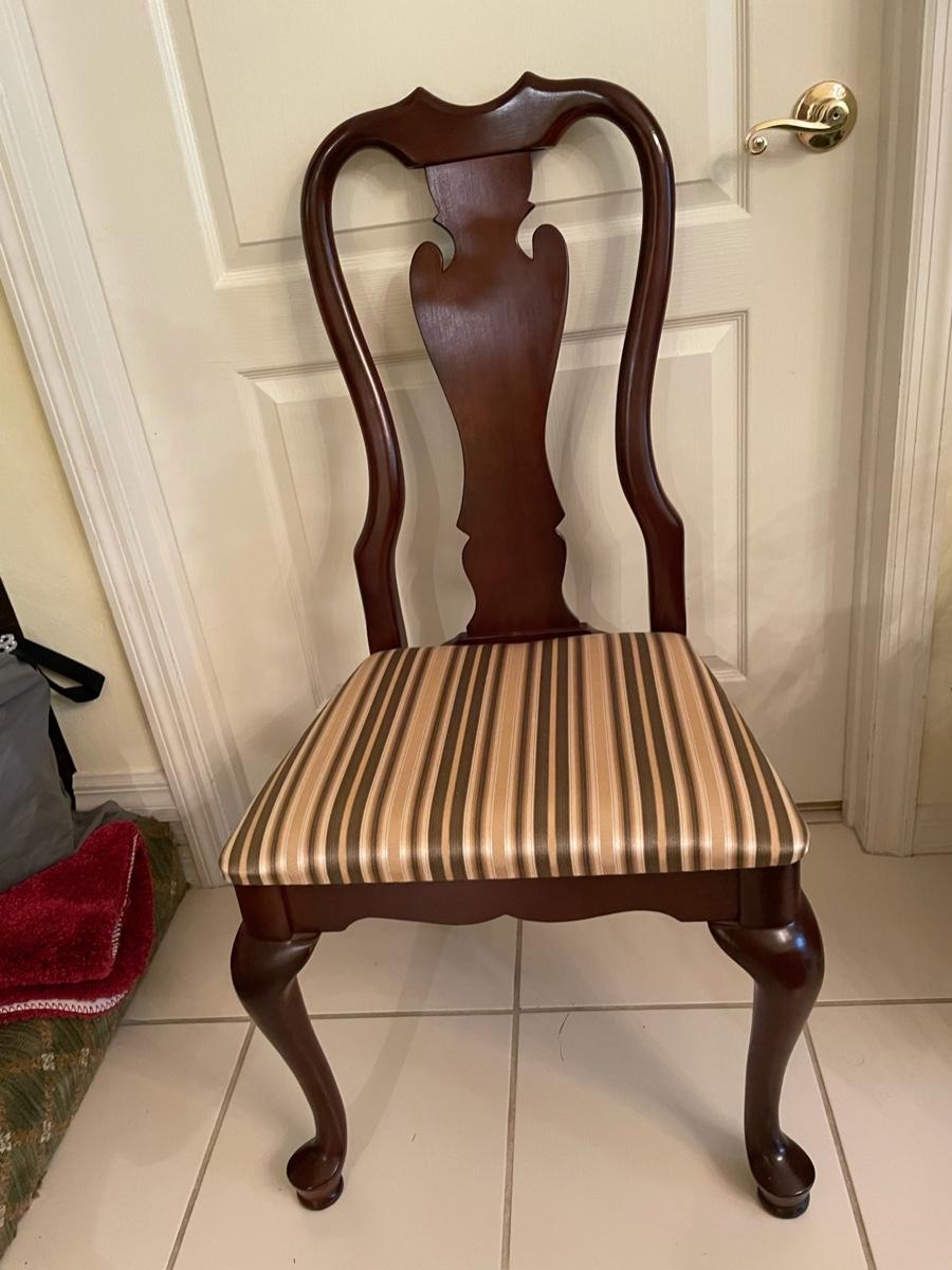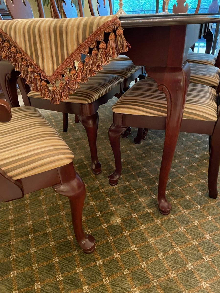 Queen Anne or Chippendale style oval dining table with custom glass protector. Table measures 84" with two 12" leaves. Two host chairs and 6 side chairs. Beautiful set in perfect condition. Also included is the custom runner that matches the seat upholstery.