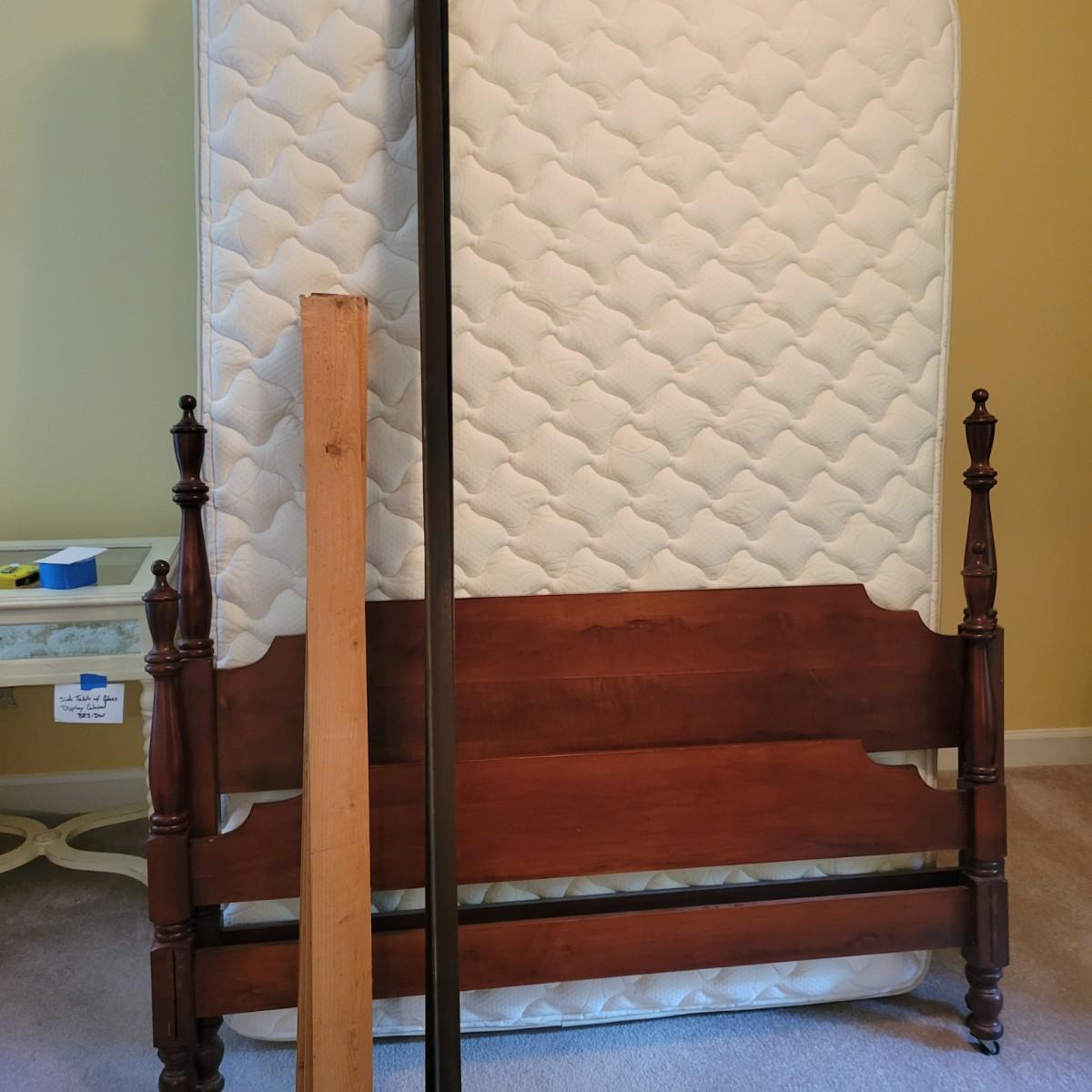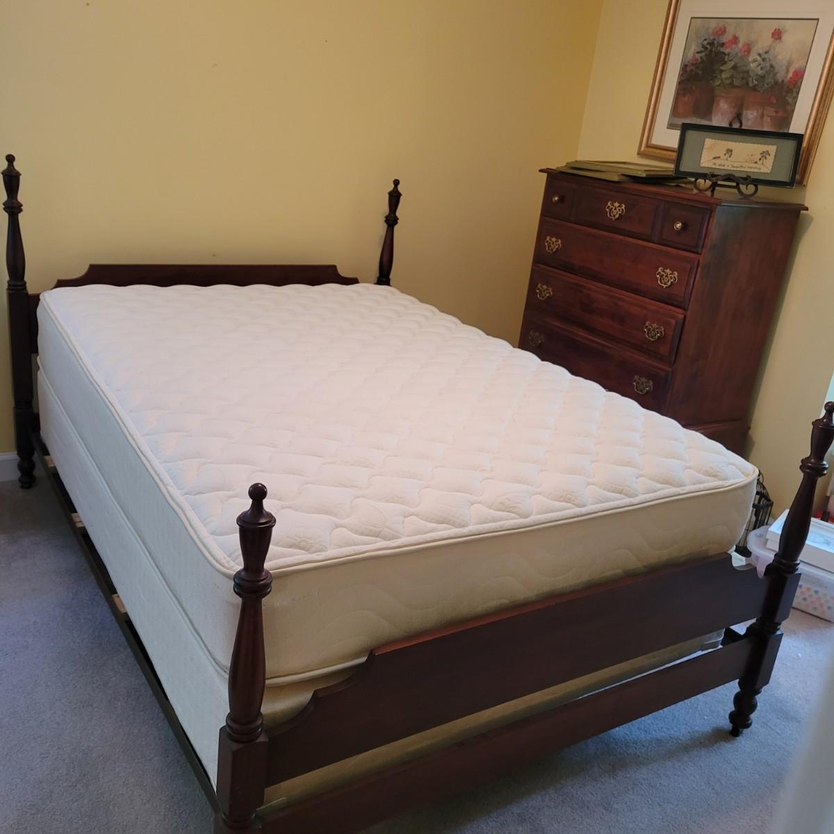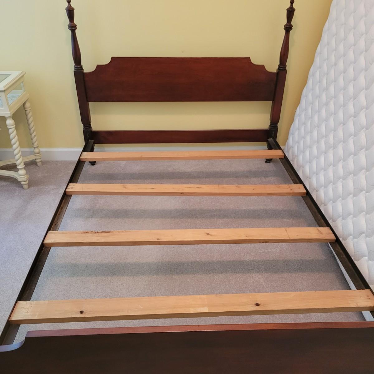 A full size bed frame, rails and slats. The bed frame is solid wood with a cherry finish and has caster. It measures approximately 58" x 81" x 45.5"H. The bed frame includes metal rails with wooden slats. The mattress is available to the winning bidder if desired, but the winning bidder is not required to take it. The mattress appears to have minimal use and no notable stains or odors. Local pickup only. Winning bidder must bring assistance to help move and load this item due to its weight and/or size.