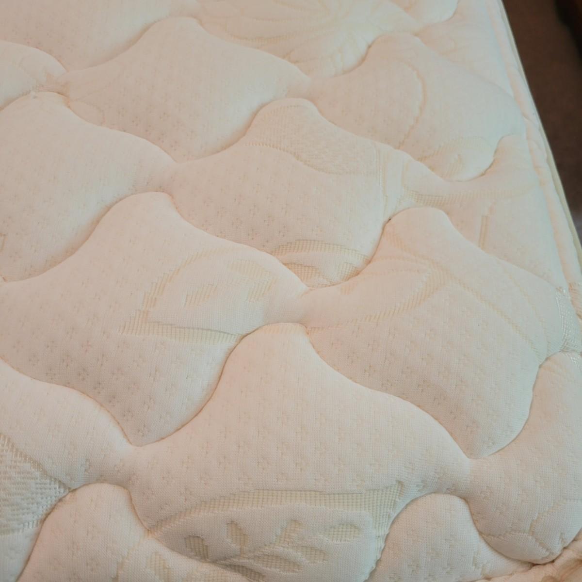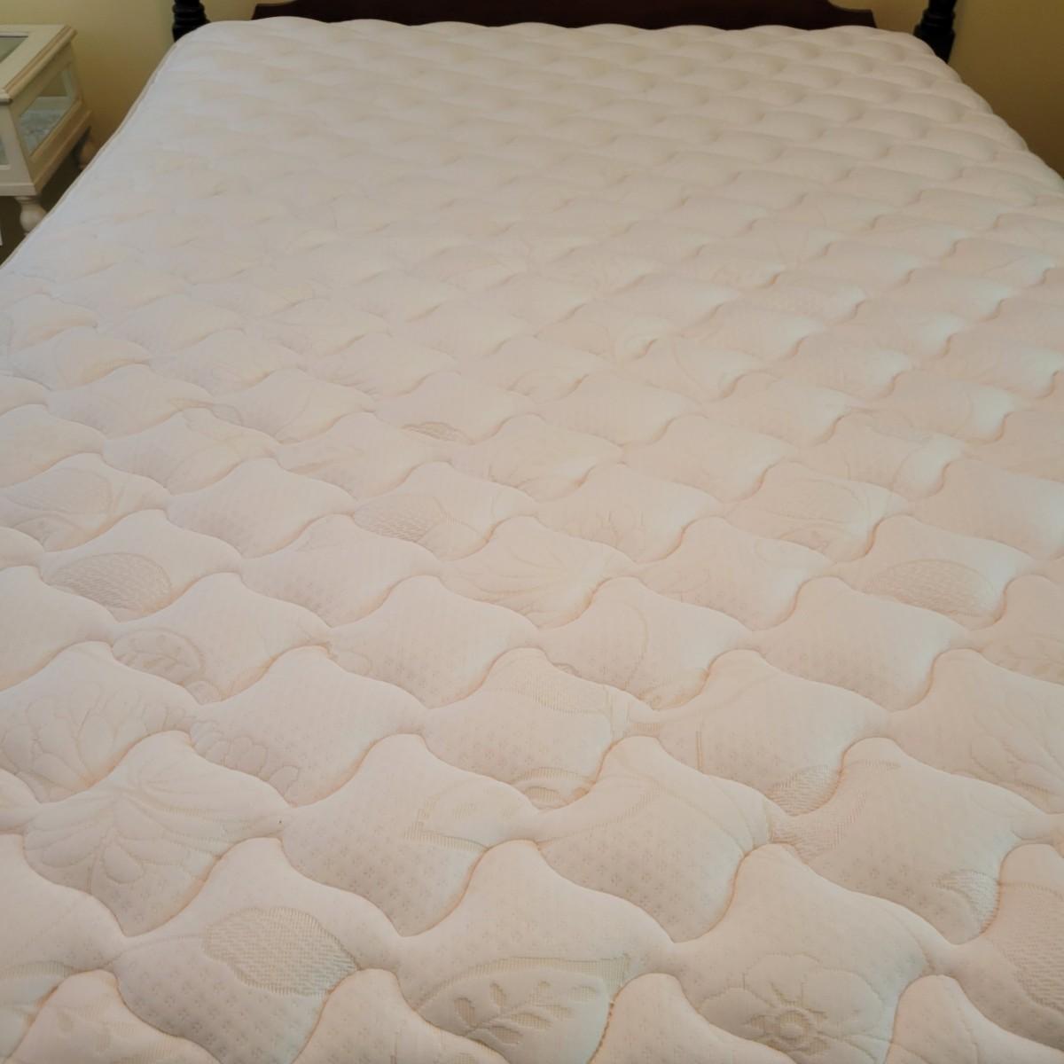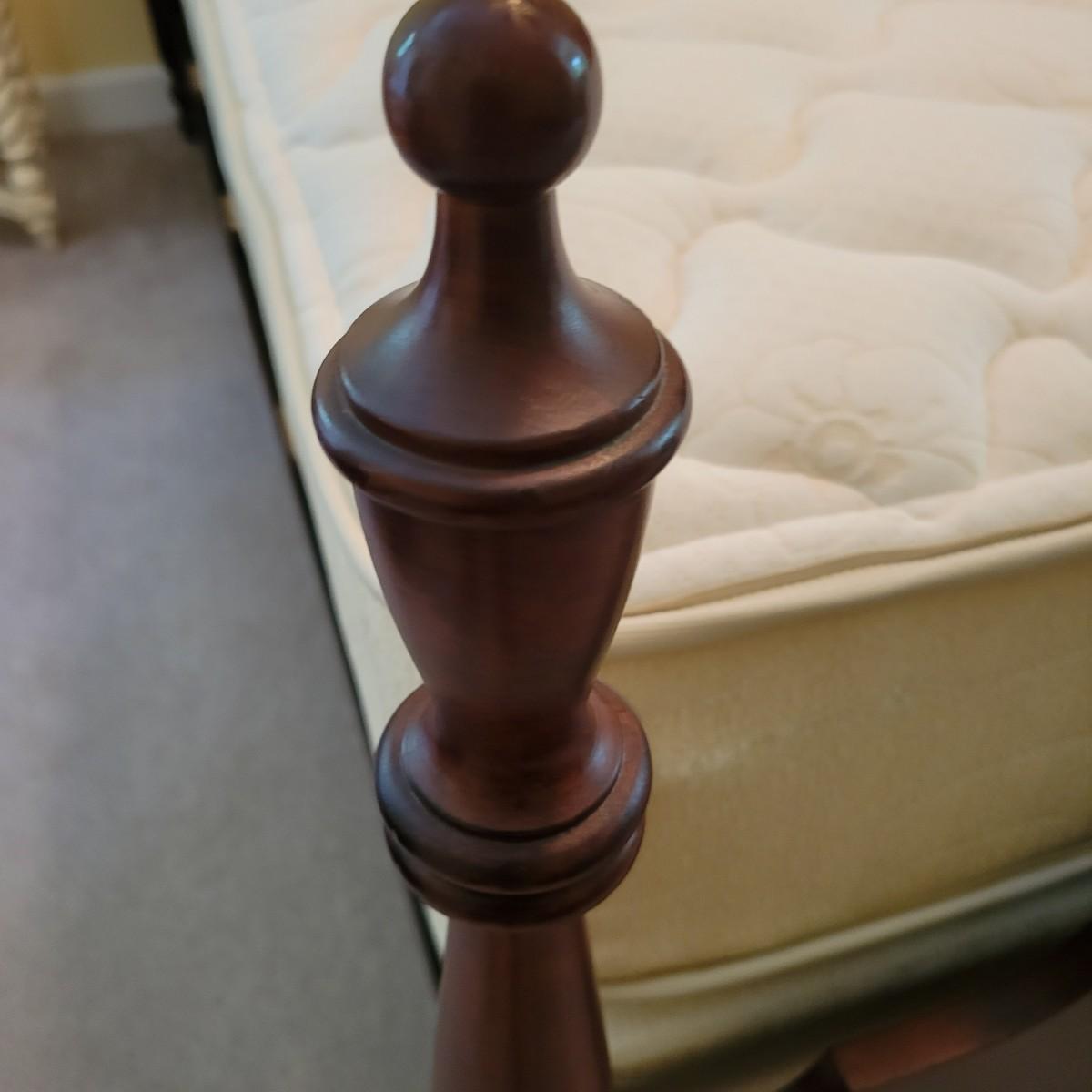 A full size bed frame, rails and slats. The bed frame is solid wood with a cherry finish and has caster. It measures approximately 58" x 81" x 45.5"H. The bed frame includes metal rails with wooden slats. The mattress is available to the winning bidder if desired, but the winning bidder is not required to take it. The mattress appears to have minimal use and no notable stains or odors. Local pickup only. Winning bidder must bring assistance to help move and load this item due to its weight and/or size.
