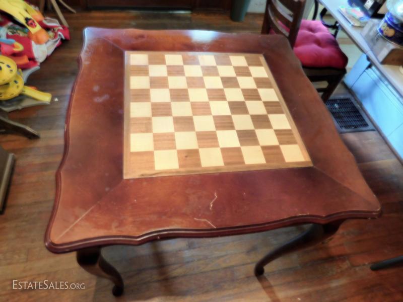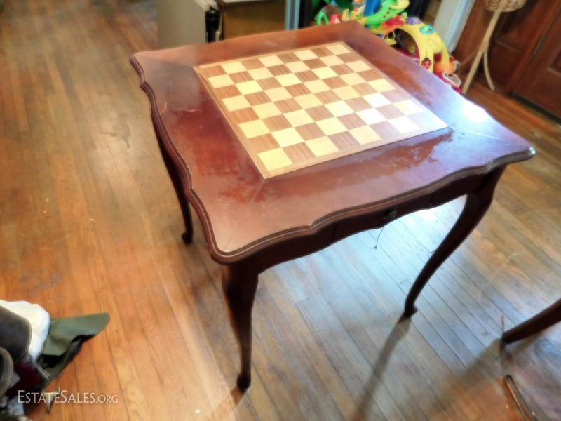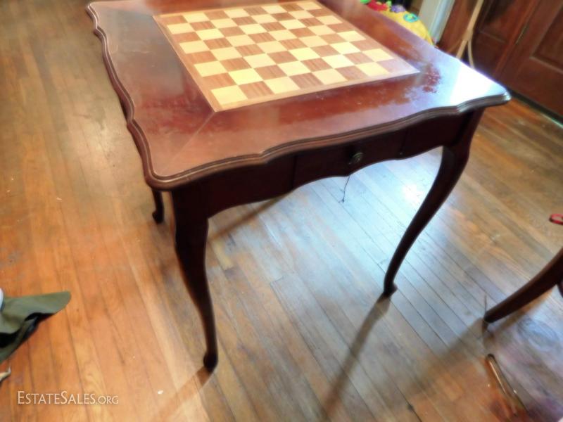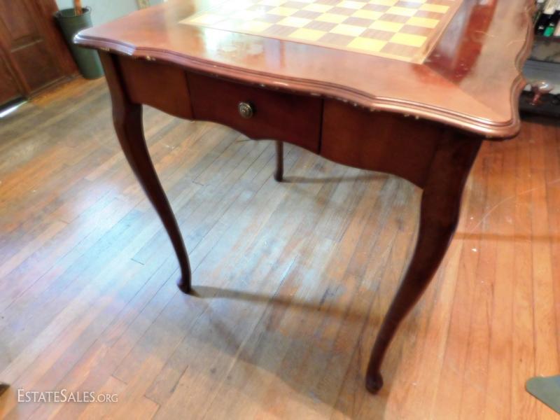 Cherry game table with two drawers for game pieces and cards storage. Top has some scratches and finish blemishes but not beyond repair and does not detract from the beauty of the table. Functional and sturdy.