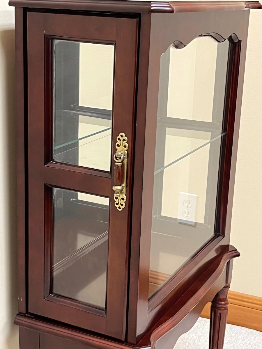 No brand name found ~ One glass shelf not adjustable ~ Doors open on both sides ~ 44” H x 25” W x 12” D