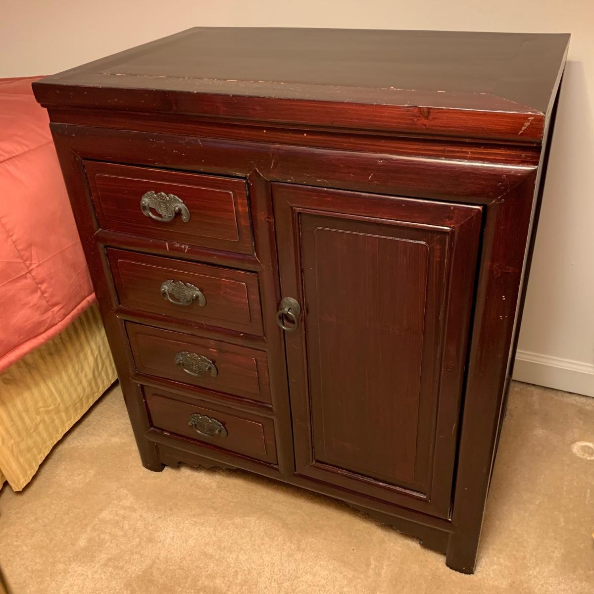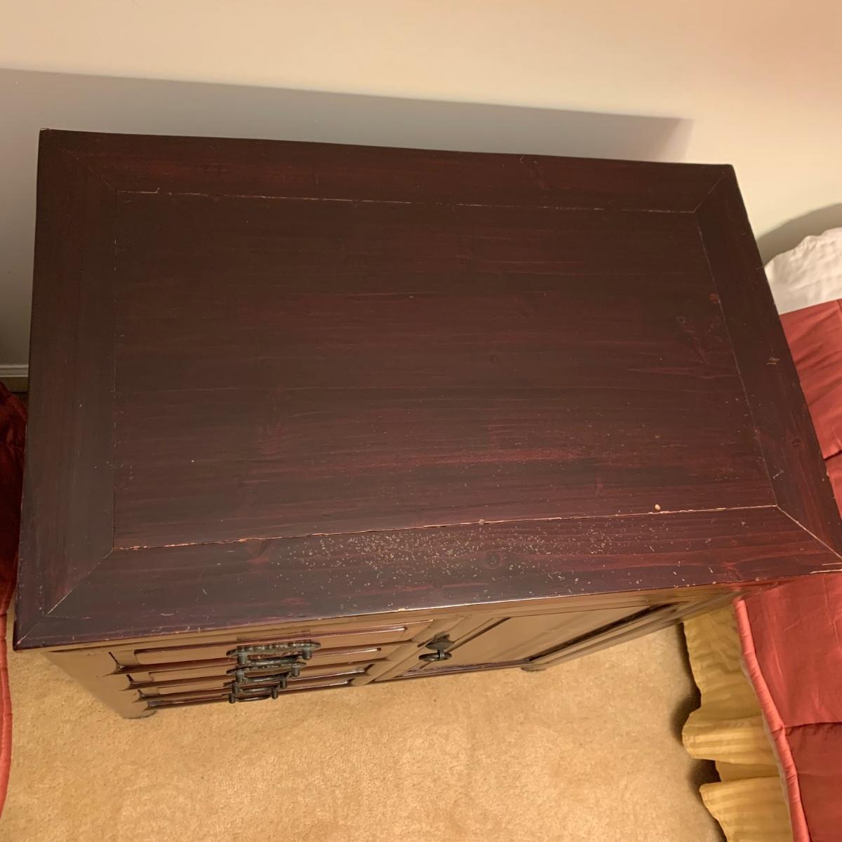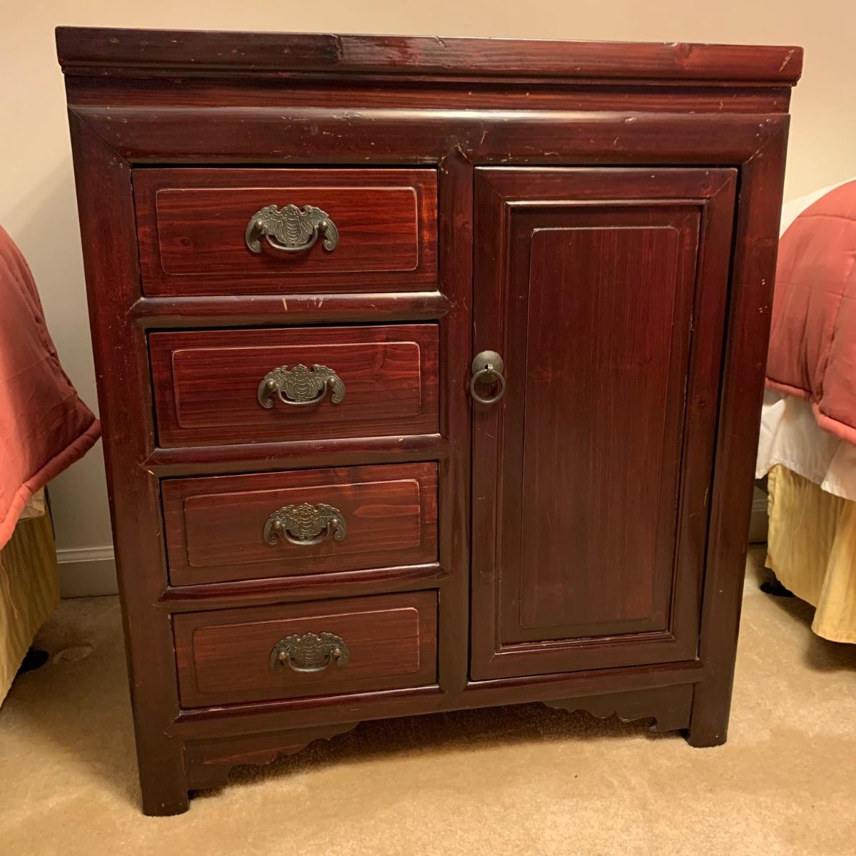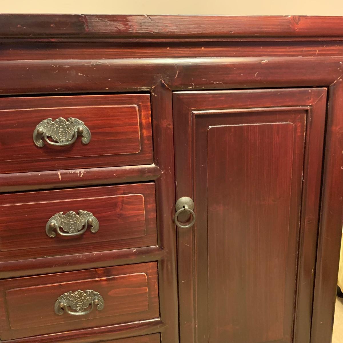 Solid wood chest of drawers with a dark Cherry finish. Chest features four drawers and a cabinet with two shelves. Shelf is removable. Drawers have unique metal pulls. Unit measures 27.5” x 17.75” x 32”H. There are some surface imperfections in the finish and a crack in the wood between the drawers and cabinet; see photos.