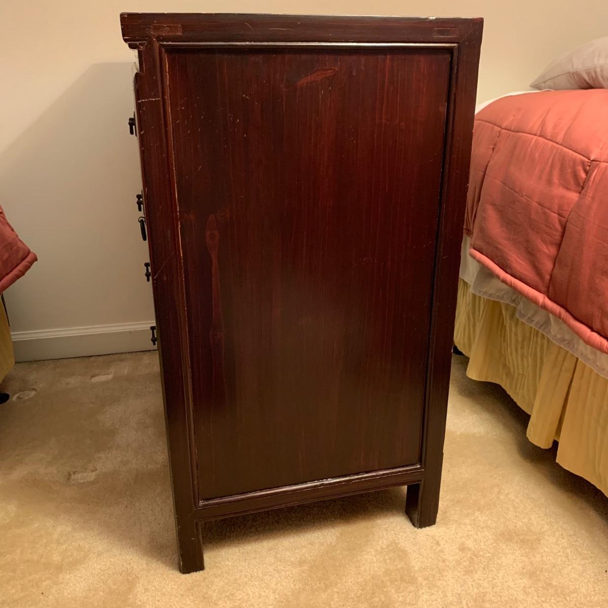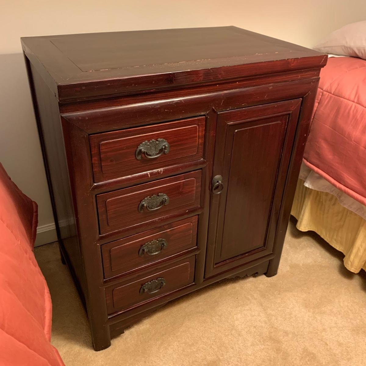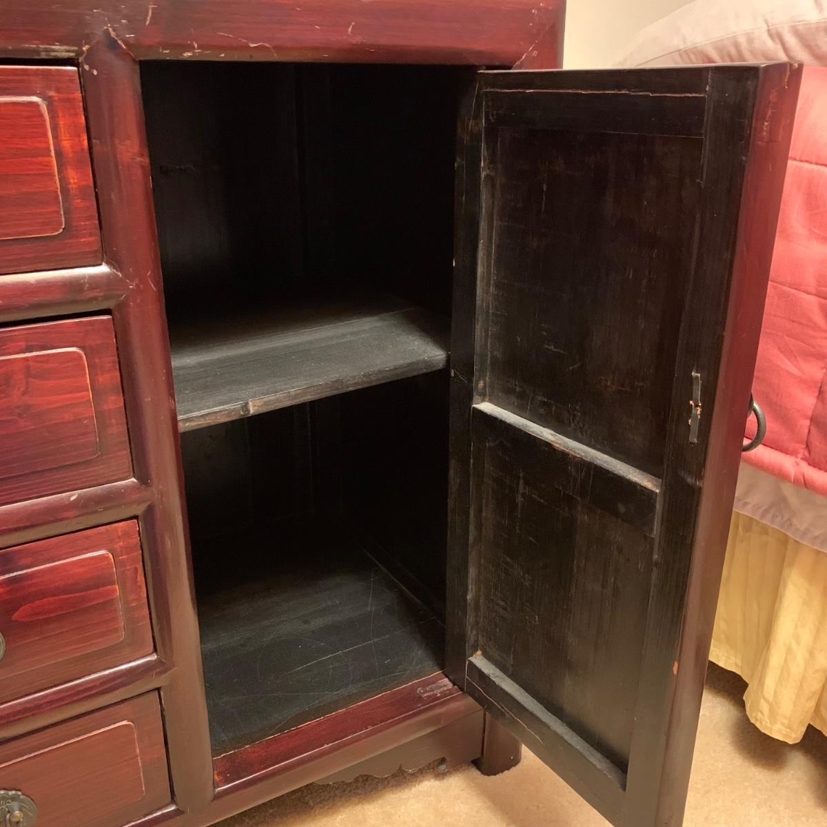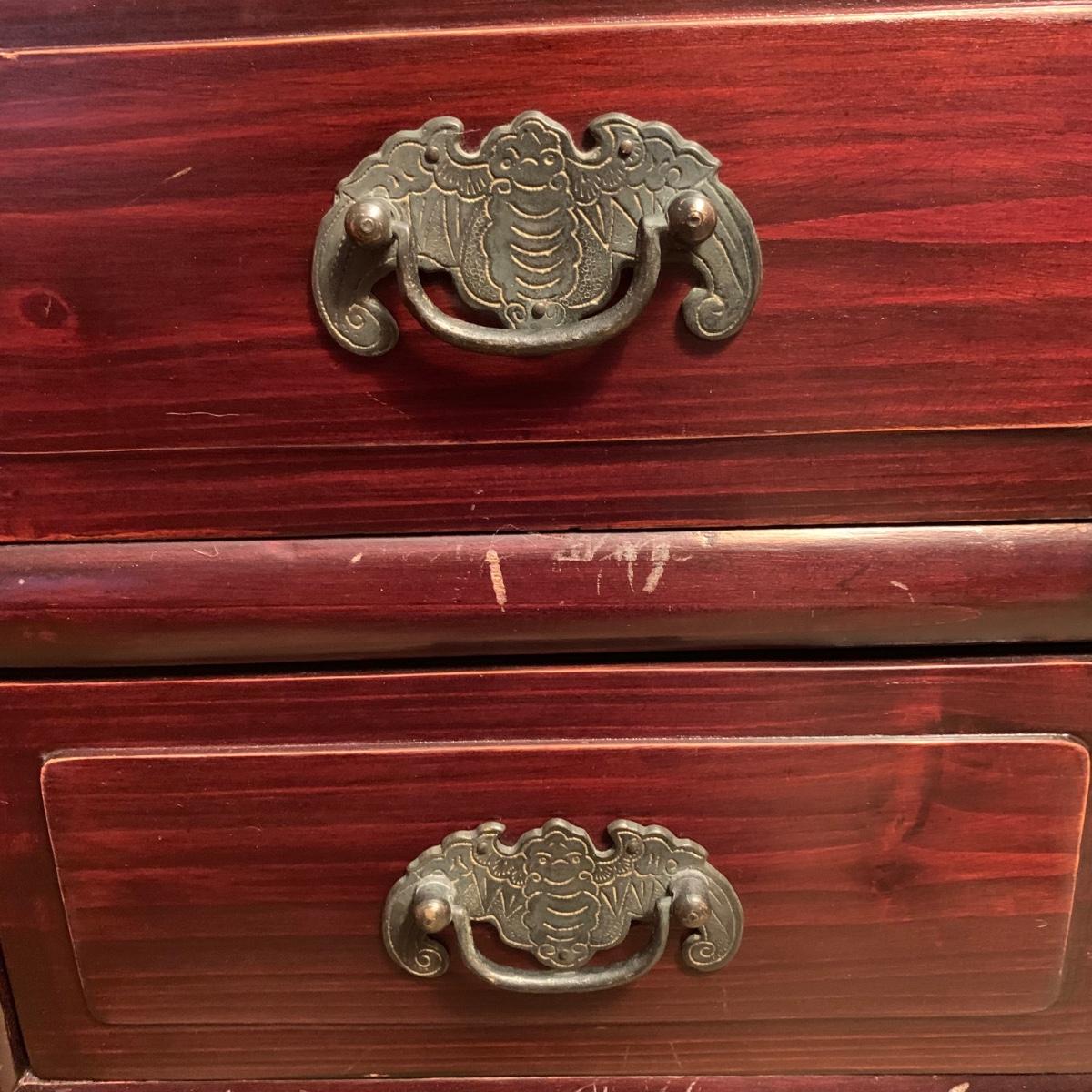 Solid wood chest of drawers with a dark Cherry finish. Chest features four drawers and a cabinet with two shelves. Shelf is removable. Drawers have unique metal pulls. Unit measures 27.5” x 17.75” x 32”H. There are some surface imperfections in the finish and a crack in the wood between the drawers and cabinet; see photos.
