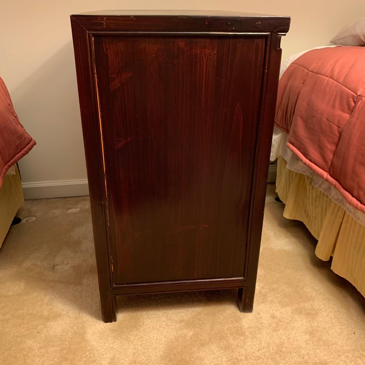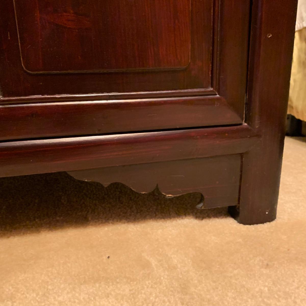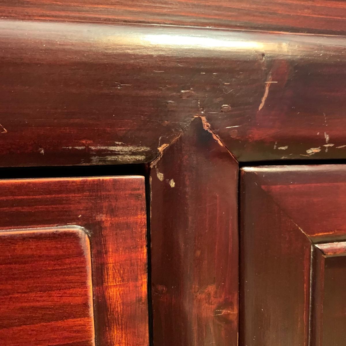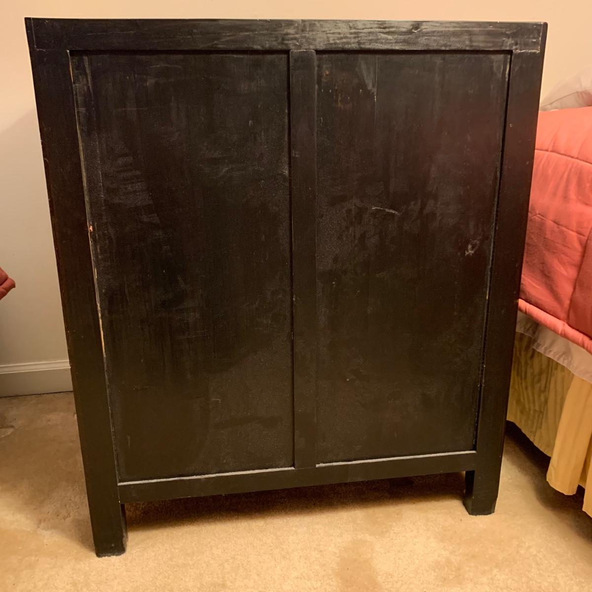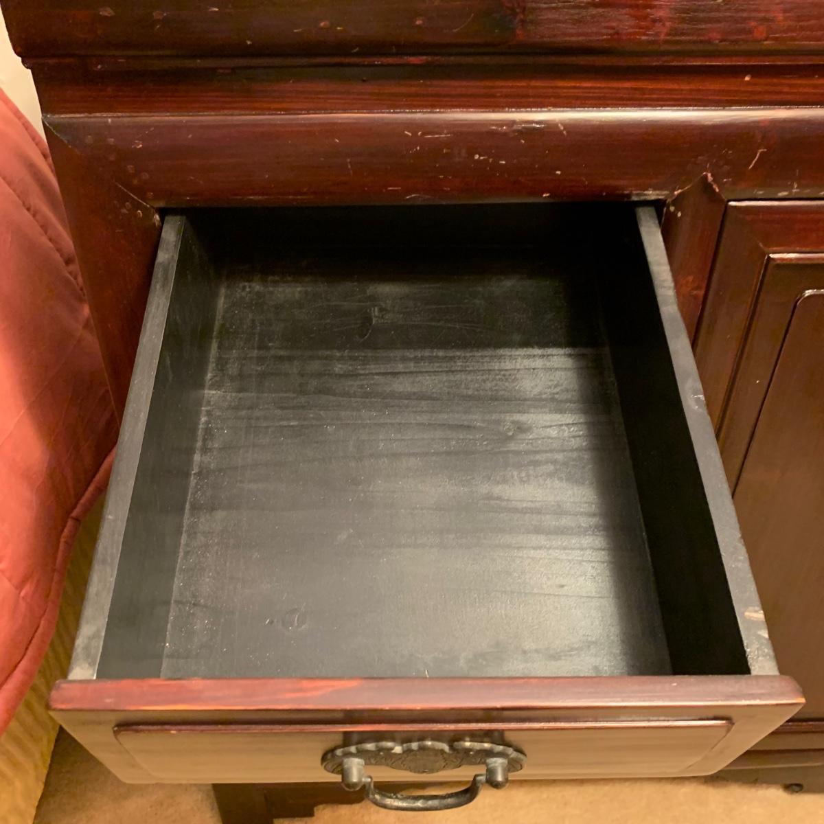 Solid wood chest of drawers with a dark Cherry finish. Chest features four drawers and a cabinet with two shelves. Shelf is removable. Drawers have unique metal pulls. Unit measures 27.5” x 17.75” x 32”H. There are some surface imperfections in the finish and a crack in the wood between the drawers and cabinet; see photos.