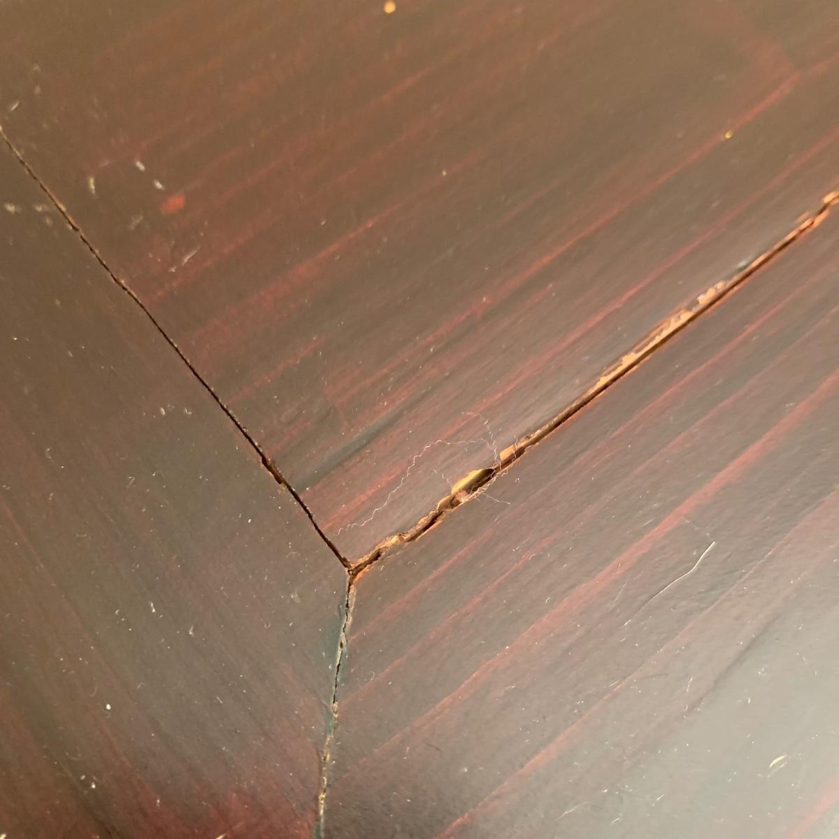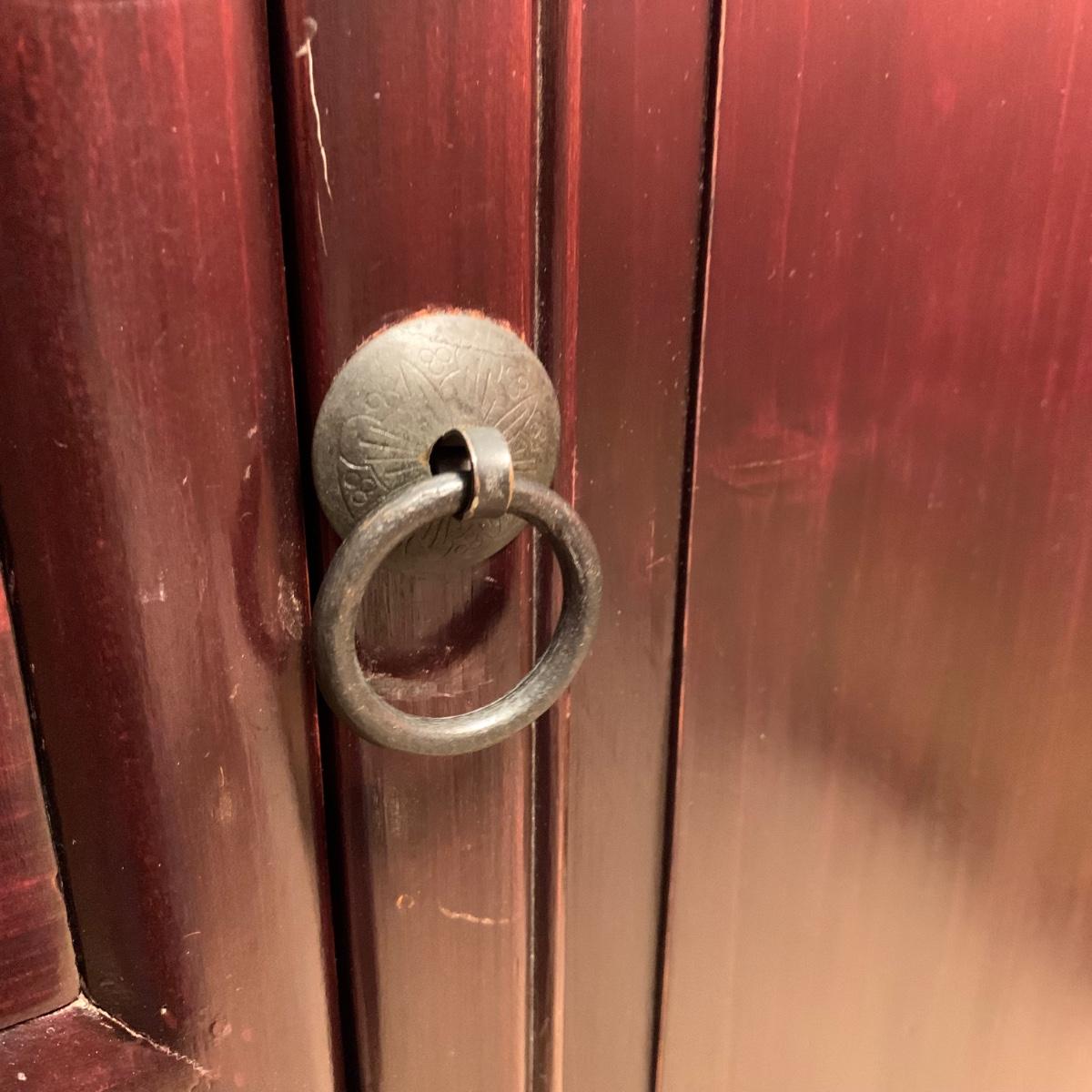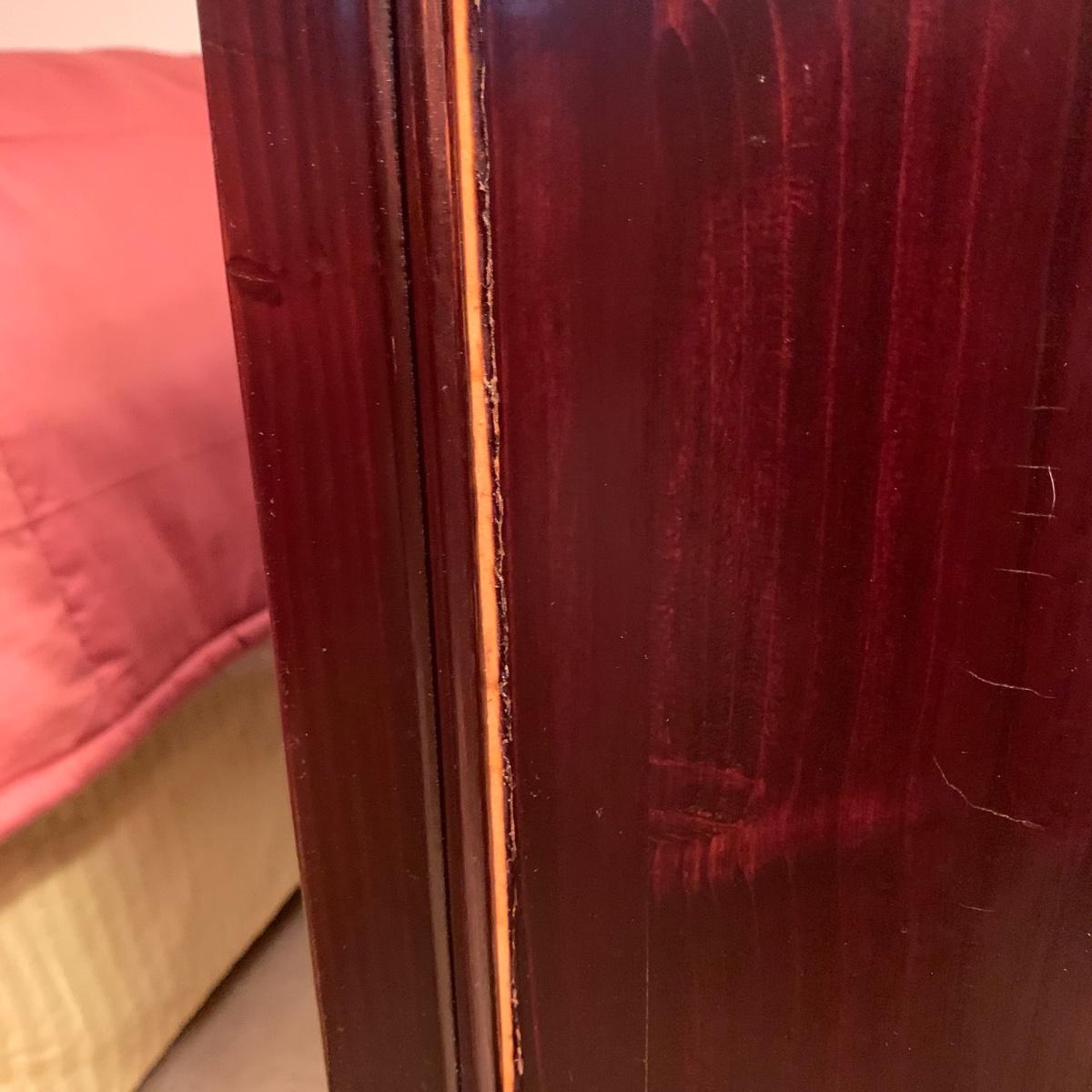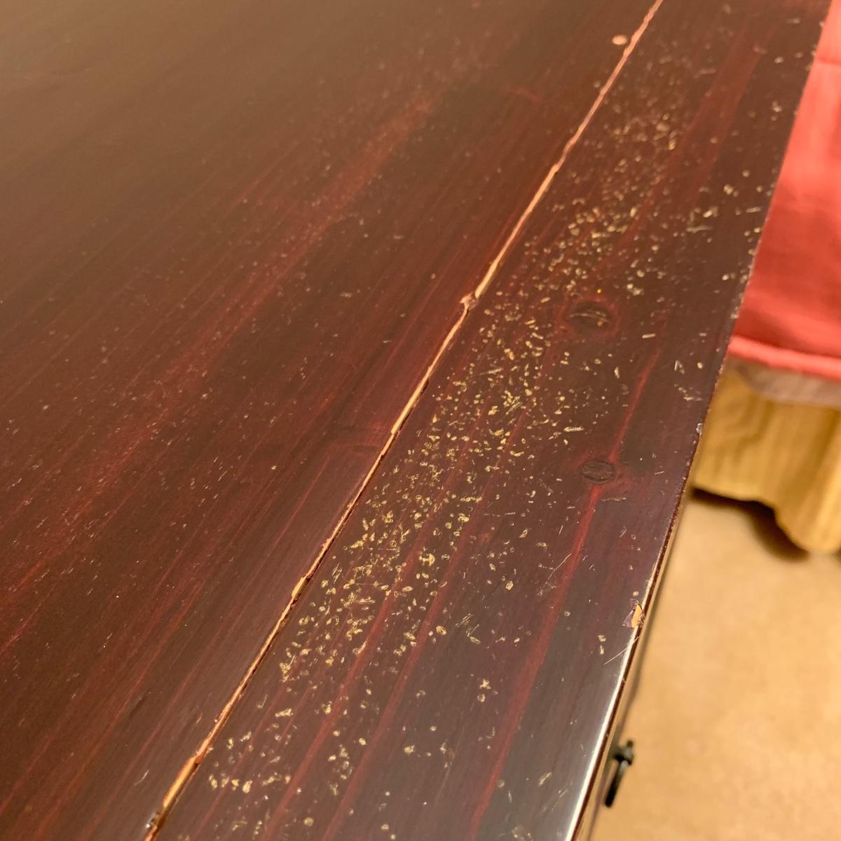 Solid wood chest of drawers with a dark Cherry finish. Chest features four drawers and a cabinet with two shelves. Shelf is removable. Drawers have unique metal pulls. Unit measures 27.5” x 17.75” x 32”H. There are some surface imperfections in the finish and a crack in the wood between the drawers and cabinet; see photos.
