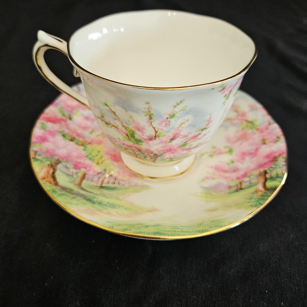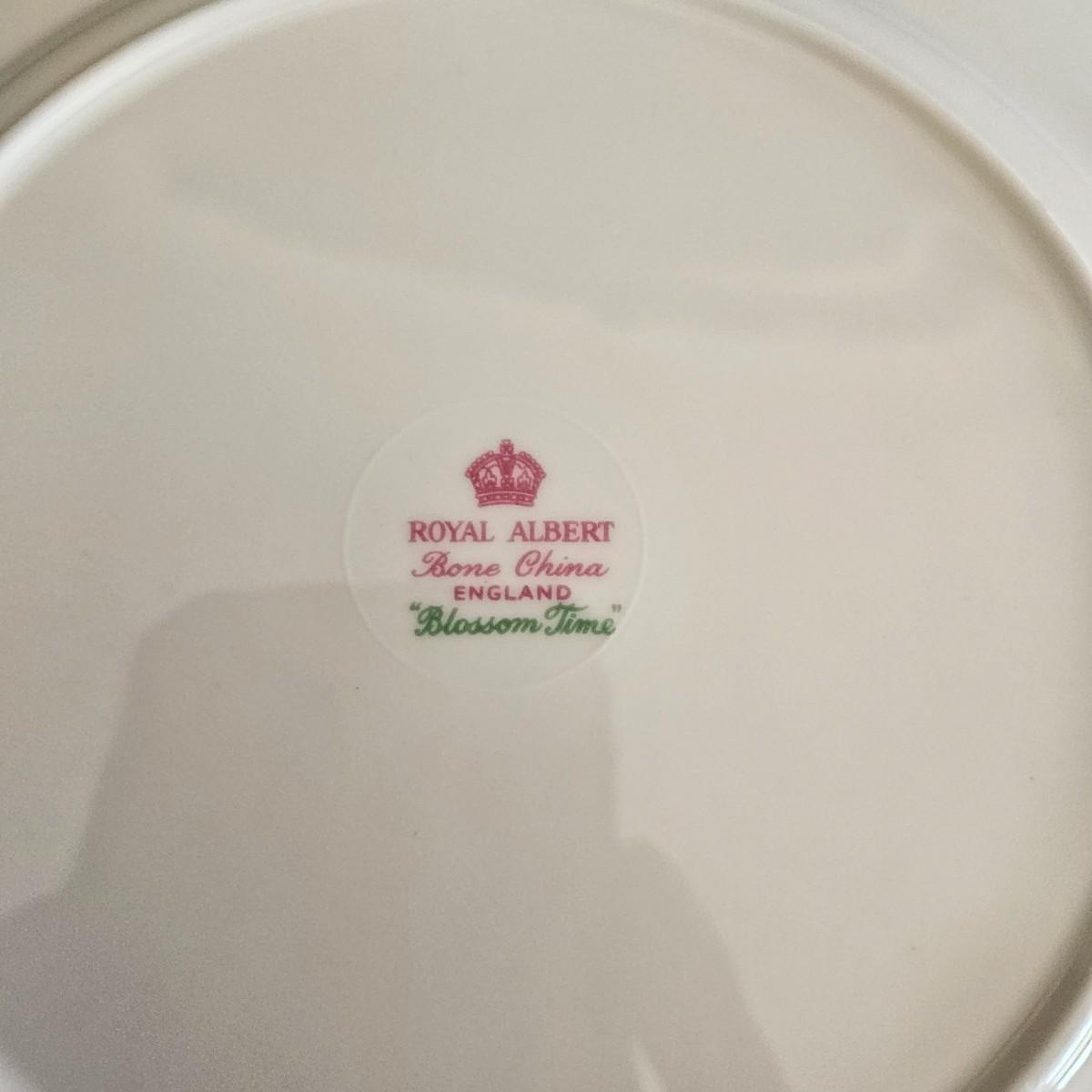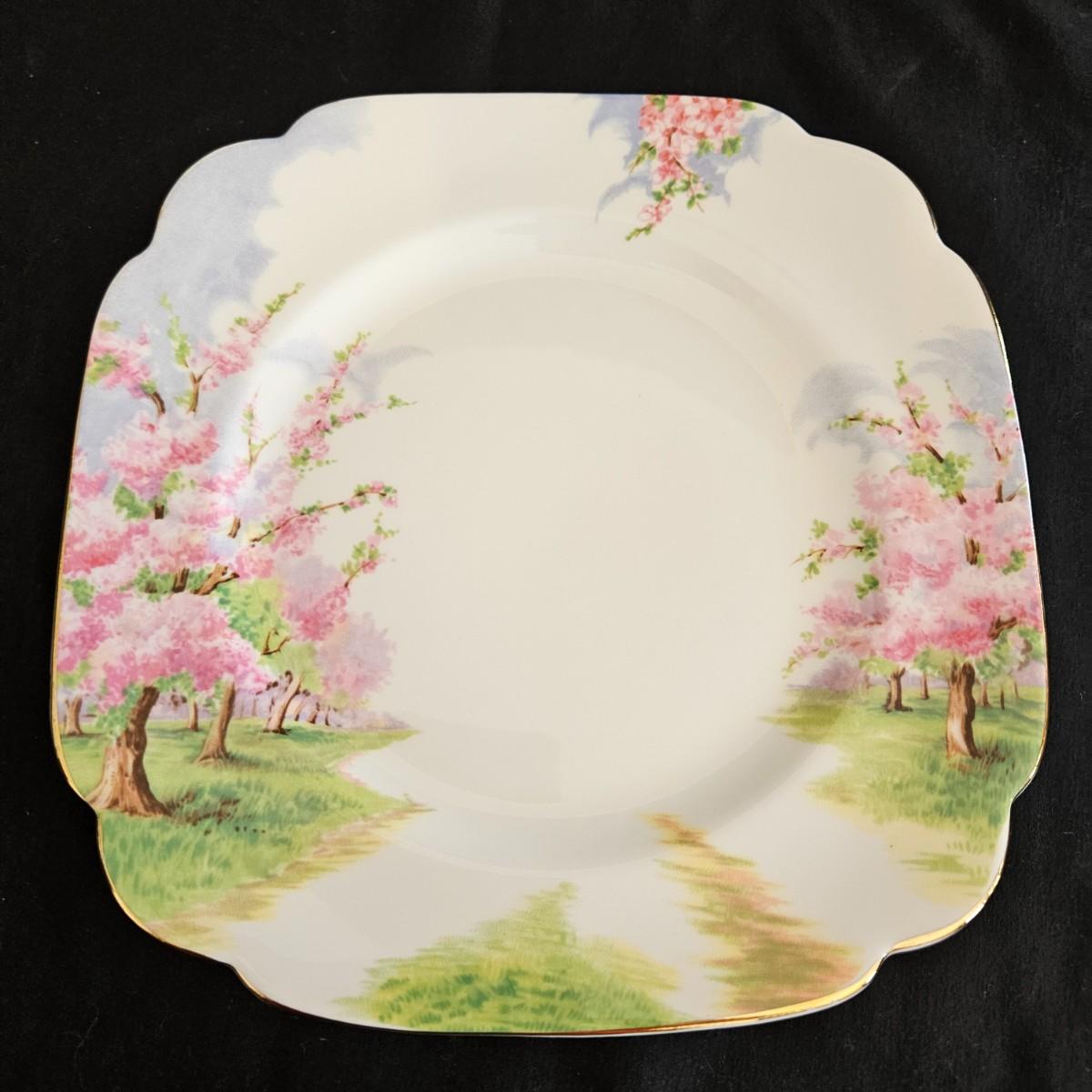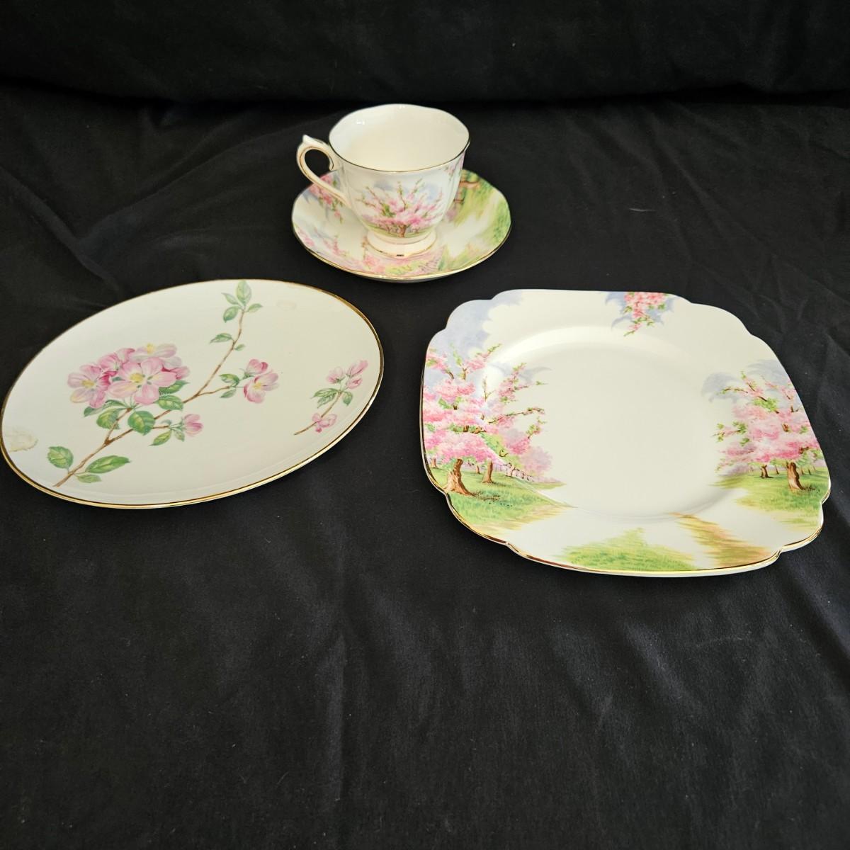 A collection (four pieces) of China with a cherry tree motif manufactured by Royal Albert and Johann Haviland. The square plate measures approximately 8" x 8". Shipping available