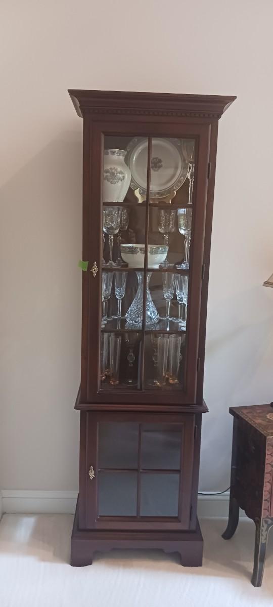 23" wide, 13 1/2" deep, 6' tall, base width 21 1/2" . Interior lighting on the top and bottom of the cabinet. Shelves are removable but not adjustable. Contents not included.