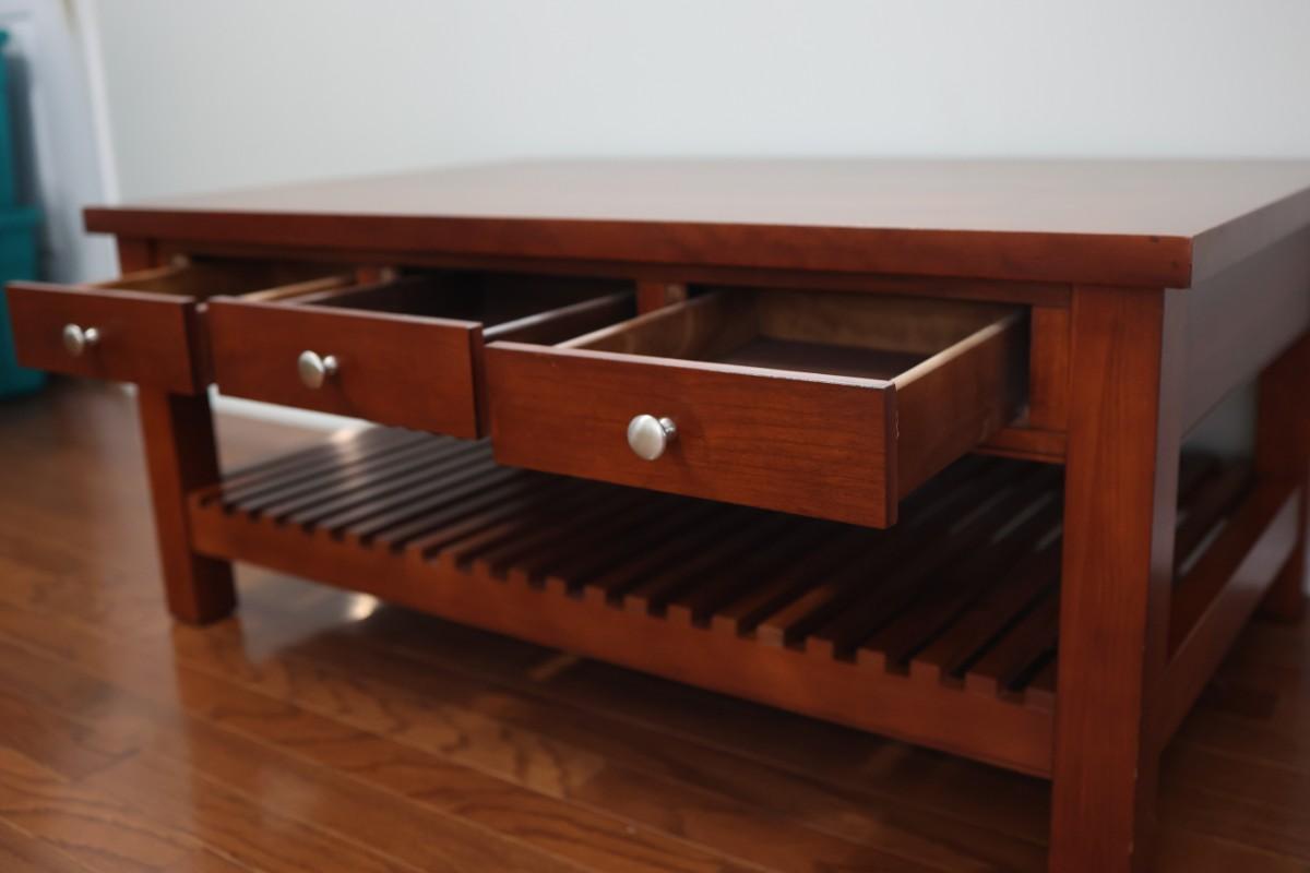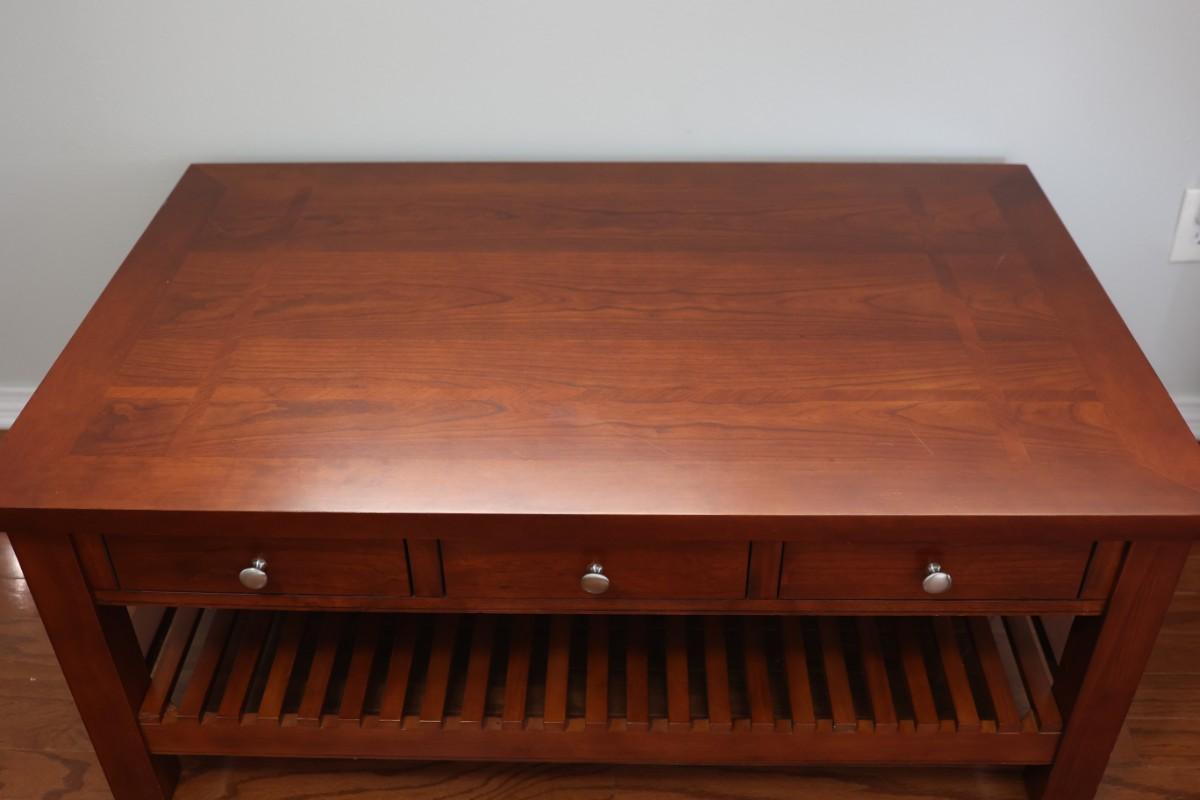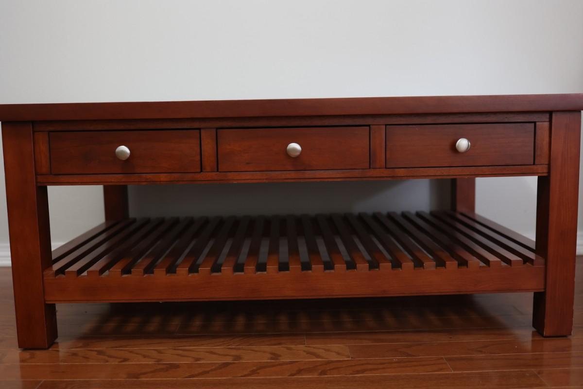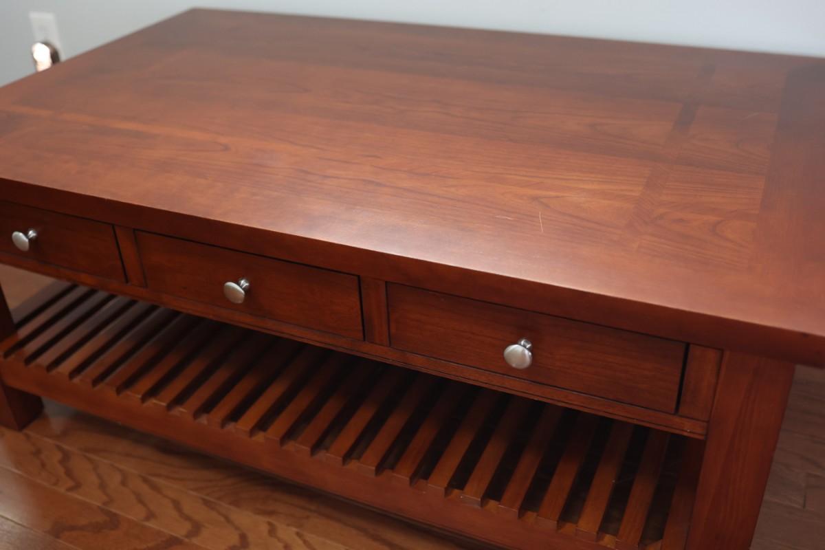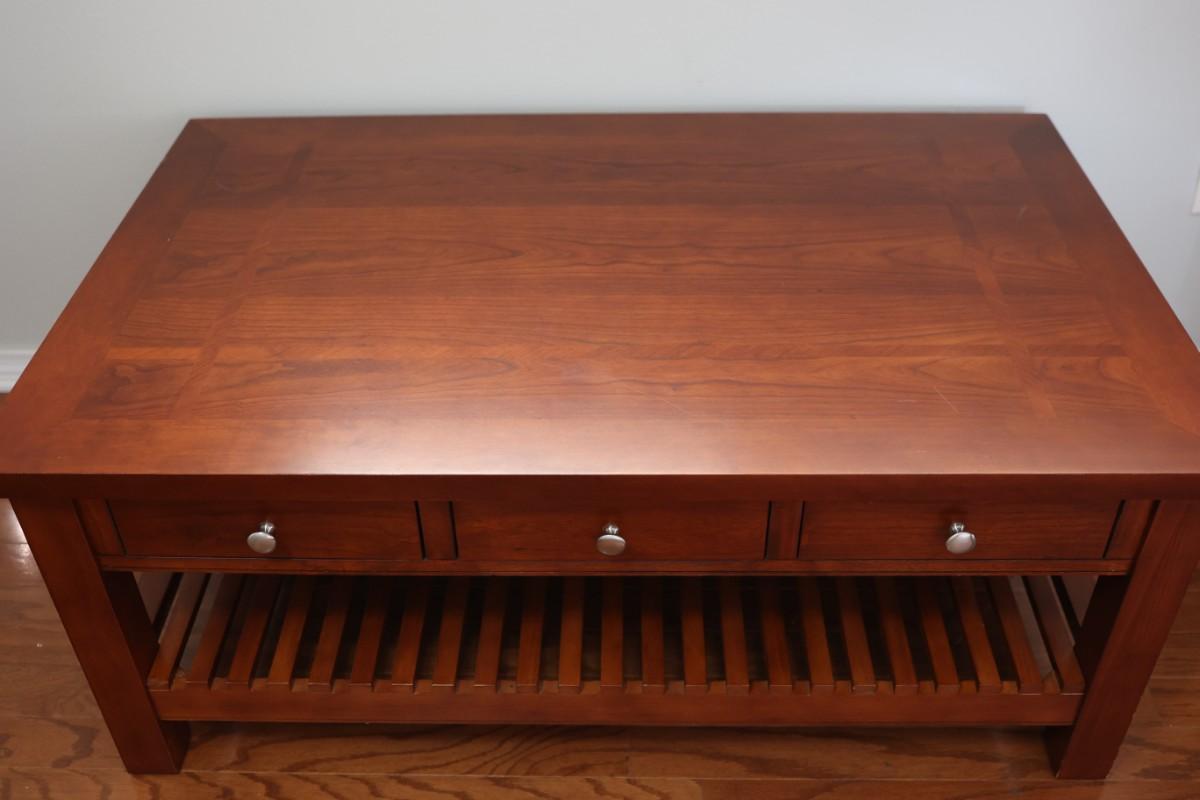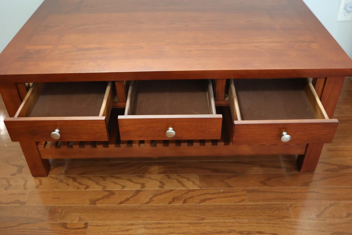 Solid cherry wood coffee table with 3 drawers on either side. Six drawers total.