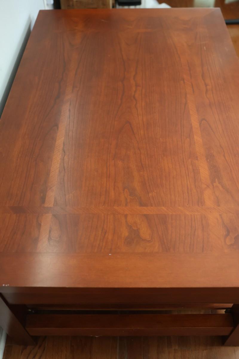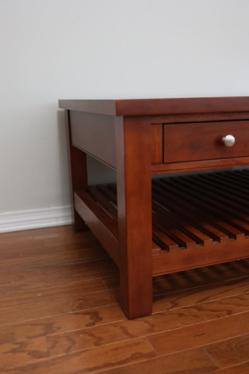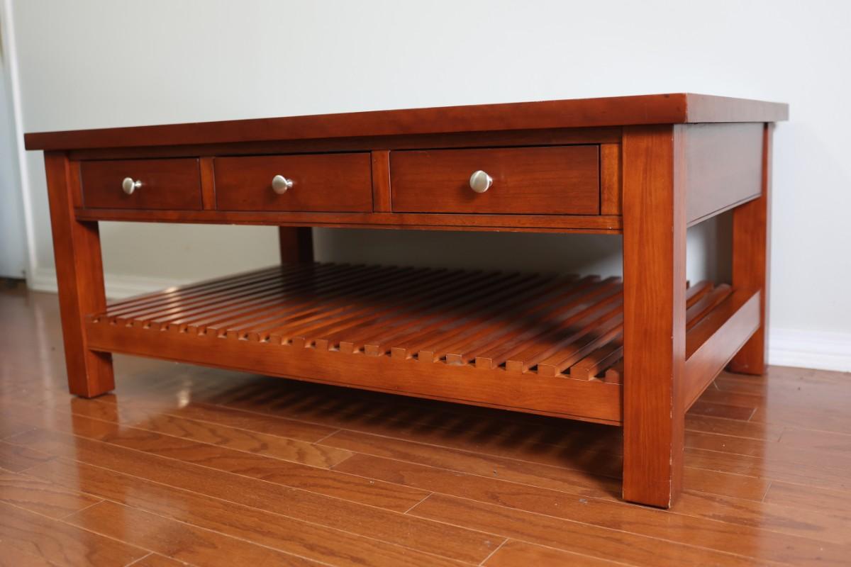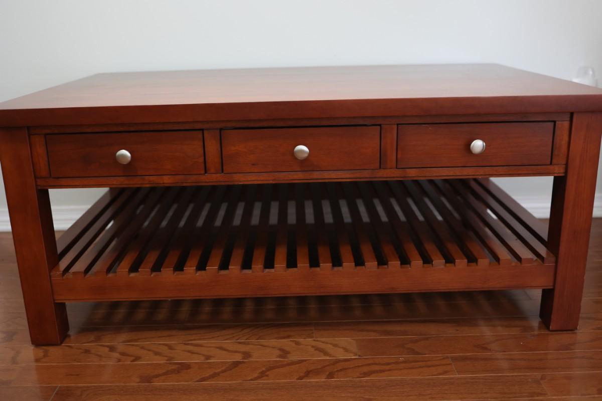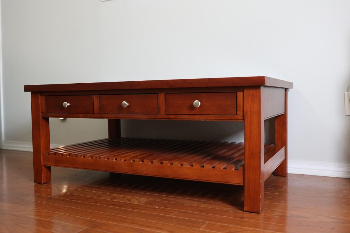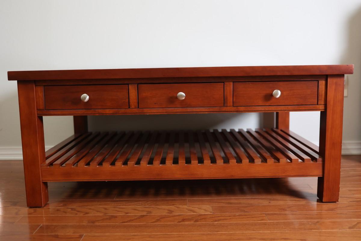 Solid cherry wood coffee table with 3 drawers on either side. Six drawers total.