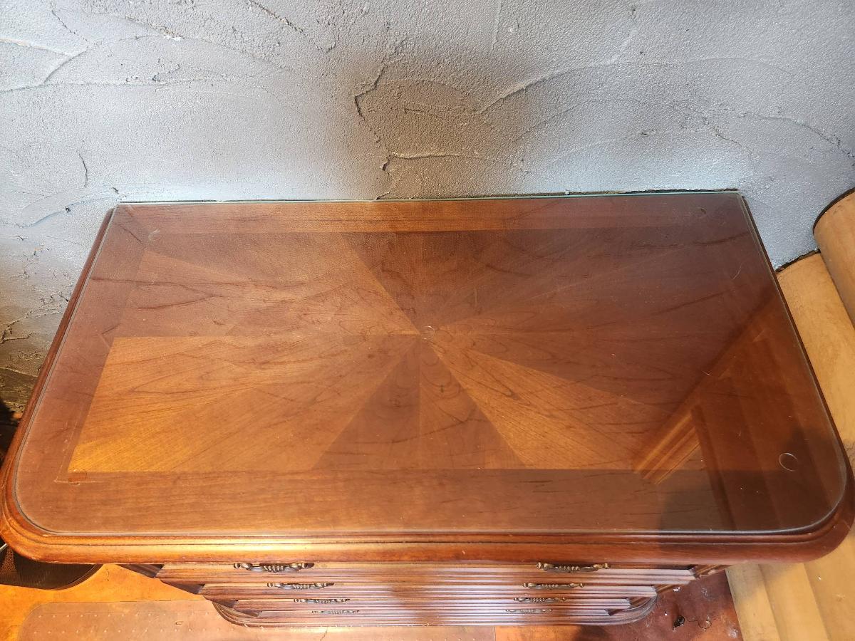 Cherry wood credenza featuring dimensions of 3.5 x 1.9 x 2.6. Includes four spacious drawers with decorative metal handles. The credenza showcases intricate carving details along its edges, a polished finish, and a rectangular top. Designed with functionality and aesthetic appeal in mind.