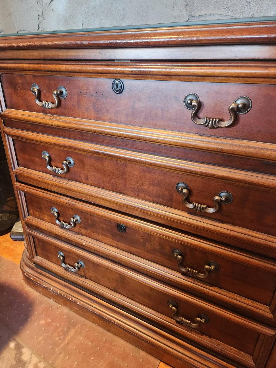 Cherry wood credenza featuring dimensions of 3.5 x 1.9 x 2.6. Includes four spacious drawers with decorative metal handles. The credenza showcases intricate carving details along its edges, a polished finish, and a rectangular top. Designed with functionality and aesthetic appeal in mind.