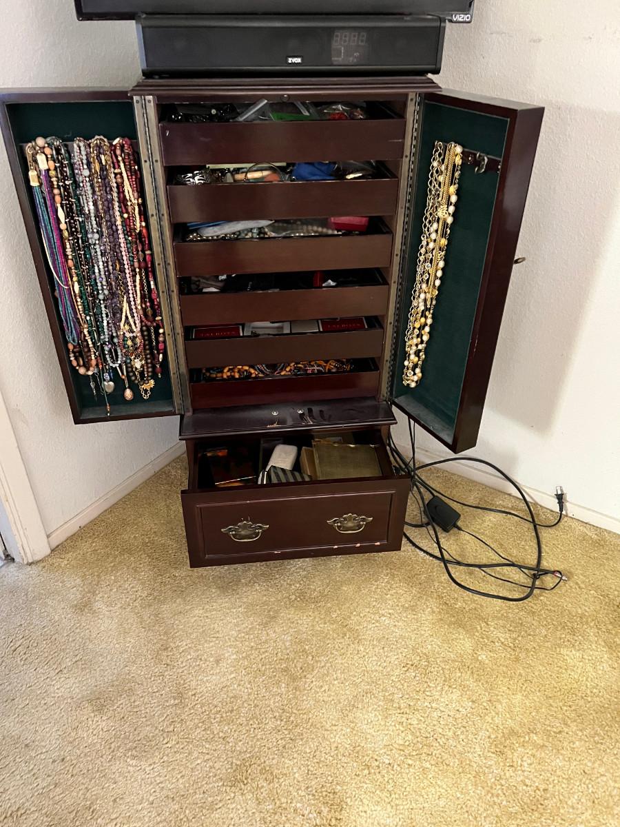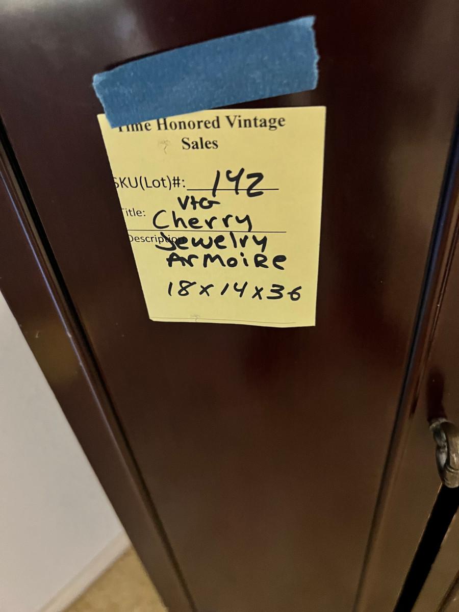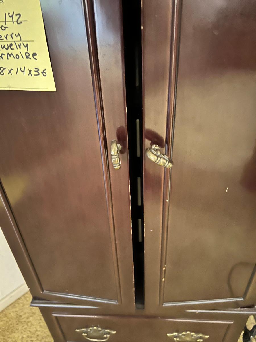 18 X 14 X 36 Cherry Wood Jewelry armoire cabinet. Opens to store a massive amount of jewelry, and the drawers are velvet lined. Some wear to finish a great piece to repaint, 2 of the necklace hooks have fallen off, but are in the drawer