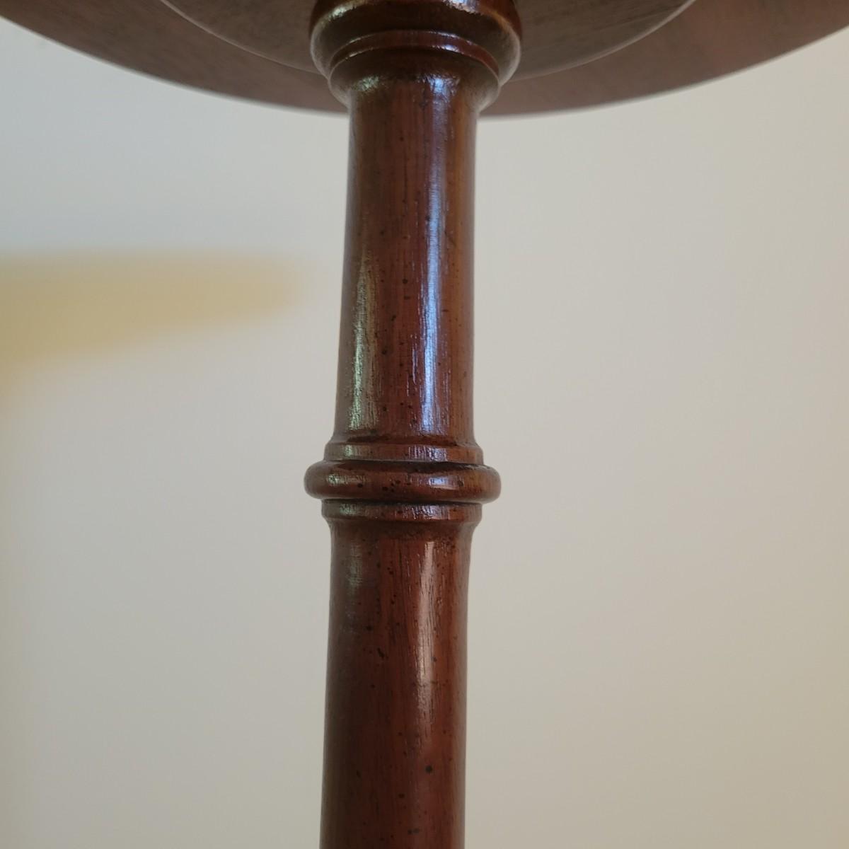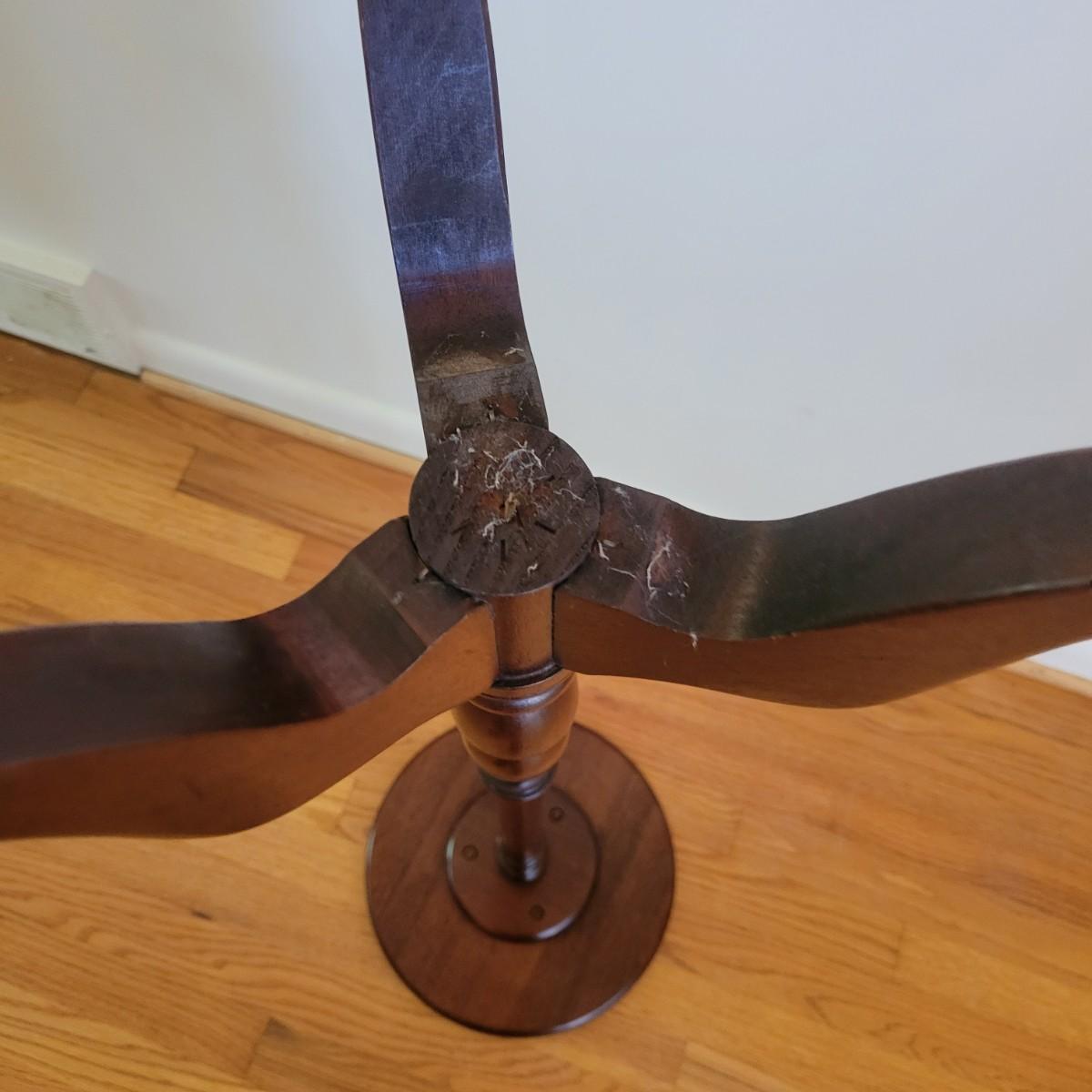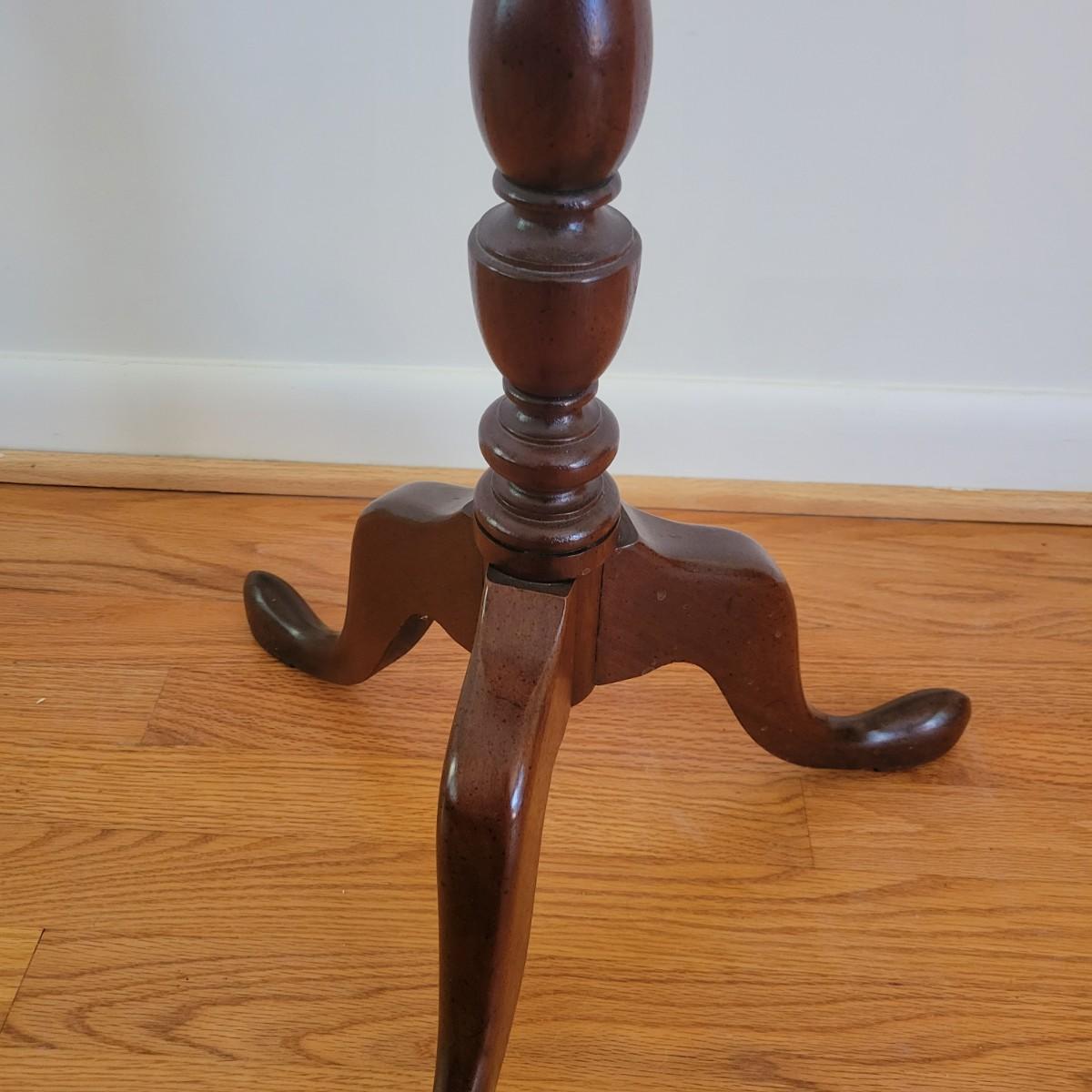 A cherry colored wooden plant stand in excellent condition. This stand has three feet and a decorative lathed body. Measures approximately 17"d x 41"h. Local pickup only