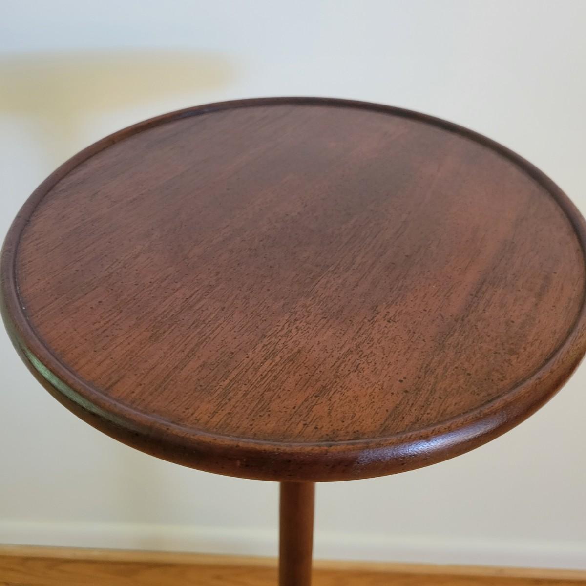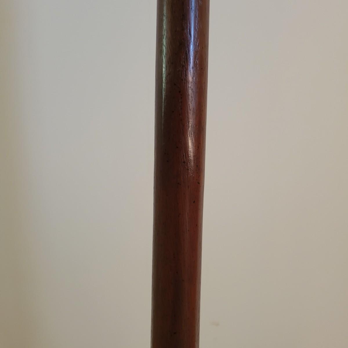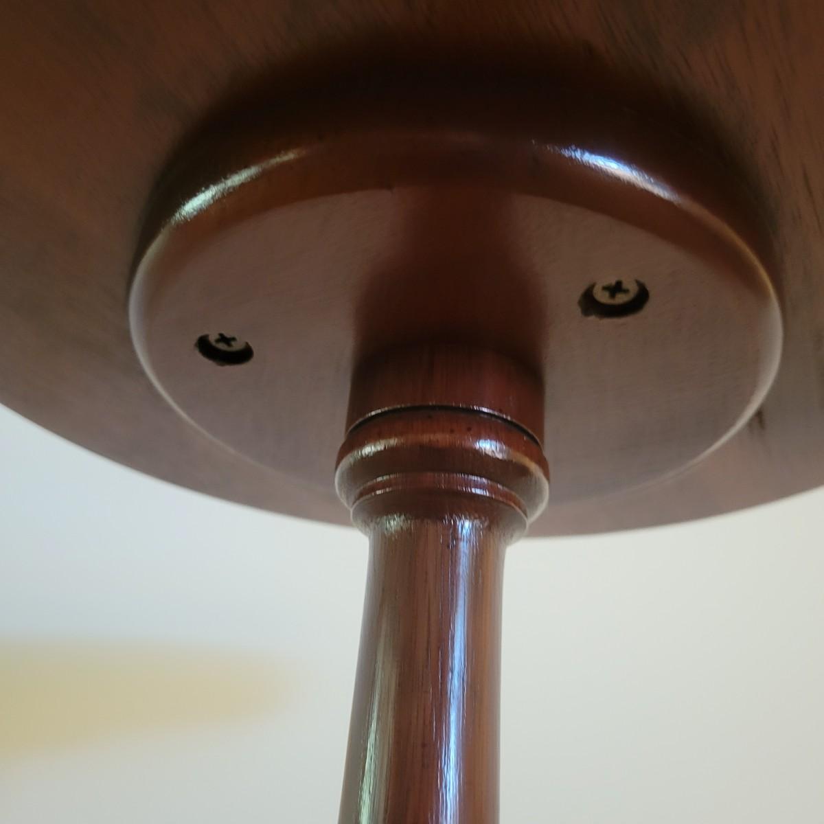 A cherry colored wooden plant stand in excellent condition. This stand has three feet and a decorative lathed body. Measures approximately 17"d x 41"h. Local pickup only