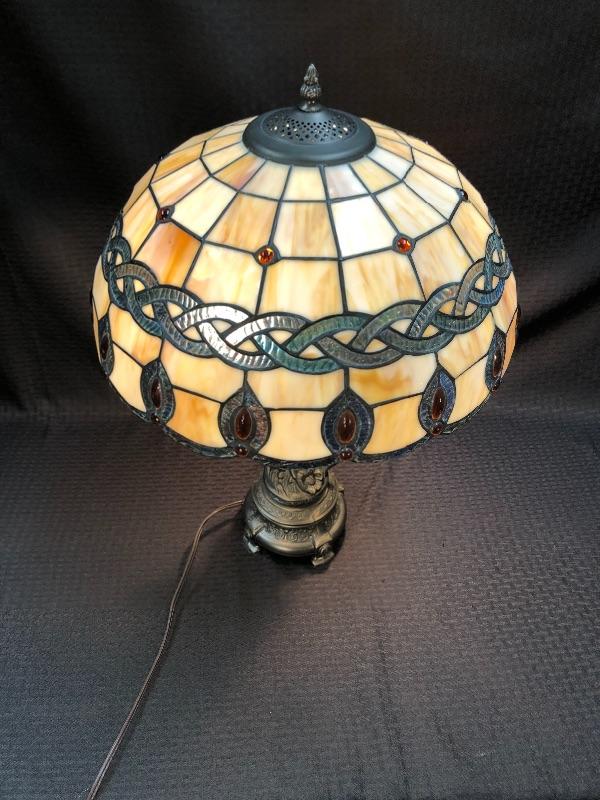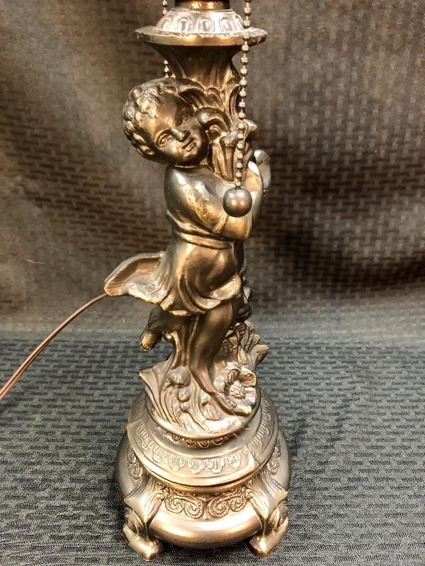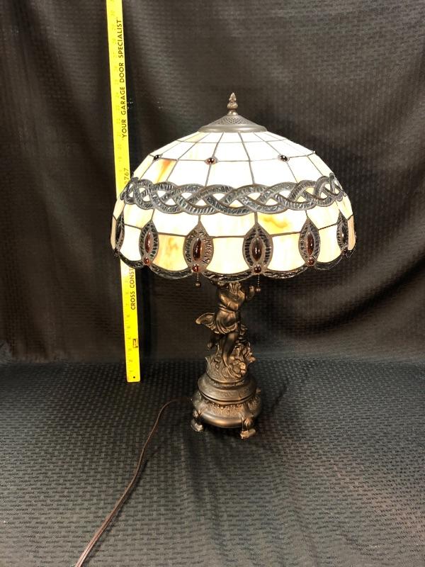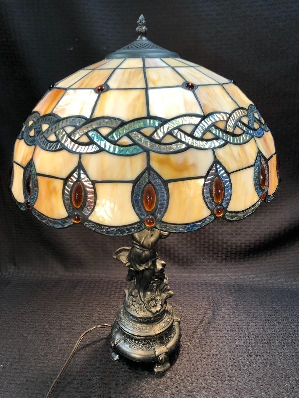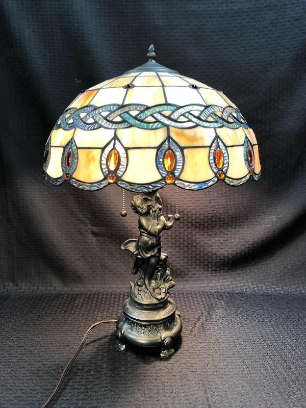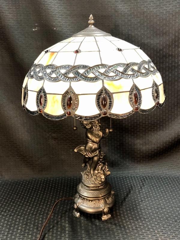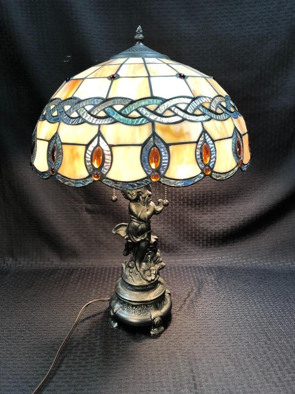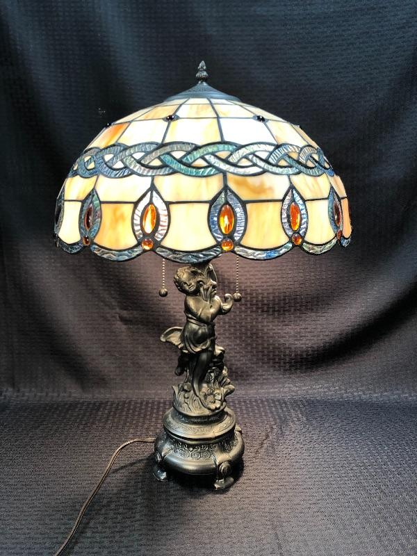 Stained glass table lamp with a cherub lamp base. Amber slag glass with a braided design shade. Dark brass bronze metal. Double bulb lamp. Chain pull on/off at the bulb. Cherub adds a little whimsy to the lamp. Lamp stands about 24" with shade.