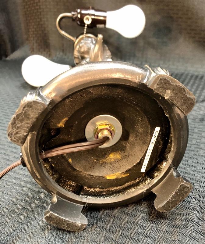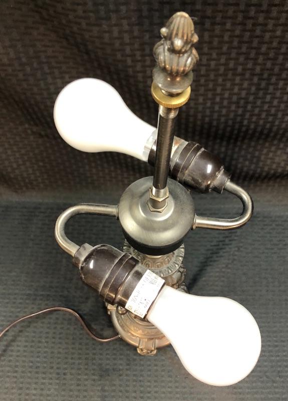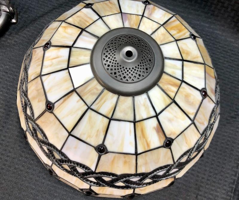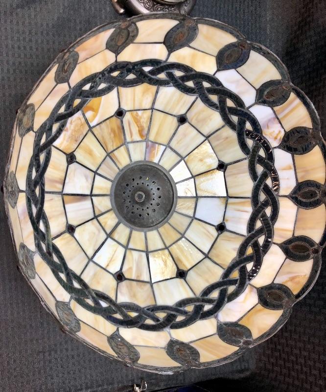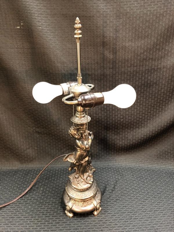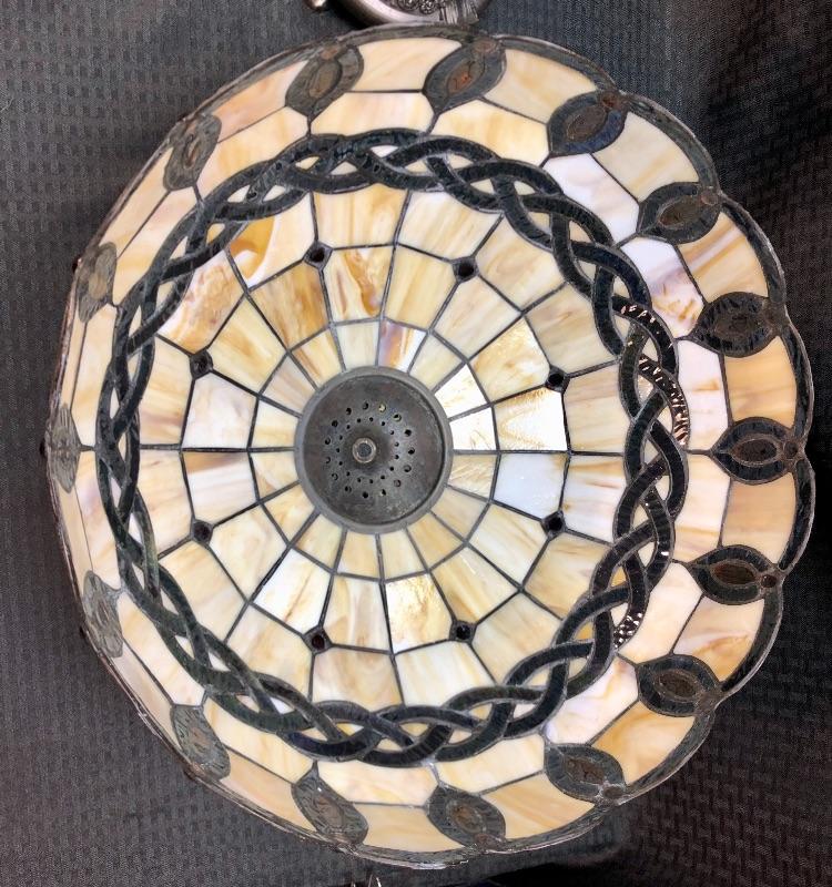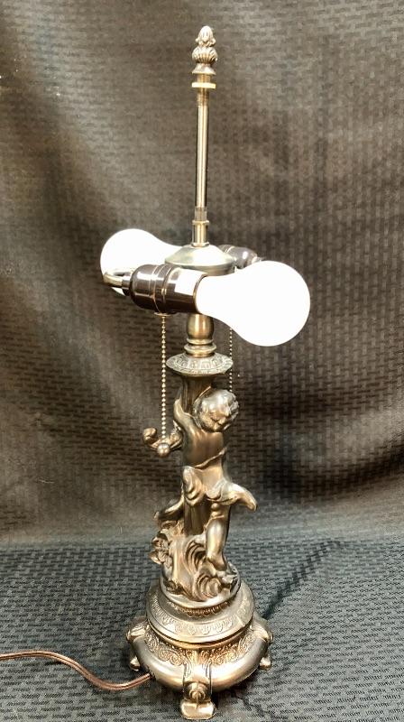 Stained glass table lamp with a cherub lamp base. Amber slag glass with a braided design shade. Dark brass bronze metal. Double bulb lamp. Chain pull on/off at the bulb. Cherub adds a little whimsy to the lamp. Lamp stands about 24" with shade.