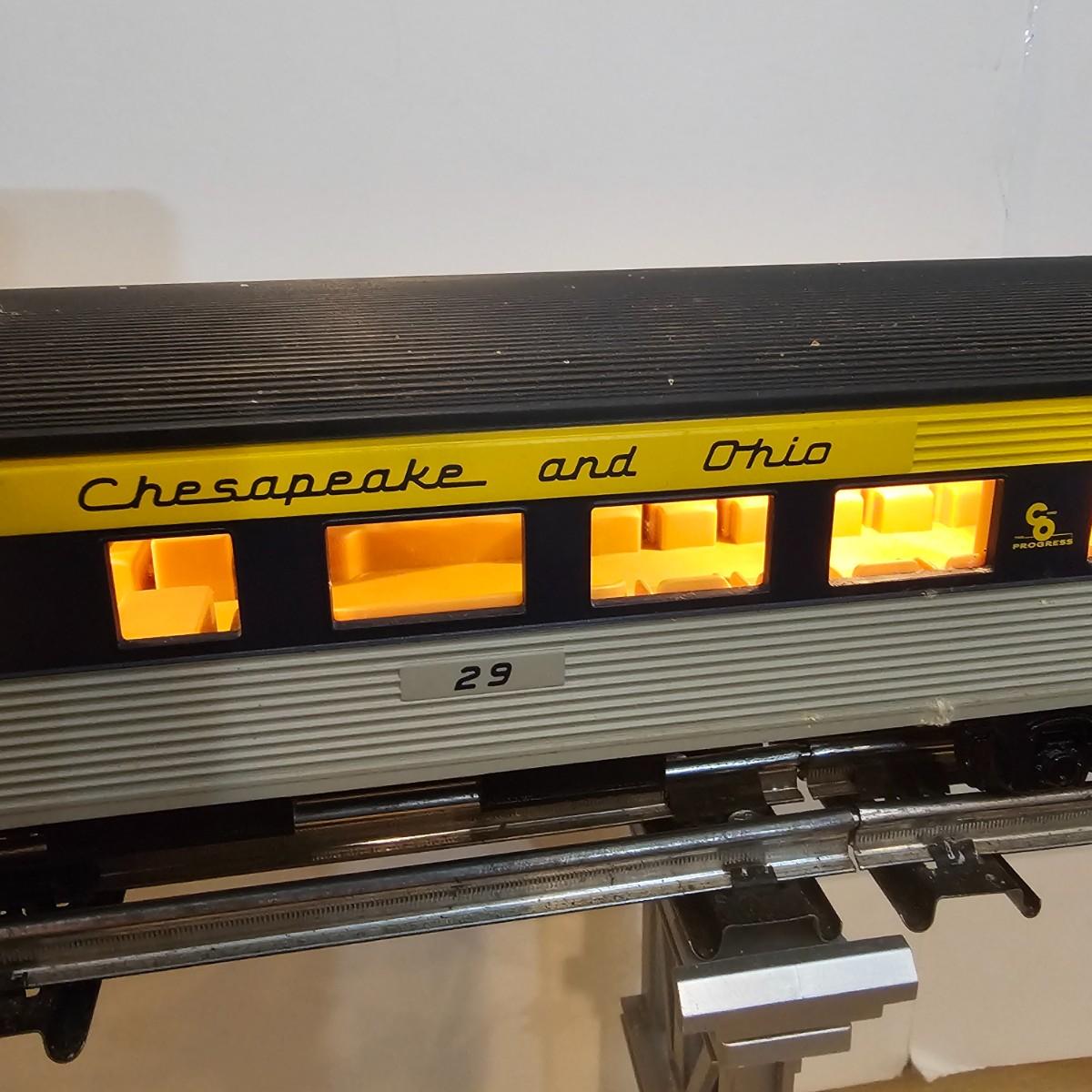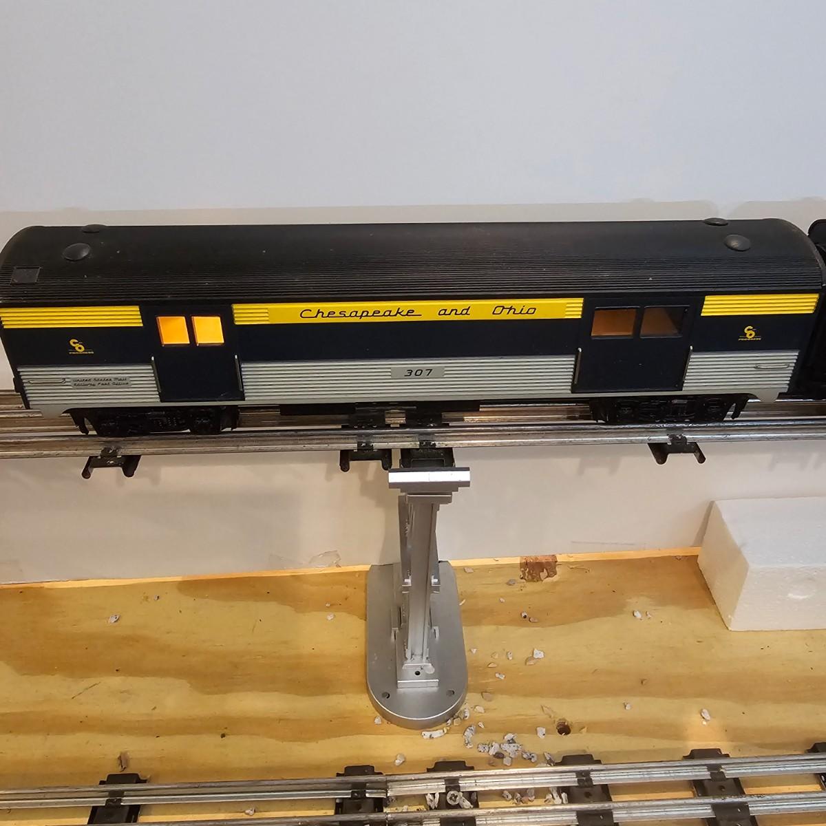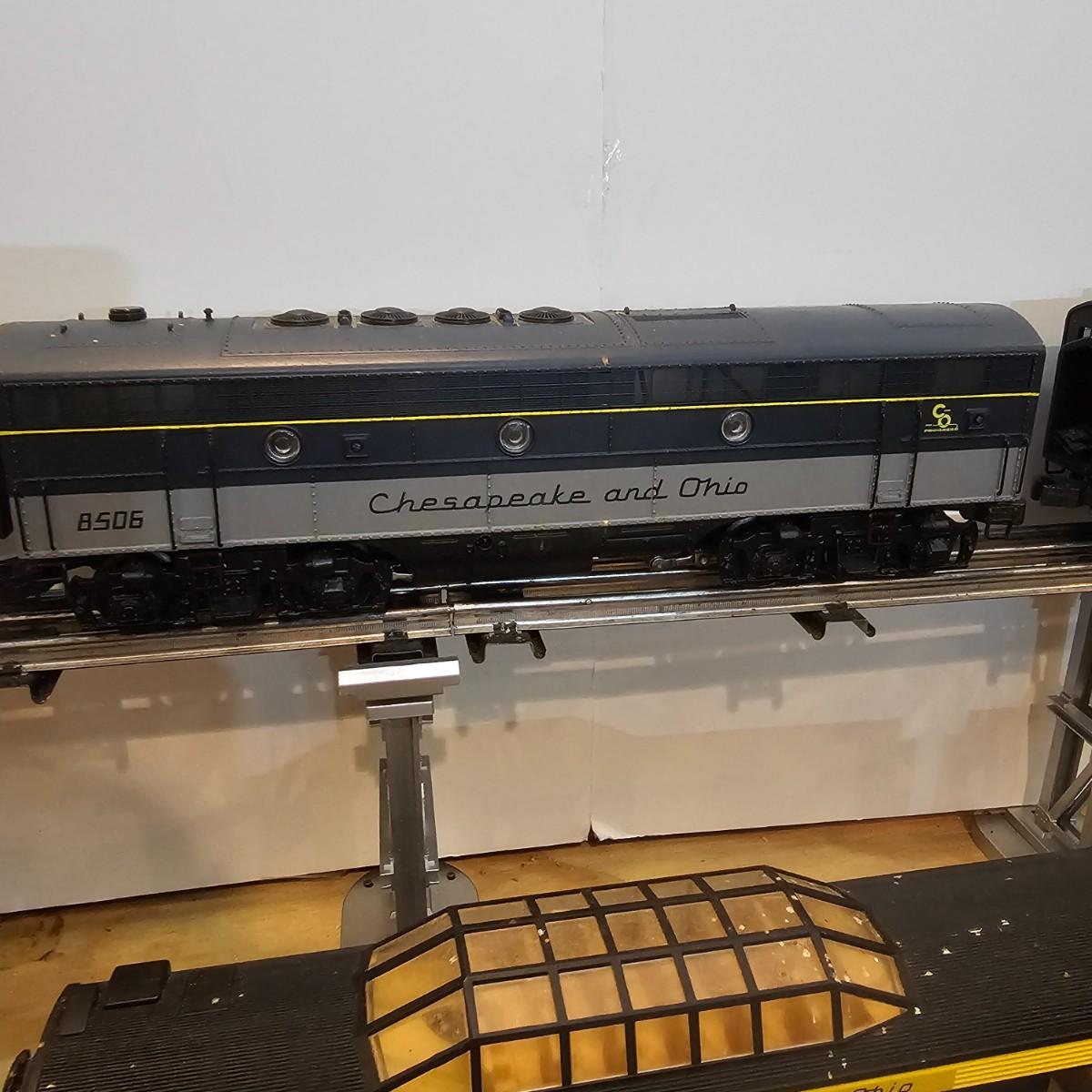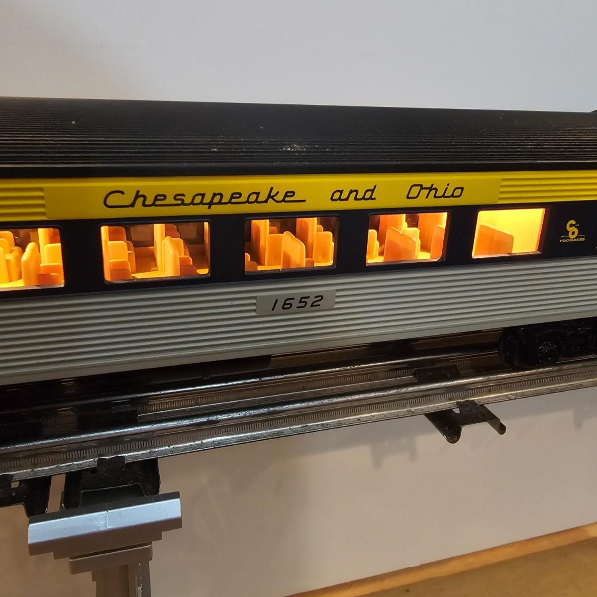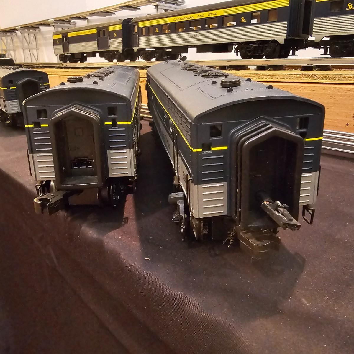 Blue and yellow adorn this group of C&O diesels and cars. A-B-A units at the head end all link together with plugs and cables. A's have working lights, B does not. Power units by K-Line in original boxes started and ran on layout. Five coaches/cars all by MTH/Rail King. Observation car, baggage, vista dome, more. All cars have interior detail and illumination, tested working. Original boxes included. Train overall is approximately 108". These items have been sitting out on display and needs some gentle cleaning. See photos for details. Shipping available. Please note that any price tag seen on an item was not put there by Sterling Transitions and does not reflect the current value of the item. Any train tracks shown in photos are not included but are available in another lot in this sale.