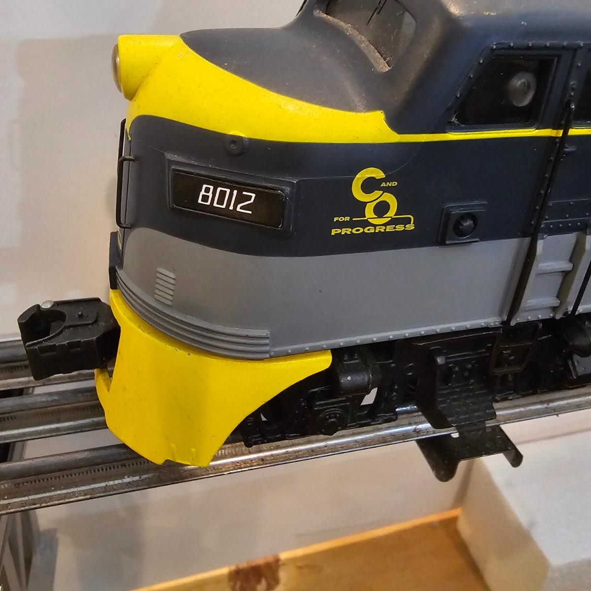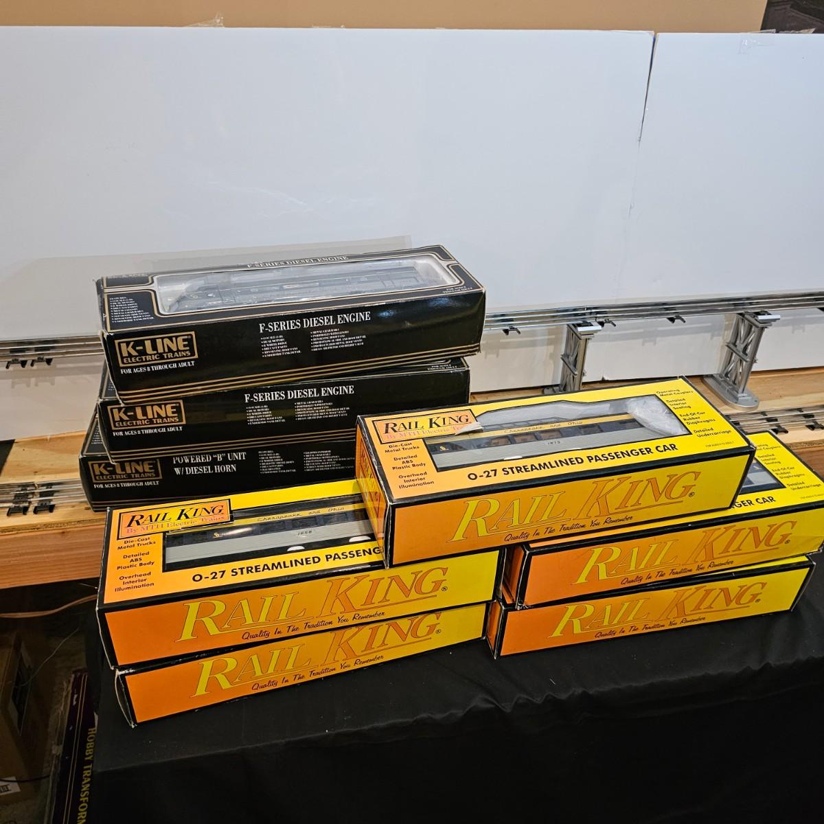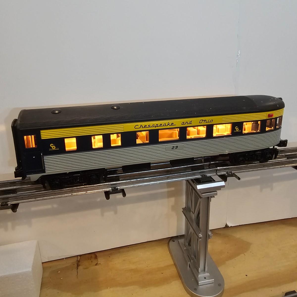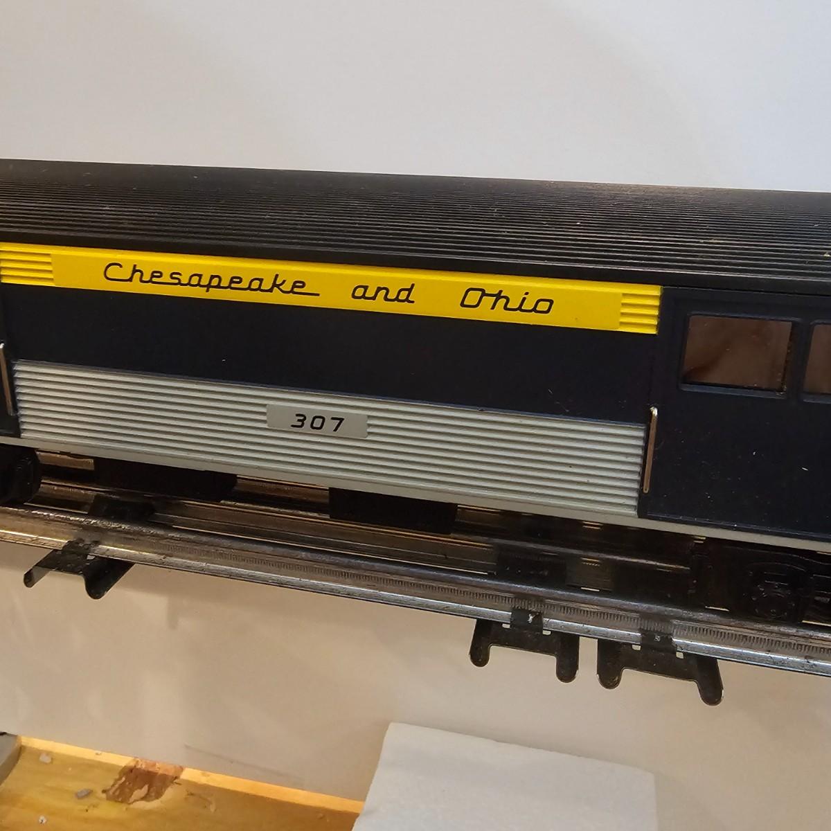 Blue and yellow adorn this group of C&O diesels and cars. A-B-A units at the head end all link together with plugs and cables. A's have working lights, B does not. Power units by K-Line in original boxes started and ran on layout. Five coaches/cars all by MTH/Rail King. Observation car, baggage, vista dome, more. All cars have interior detail and illumination, tested working. Original boxes included. Train overall is approximately 108". These items have been sitting out on display and needs some gentle cleaning. See photos for details. Shipping available. Please note that any price tag seen on an item was not put there by Sterling Transitions and does not reflect the current value of the item. Any train tracks shown in photos are not included but are available in another lot in this sale.