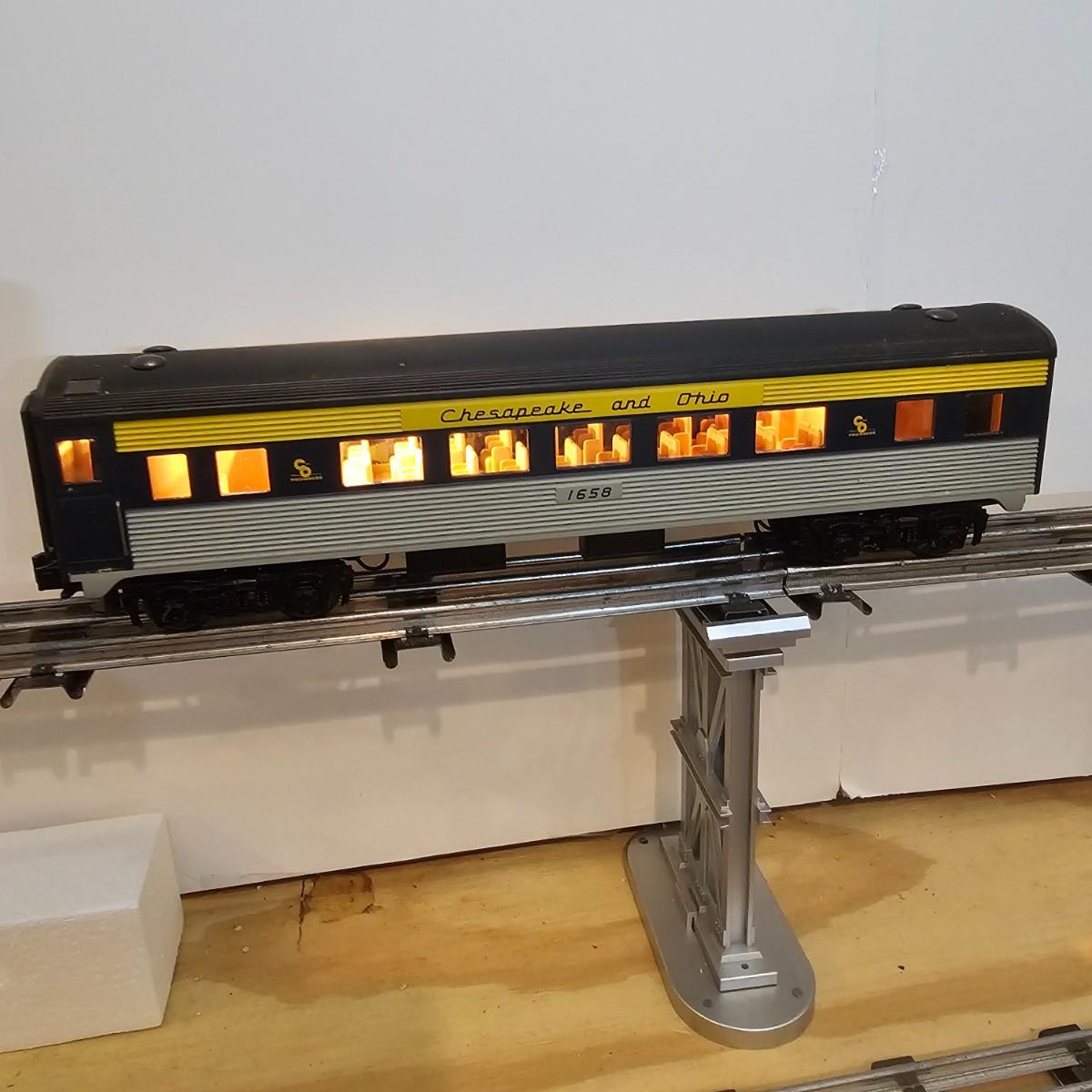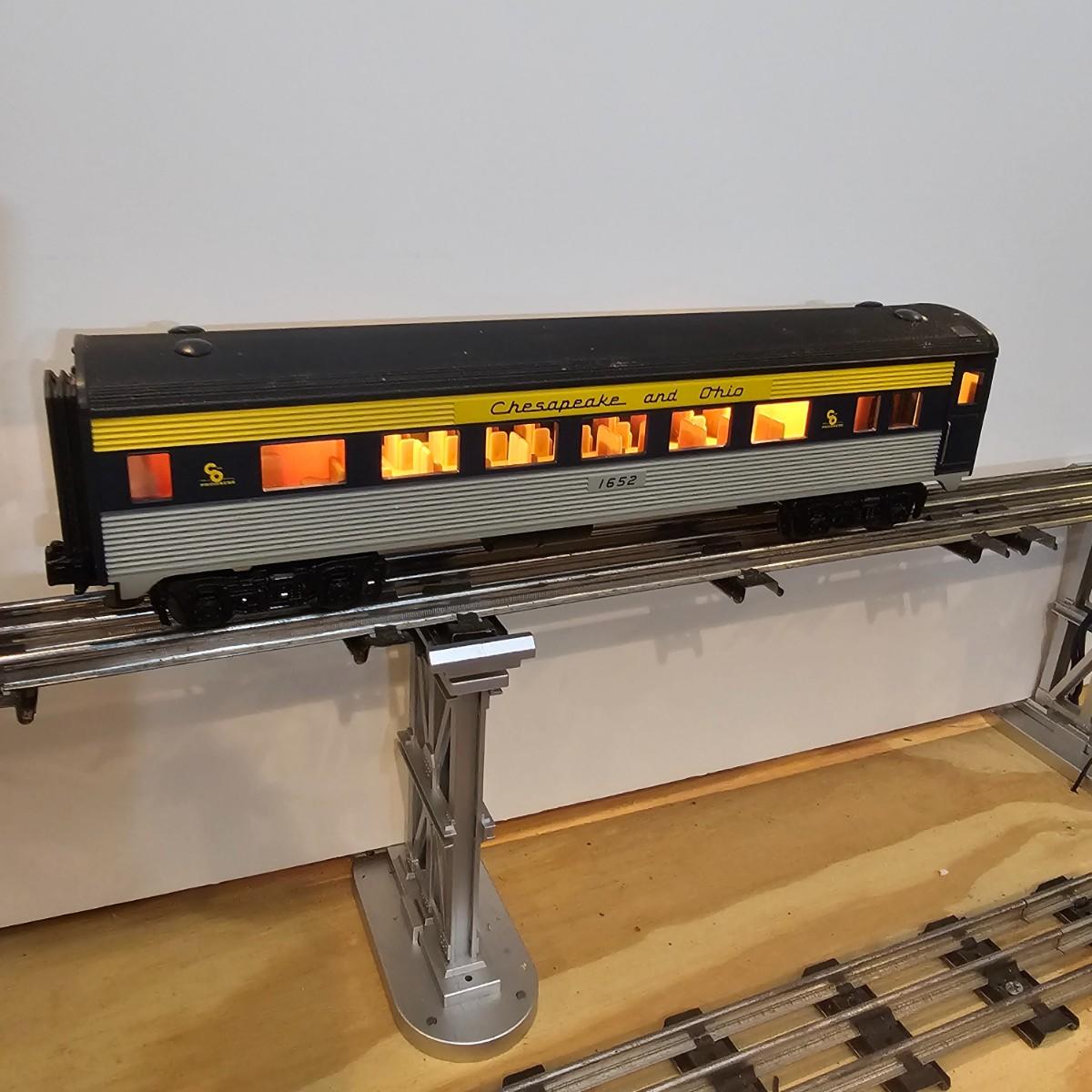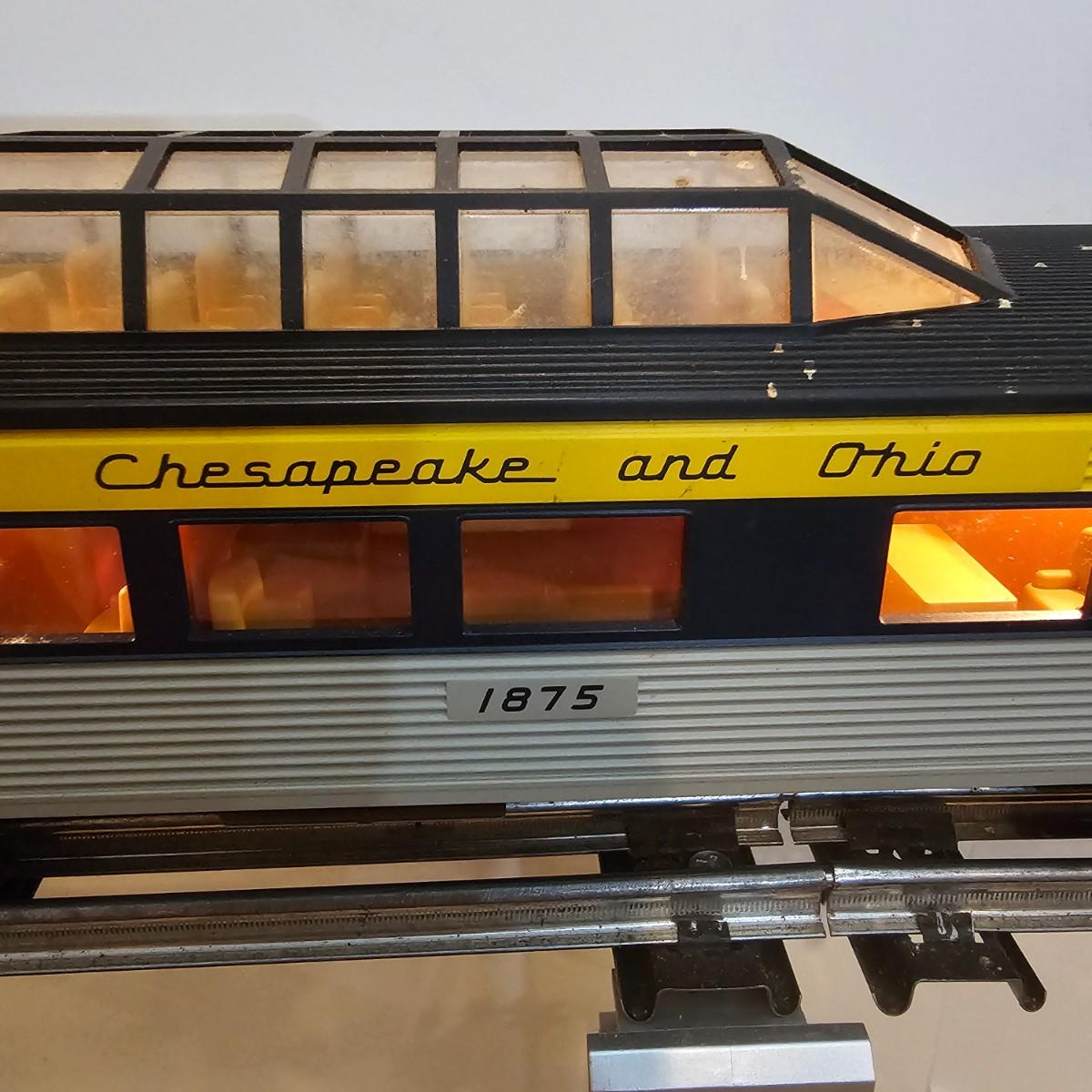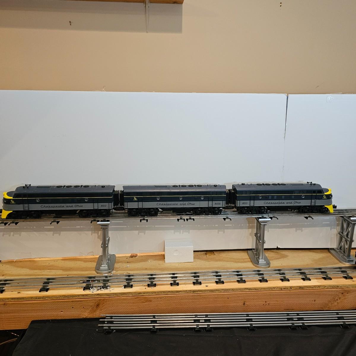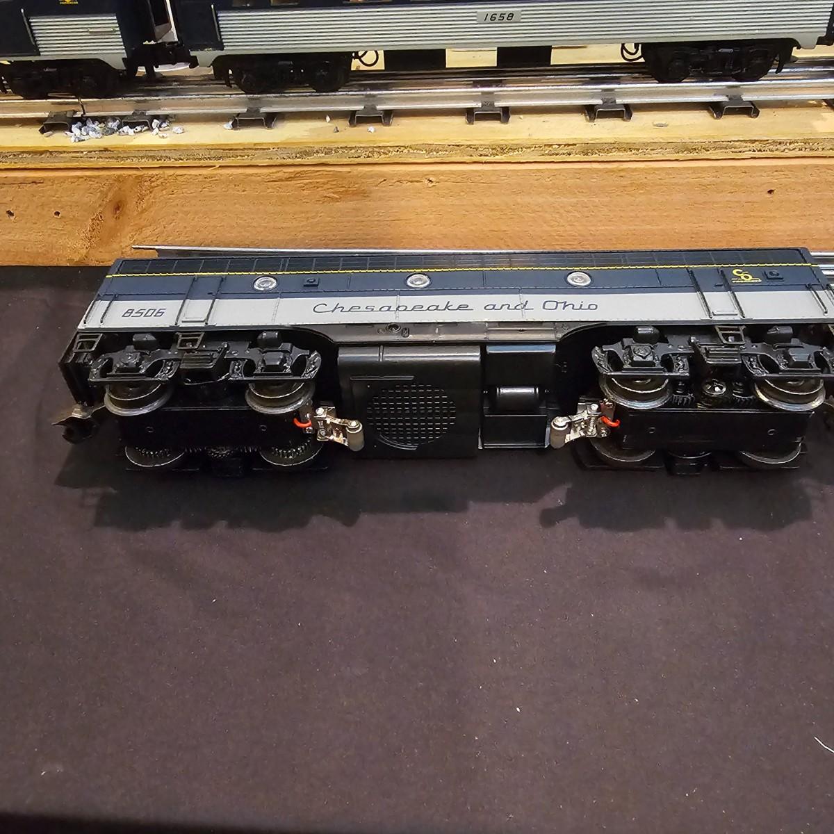 Blue and yellow adorn this group of C&O diesels and cars. A-B-A units at the head end all link together with plugs and cables. A's have working lights, B does not. Power units by K-Line in original boxes started and ran on layout. Five coaches/cars all by MTH/Rail King. Observation car, baggage, vista dome, more. All cars have interior detail and illumination, tested working. Original boxes included. Train overall is approximately 108". These items have been sitting out on display and needs some gentle cleaning. See photos for details. Shipping available. Please note that any price tag seen on an item was not put there by Sterling Transitions and does not reflect the current value of the item. Any train tracks shown in photos are not included but are available in another lot in this sale.