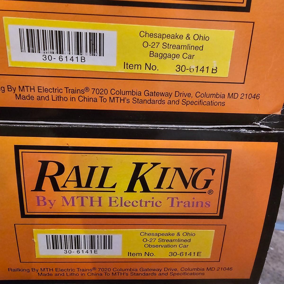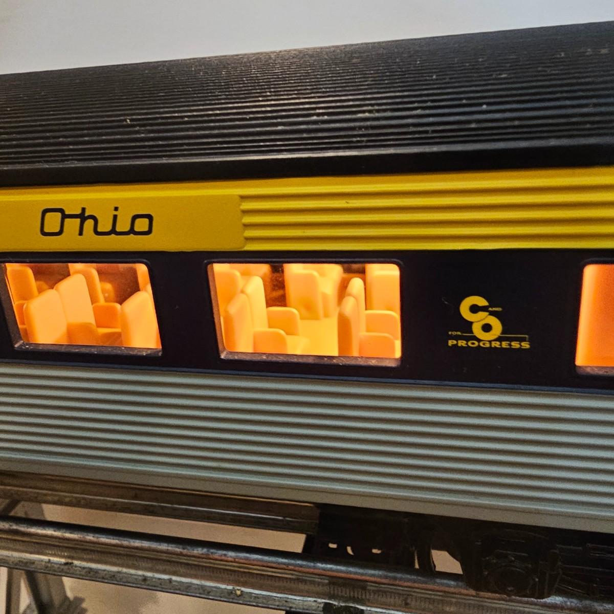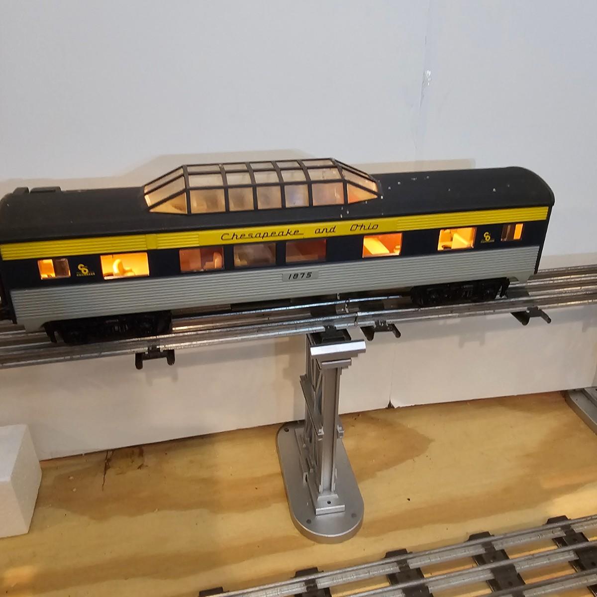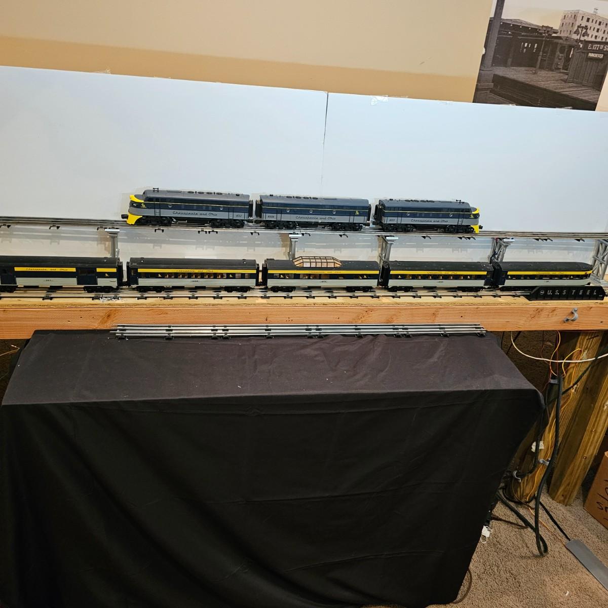 Blue and yellow adorn this group of C&O diesels and cars. A-B-A units at the head end all link together with plugs and cables. A's have working lights, B does not. Power units by K-Line in original boxes started and ran on layout. Five coaches/cars all by MTH/Rail King. Observation car, baggage, vista dome, more. All cars have interior detail and illumination, tested working. Original boxes included. Train overall is approximately 108". These items have been sitting out on display and needs some gentle cleaning. See photos for details. Shipping available. Please note that any price tag seen on an item was not put there by Sterling Transitions and does not reflect the current value of the item. Any train tracks shown in photos are not included but are available in another lot in this sale.
