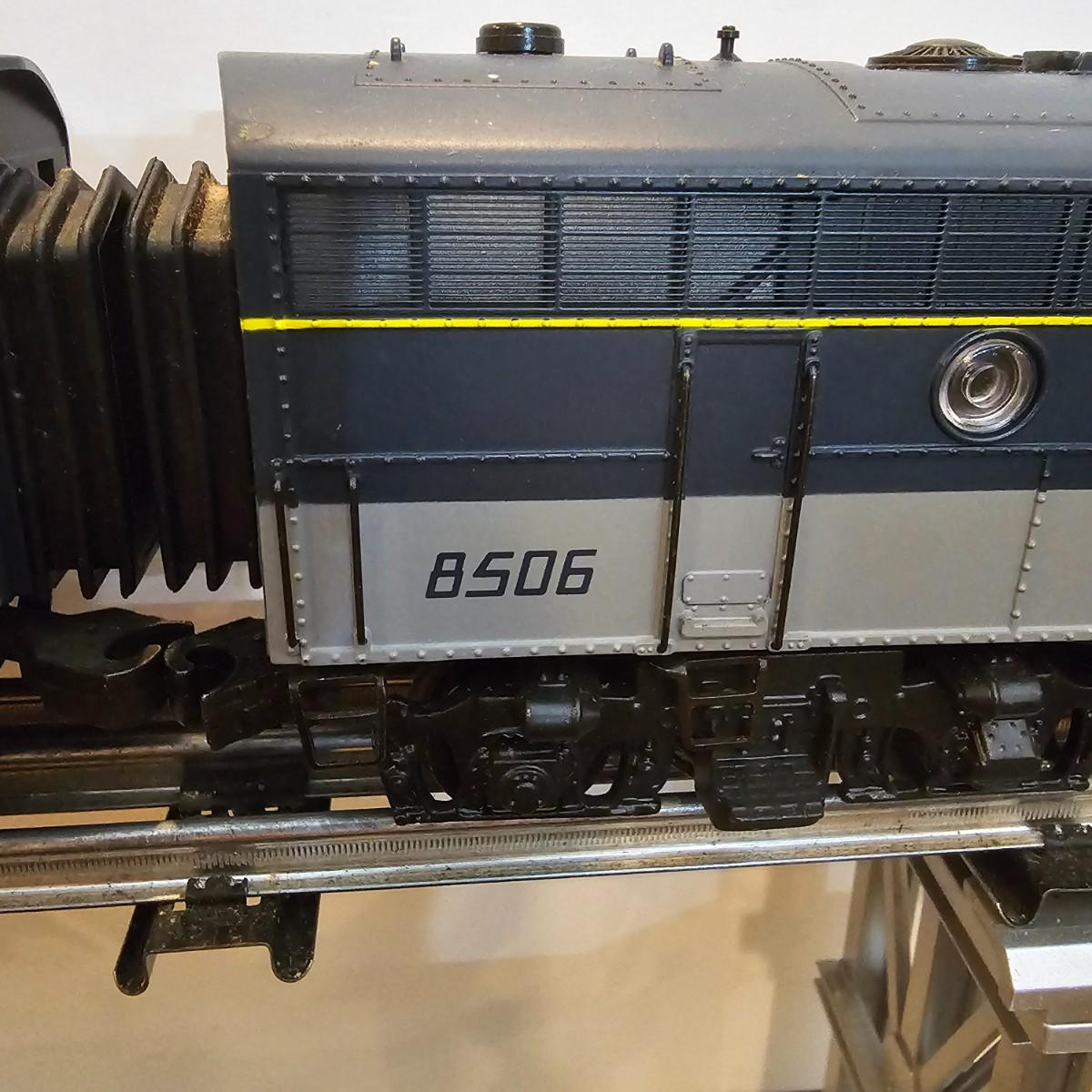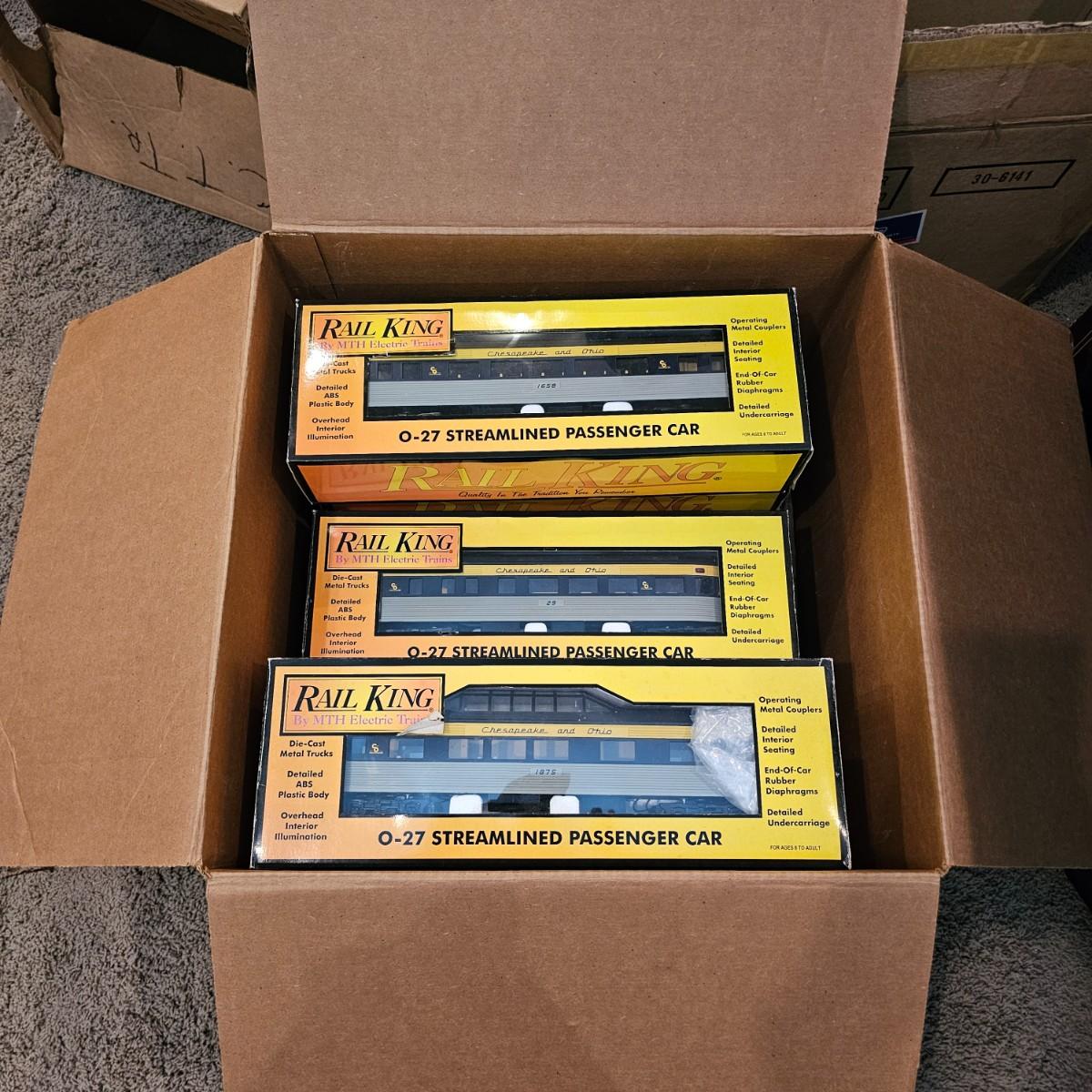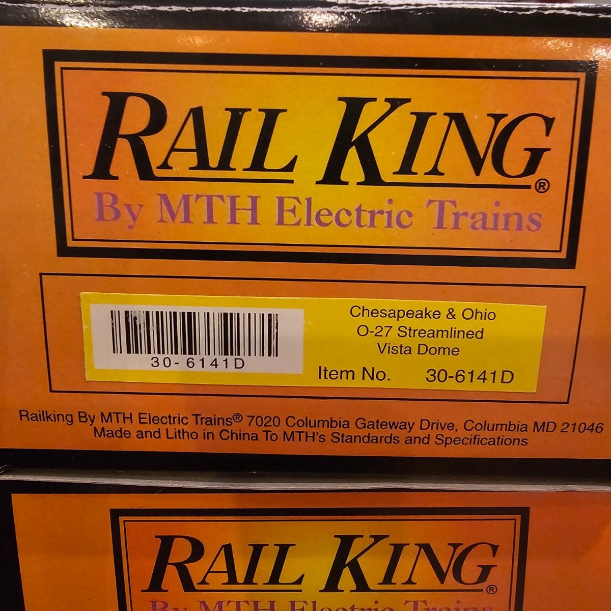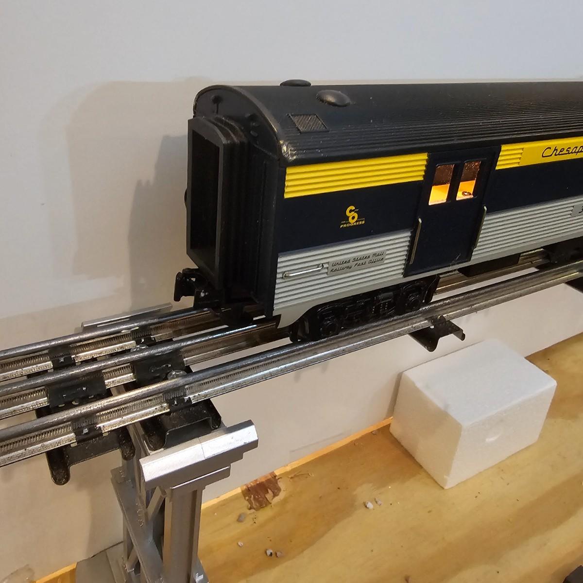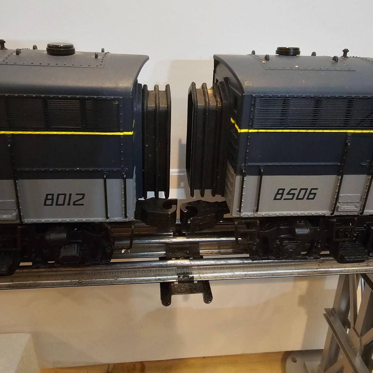 Blue and yellow adorn this group of C&O diesels and cars. A-B-A units at the head end all link together with plugs and cables. A's have working lights, B does not. Power units by K-Line in original boxes started and ran on layout. Five coaches/cars all by MTH/Rail King. Observation car, baggage, vista dome, more. All cars have interior detail and illumination, tested working. Original boxes included. Train overall is approximately 108". These items have been sitting out on display and needs some gentle cleaning. See photos for details. Shipping available. Please note that any price tag seen on an item was not put there by Sterling Transitions and does not reflect the current value of the item. Any train tracks shown in photos are not included but are available in another lot in this sale.