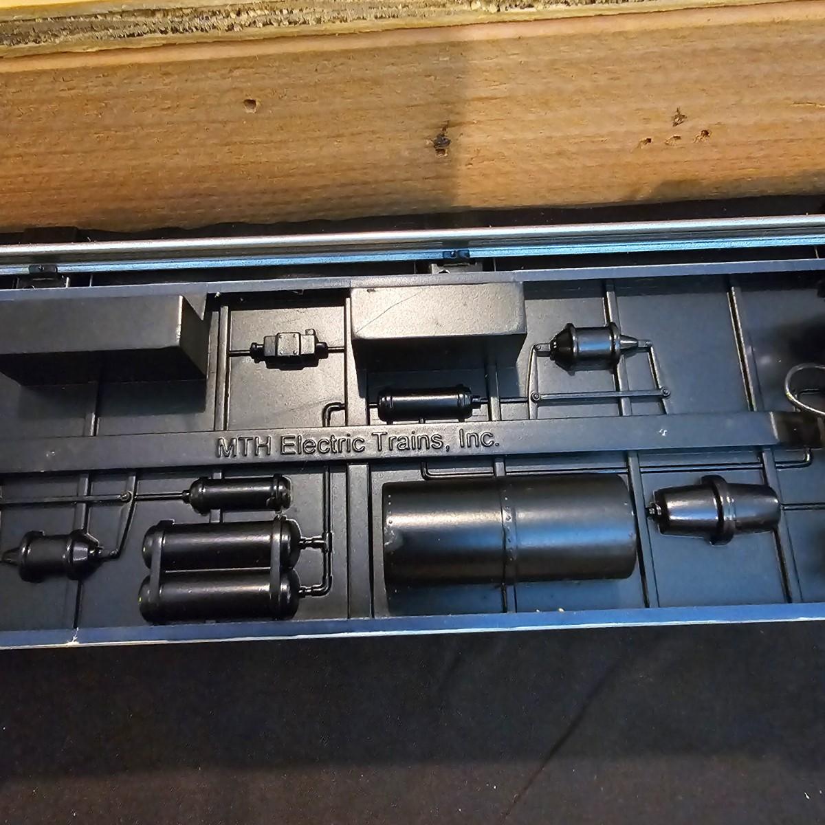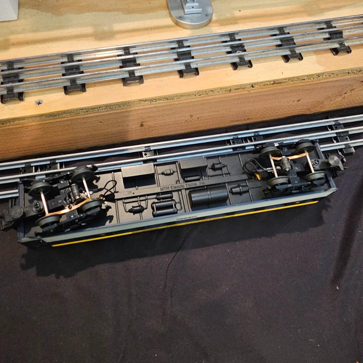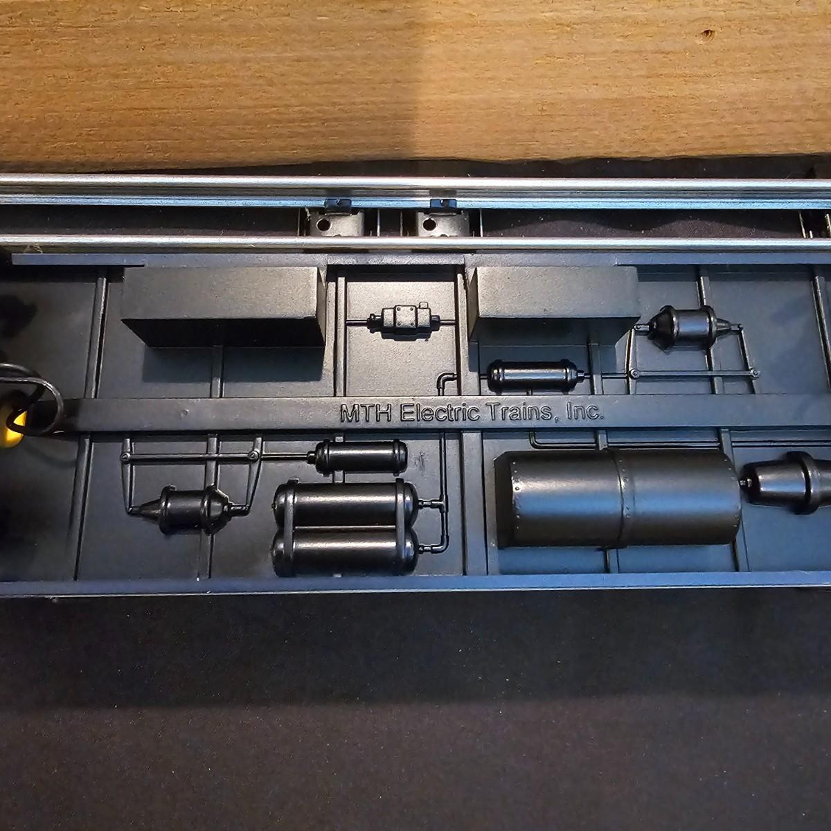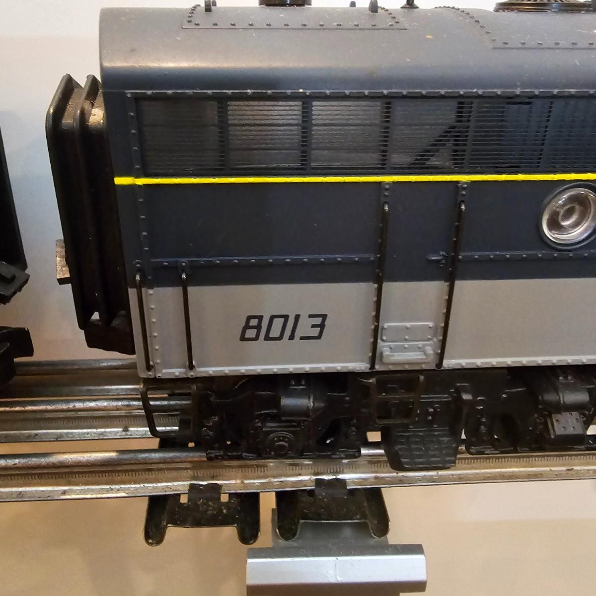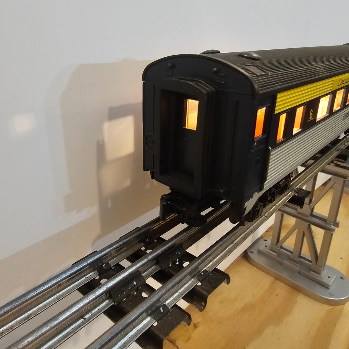Blue and yellow adorn this group of C&O diesels and cars. A-B-A units at the head end all link together with plugs and cables. A's have working lights, B does not. Power units by K-Line in original boxes started and ran on layout. Five coaches/cars all by MTH/Rail King. Observation car, baggage, vista dome, more. All cars have interior detail and illumination, tested working. Original boxes included. Train overall is approximately 108". These items have been sitting out on display and needs some gentle cleaning. See photos for details. Shipping available. Please note that any price tag seen on an item was not put there by Sterling Transitions and does not reflect the current value of the item. Any train tracks shown in photos are not included but are available in another lot in this sale.