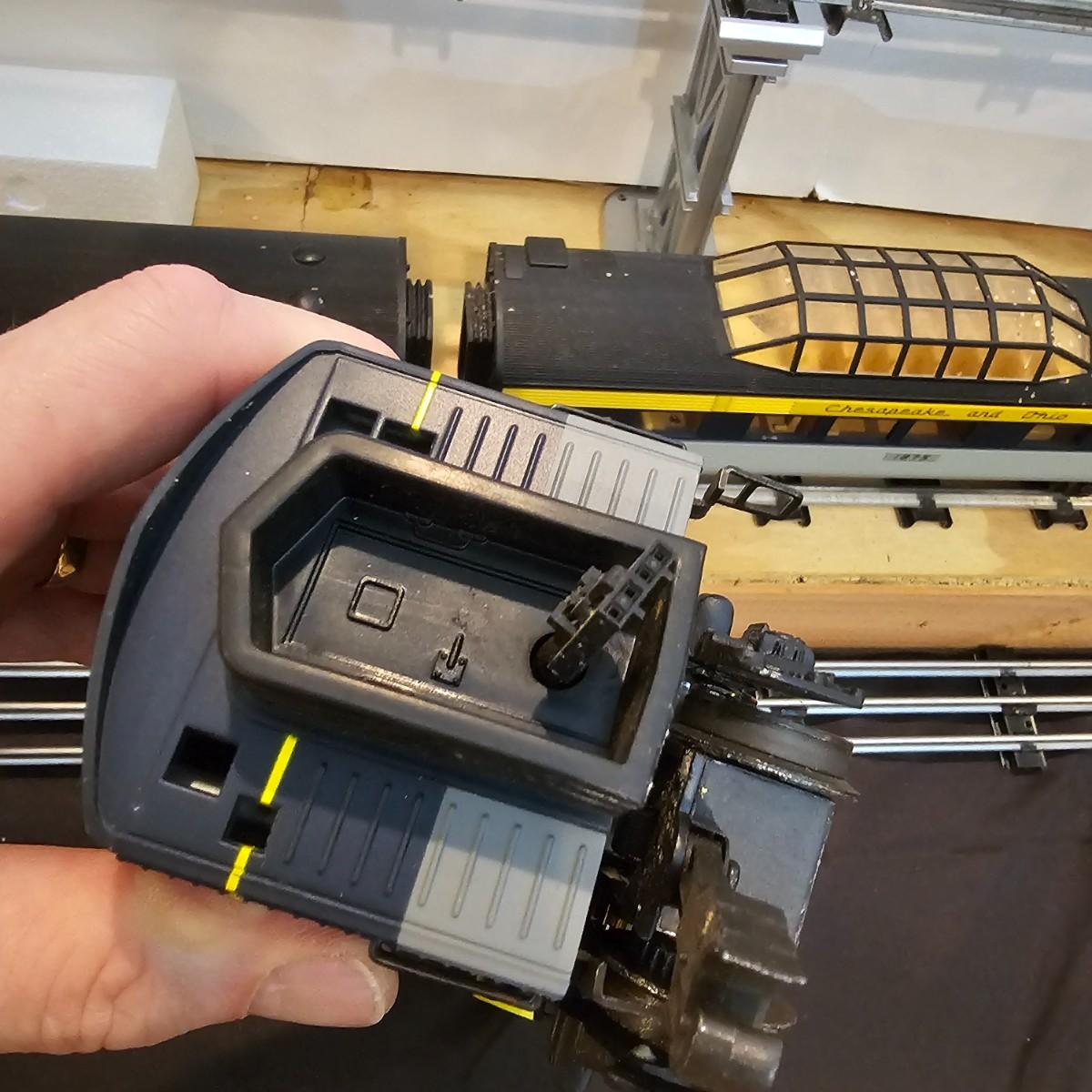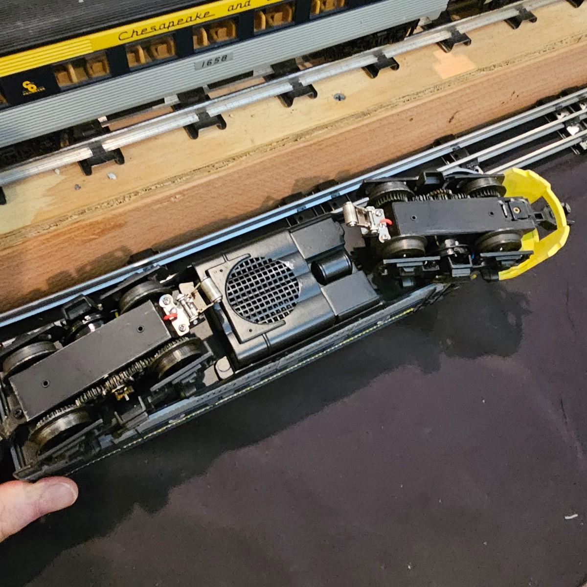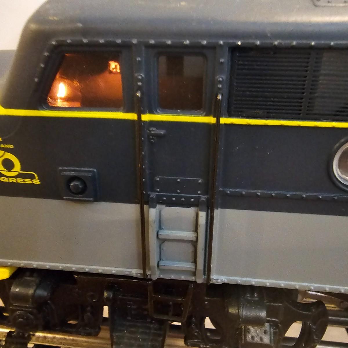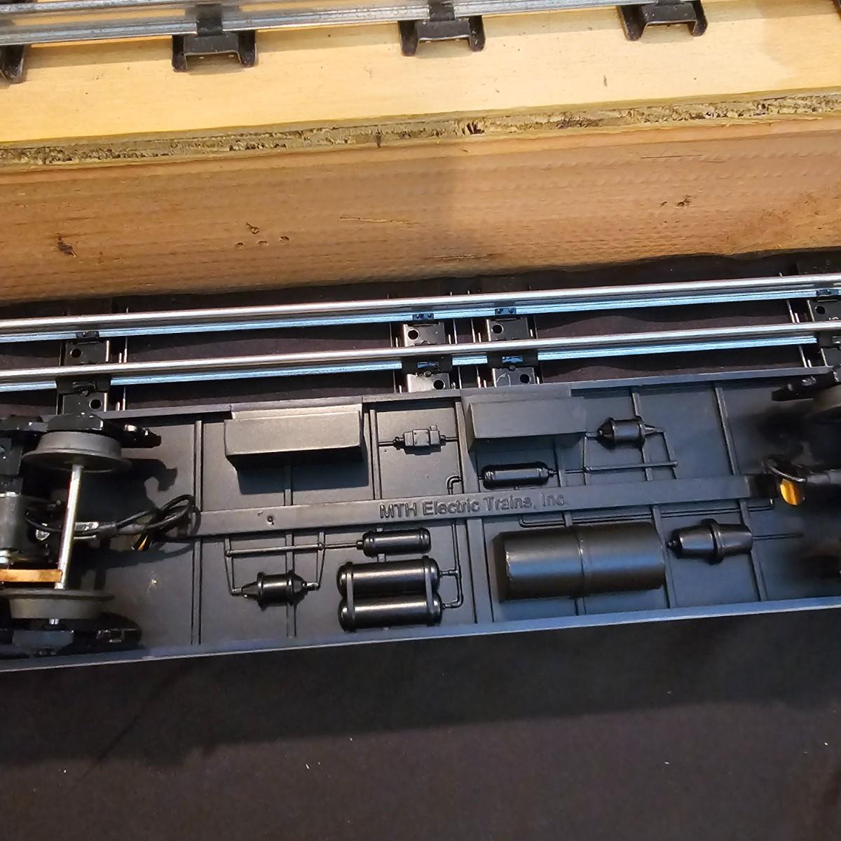 Blue and yellow adorn this group of C&O diesels and cars. A-B-A units at the head end all link together with plugs and cables. A's have working lights, B does not. Power units by K-Line in original boxes started and ran on layout. Five coaches/cars all by MTH/Rail King. Observation car, baggage, vista dome, more. All cars have interior detail and illumination, tested working. Original boxes included. Train overall is approximately 108". These items have been sitting out on display and needs some gentle cleaning. See photos for details. Shipping available. Please note that any price tag seen on an item was not put there by Sterling Transitions and does not reflect the current value of the item. Any train tracks shown in photos are not included but are available in another lot in this sale.