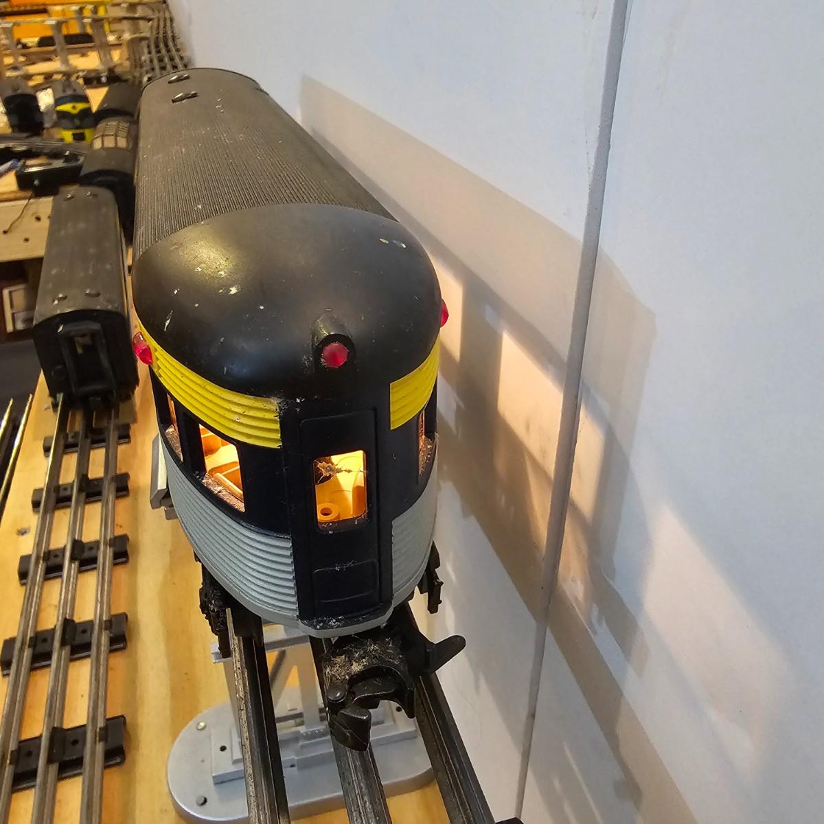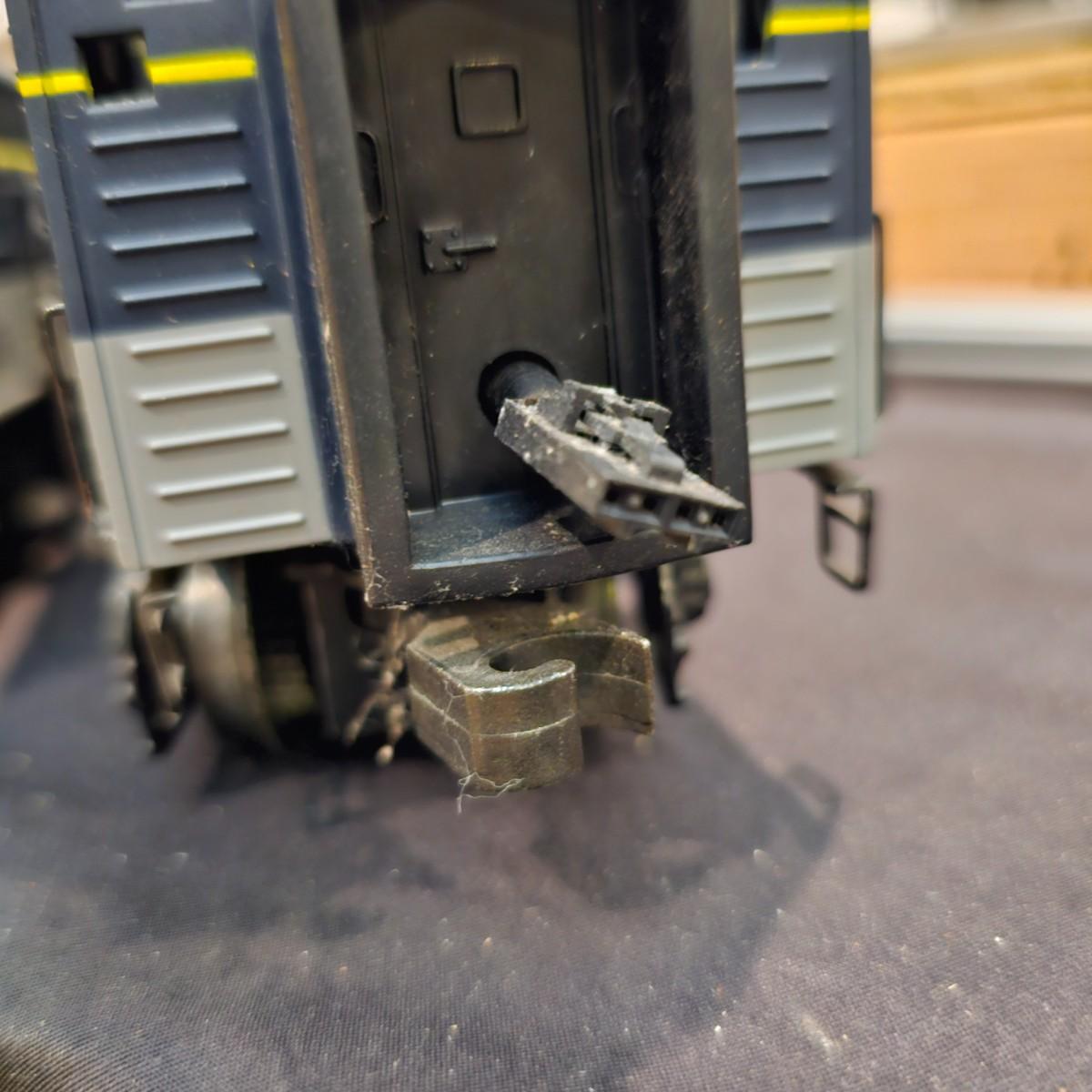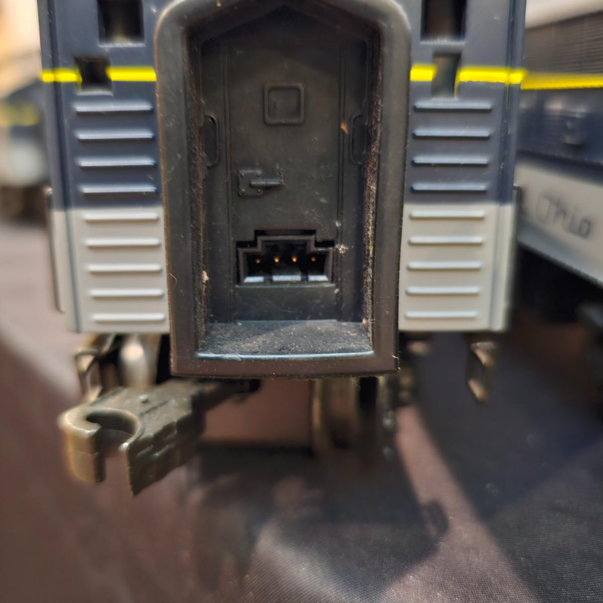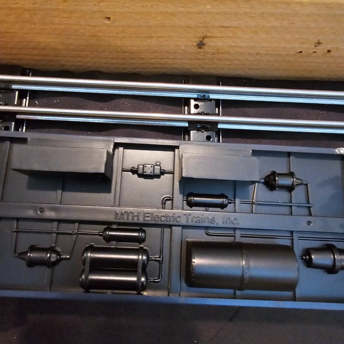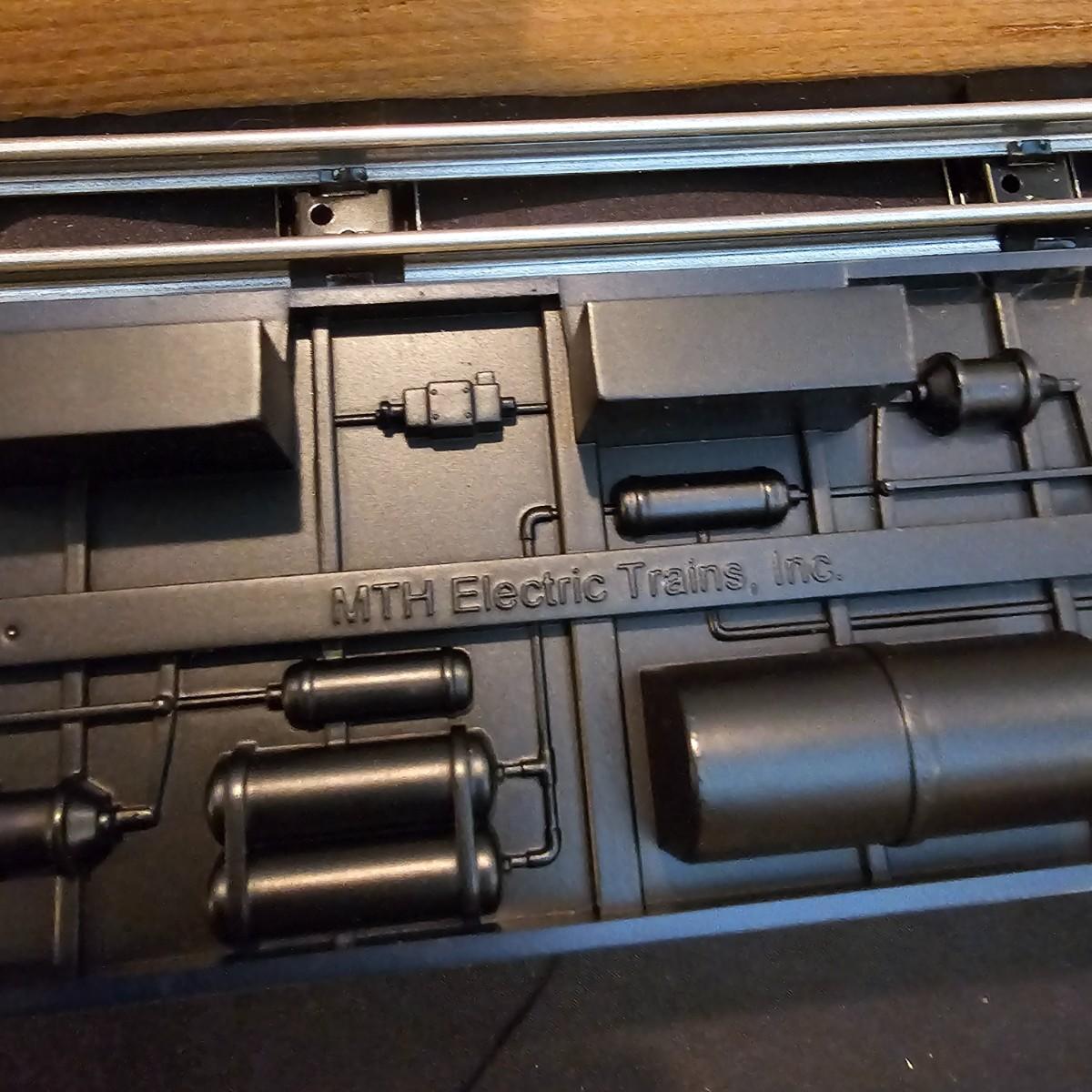 Blue and yellow adorn this group of C&O diesels and cars. A-B-A units at the head end all link together with plugs and cables. A's have working lights, B does not. Power units by K-Line in original boxes started and ran on layout. Five coaches/cars all by MTH/Rail King. Observation car, baggage, vista dome, more. All cars have interior detail and illumination, tested working. Original boxes included. Train overall is approximately 108". These items have been sitting out on display and needs some gentle cleaning. See photos for details. Shipping available. Please note that any price tag seen on an item was not put there by Sterling Transitions and does not reflect the current value of the item. Any train tracks shown in photos are not included but are available in another lot in this sale.