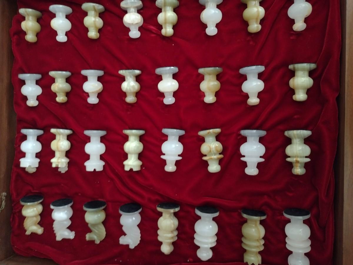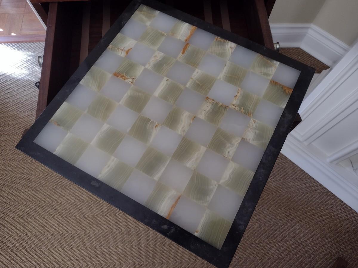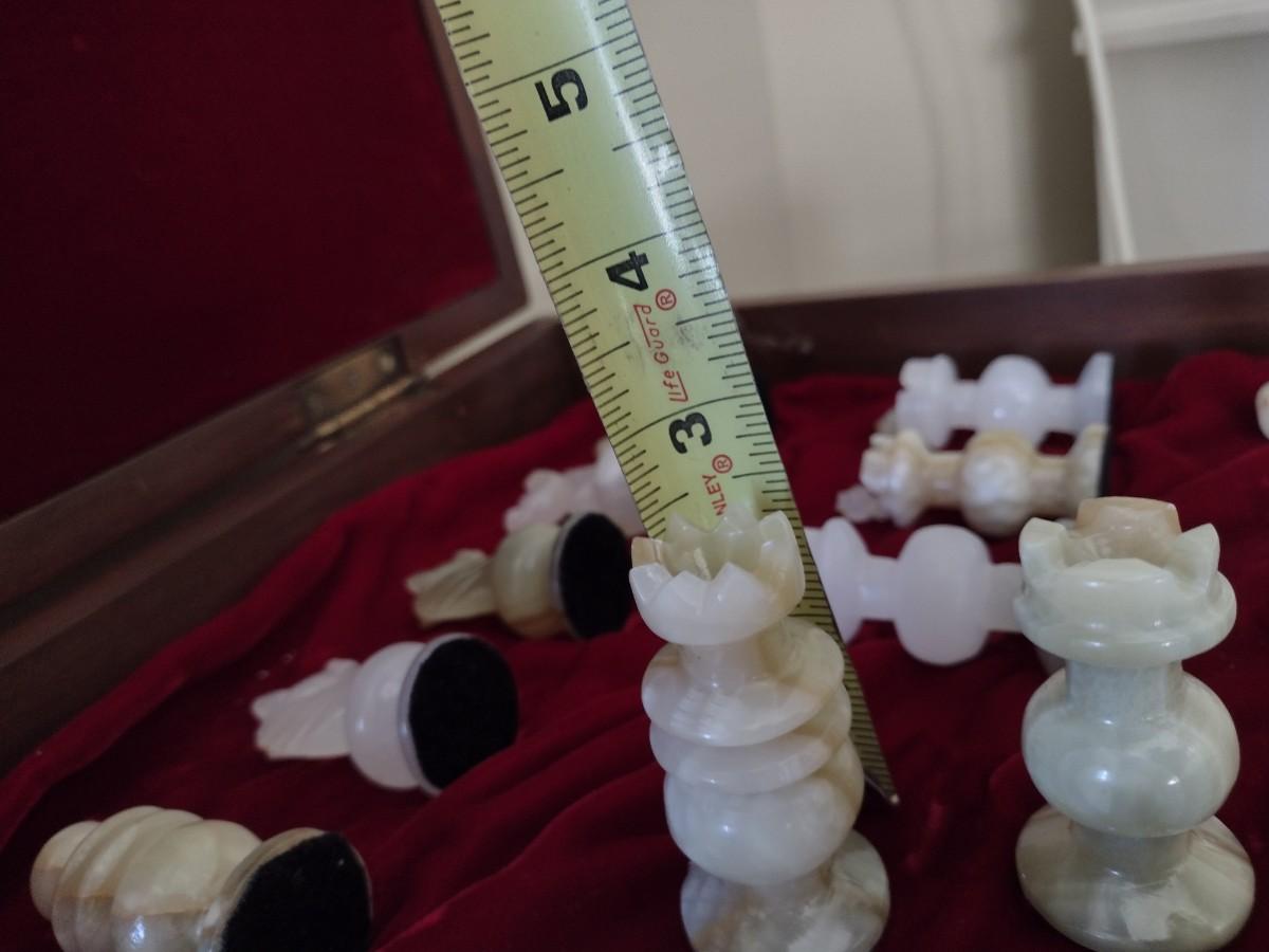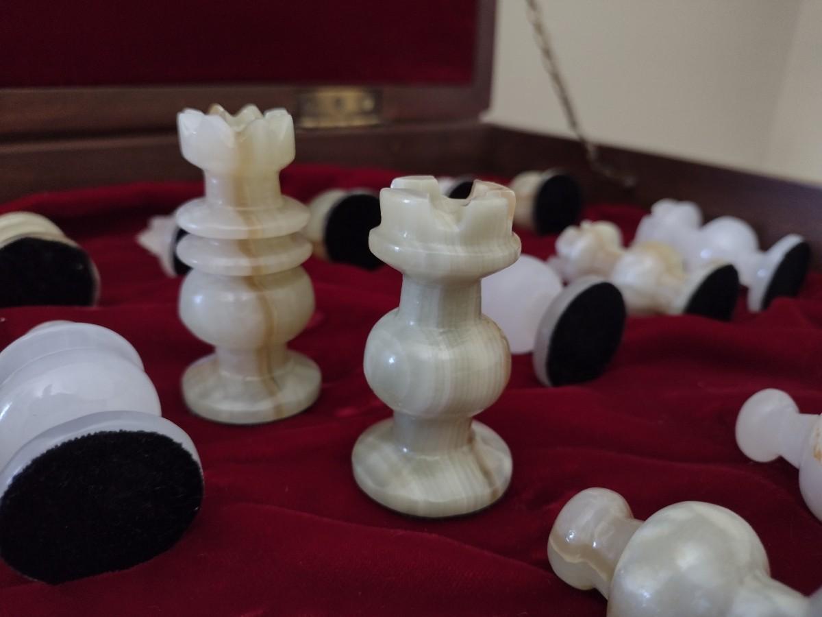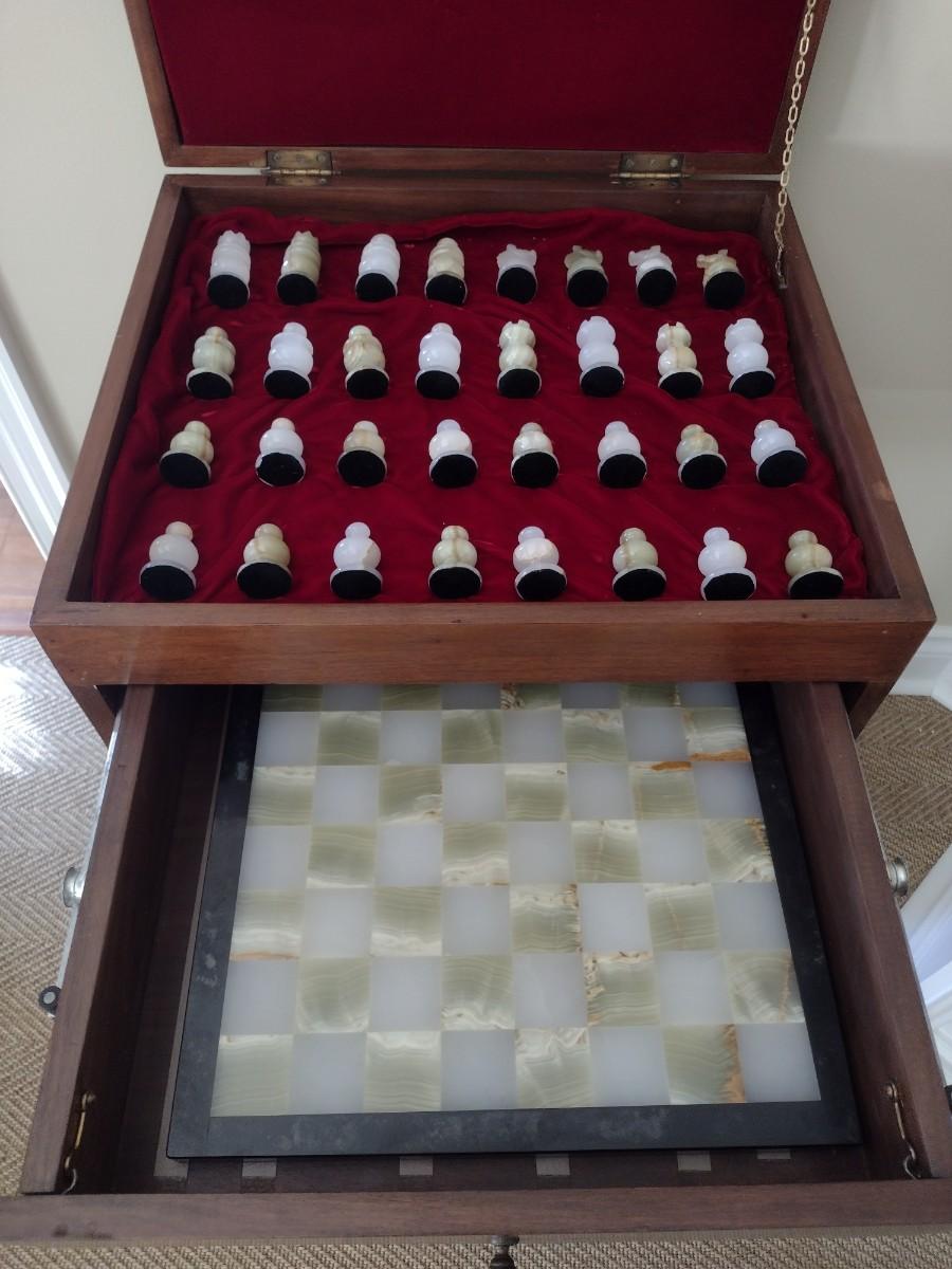 Onyx Custom Cut Chess Set in Solid Wood Game Chest on Matching Stand