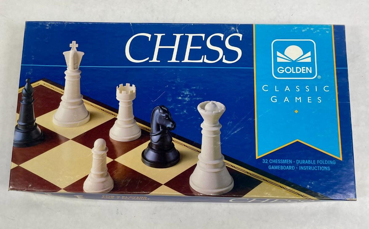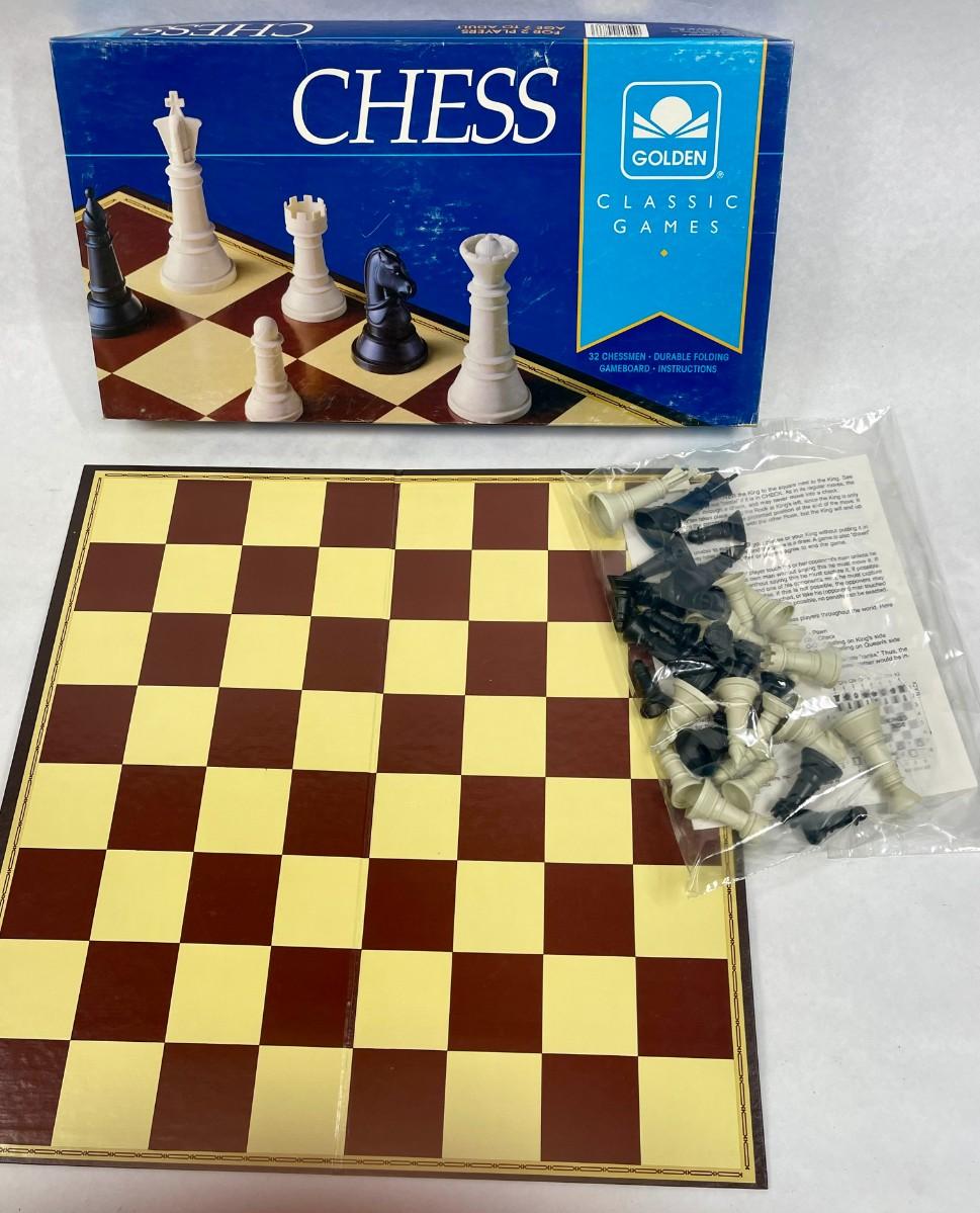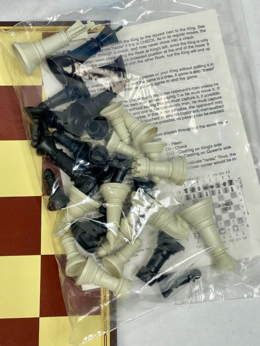 Foldable cardboard chess board and molded plastic pieces. Unused, no missing pieces. Great starter set for new players.