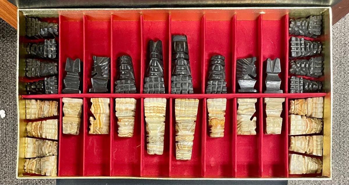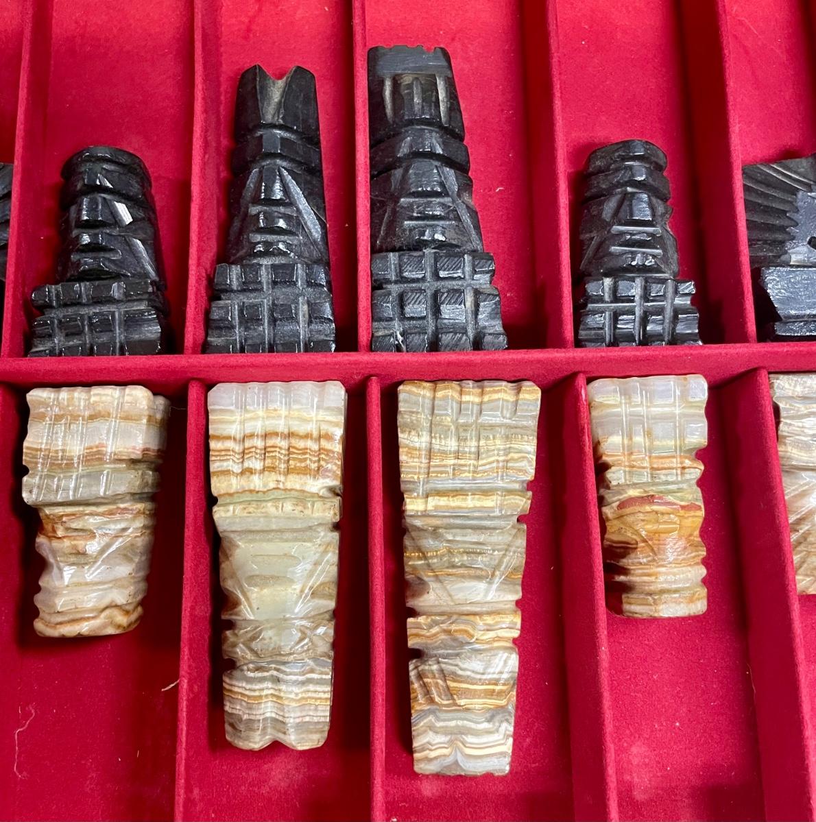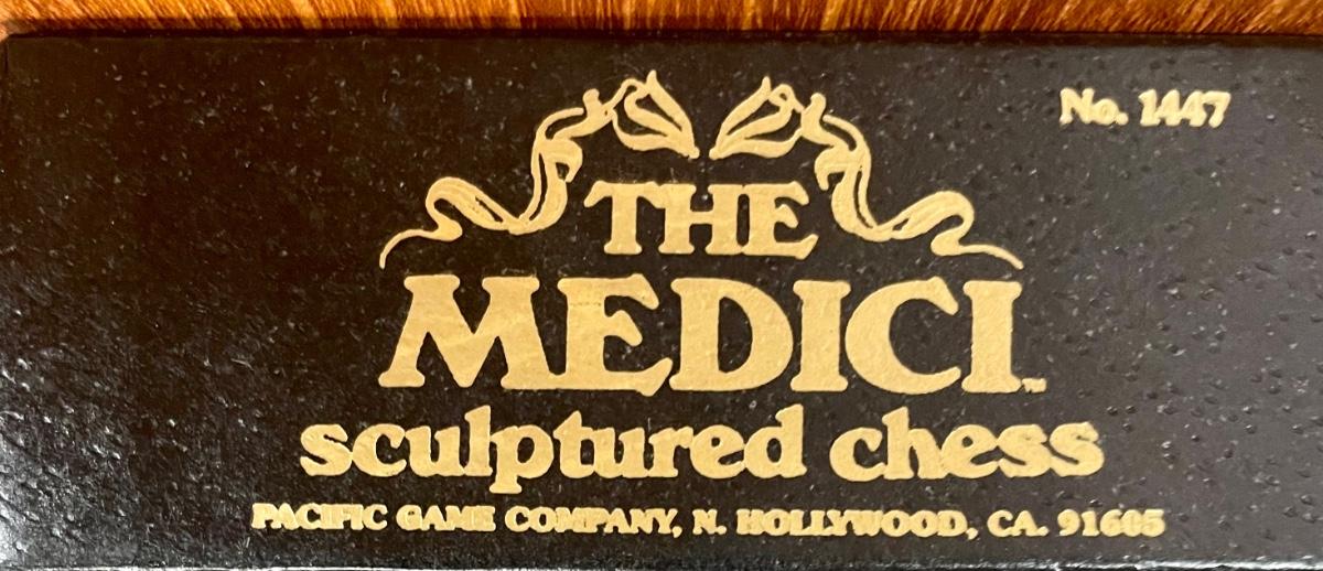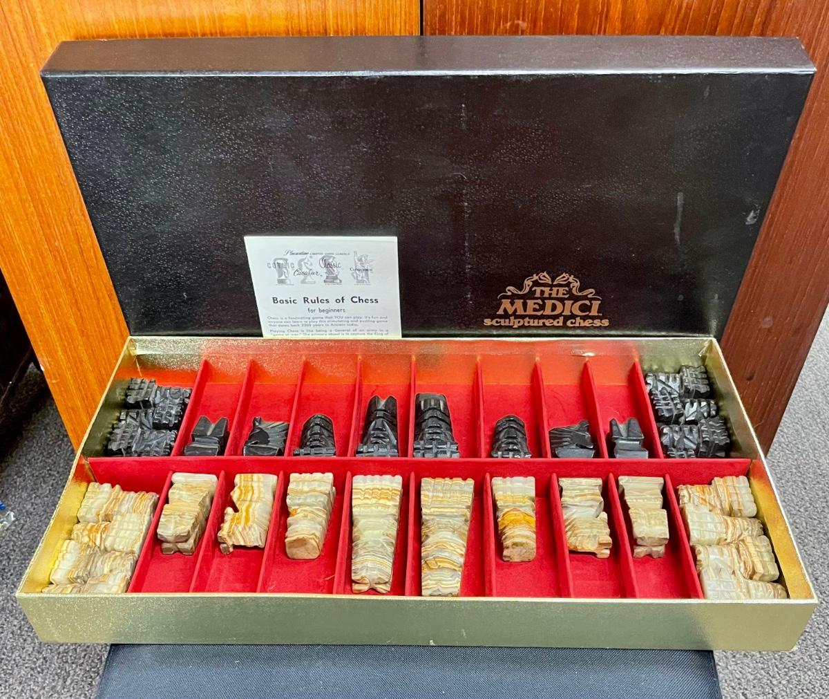The Medici boxed complete chessmen set. No damaged or broken pieces. Pieces carved from marble. Box is in excellent condition. Does not include chess board.