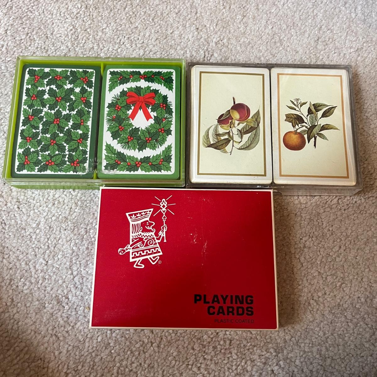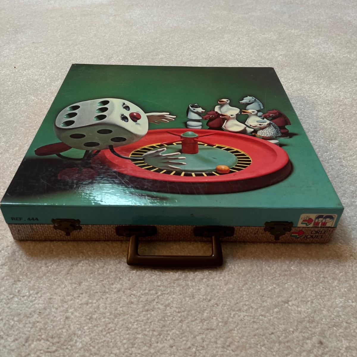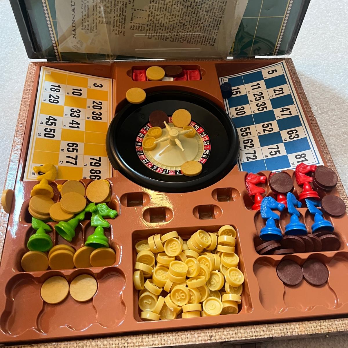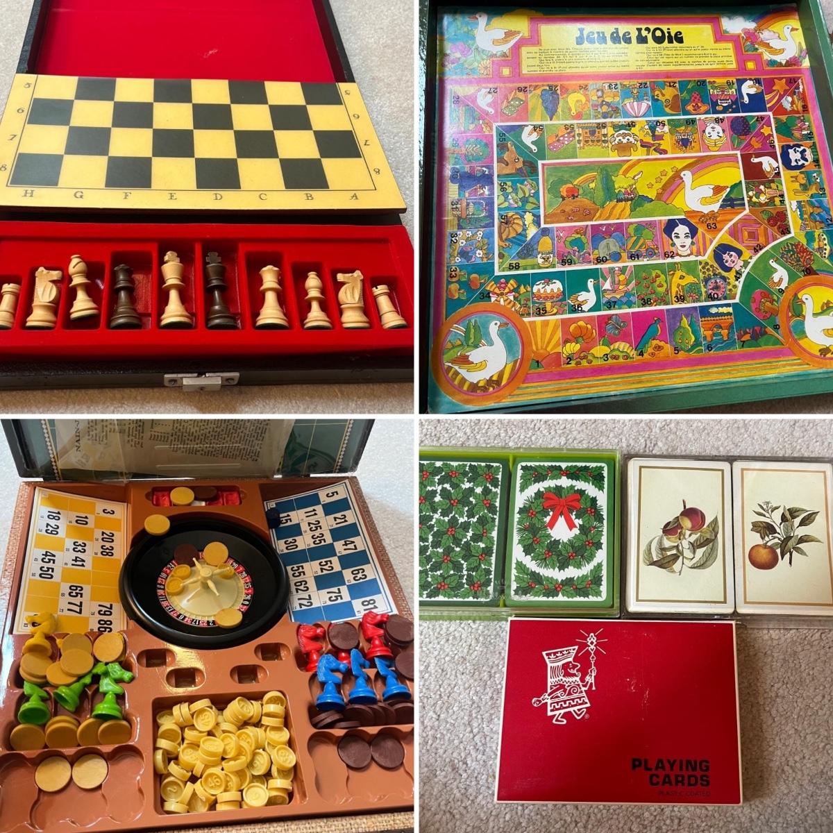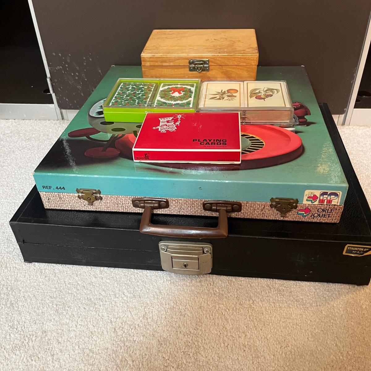 Lot includes a chess set in black carrying case, wooden box with wooden chess pieces, three sets of playing cards and a Roulette style game in carrying case. Black case measures 16” x 13” x 3”H.