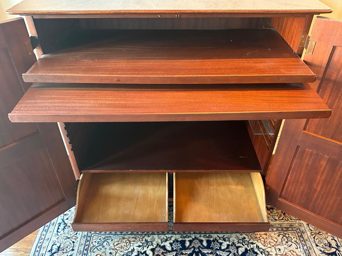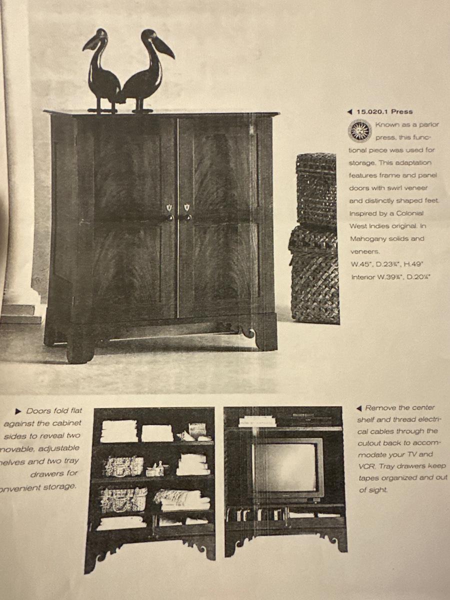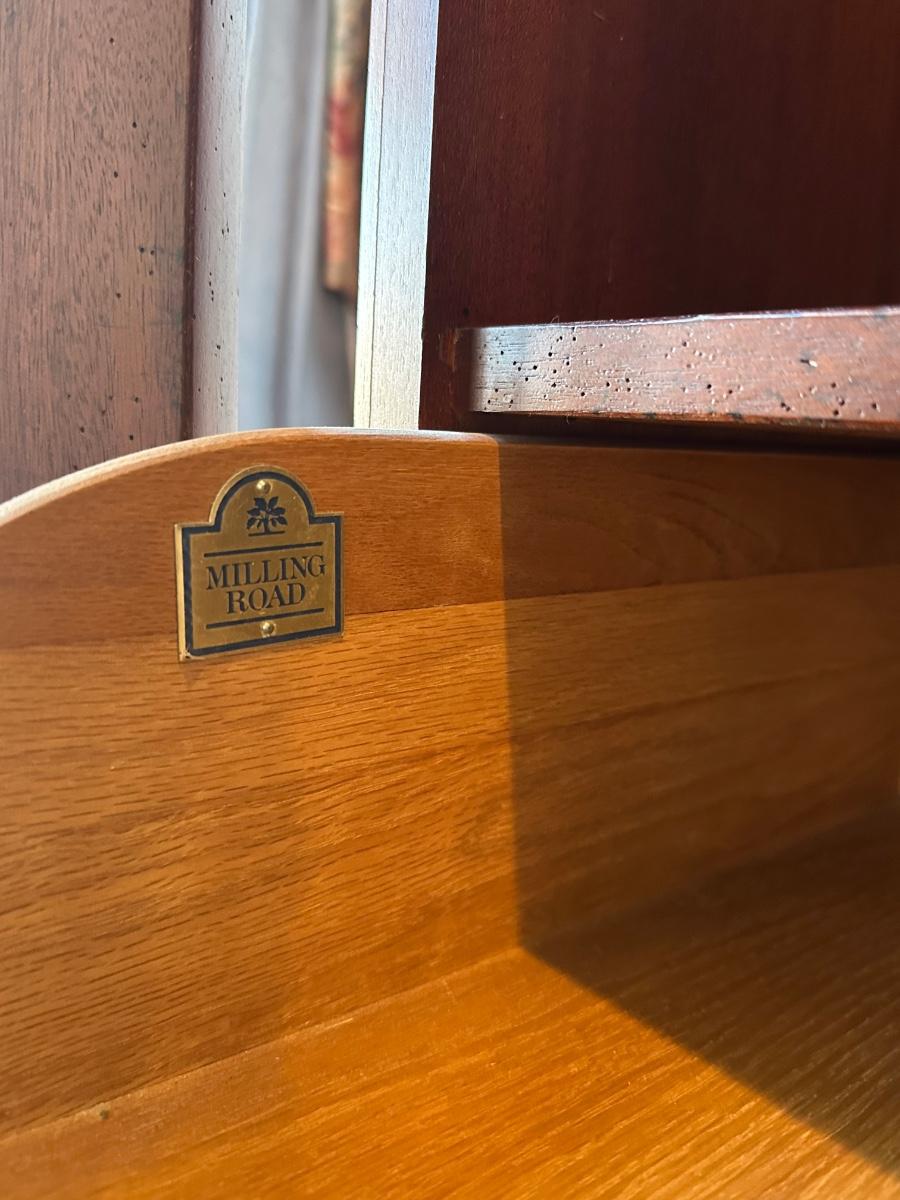 Milling Road “West Indies” armoire. Scroll apron base, paneled doors, slide-out shelves, lower drawers, and interior organizer. Purchased from Hurwitz-Mintz. Solid, quality piece.