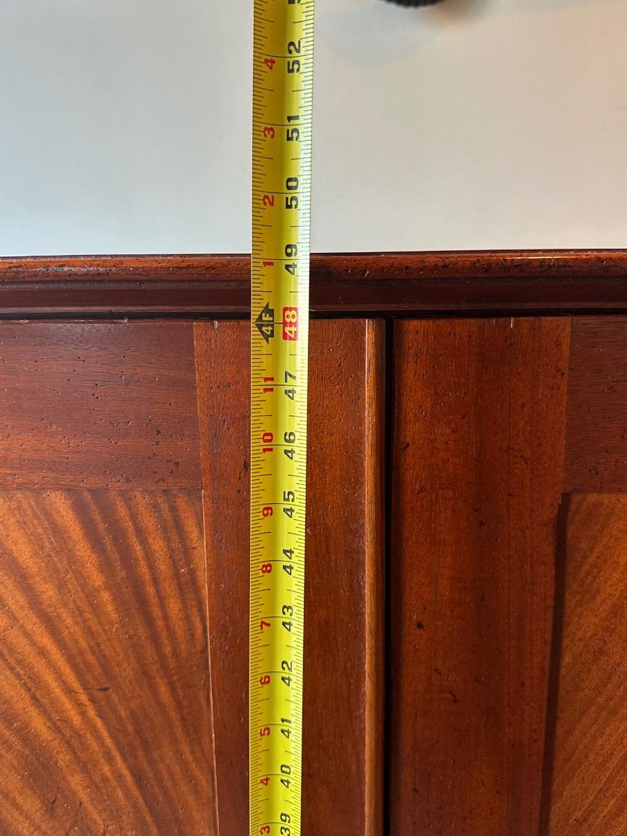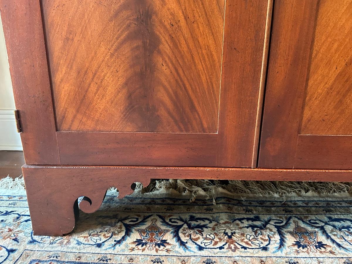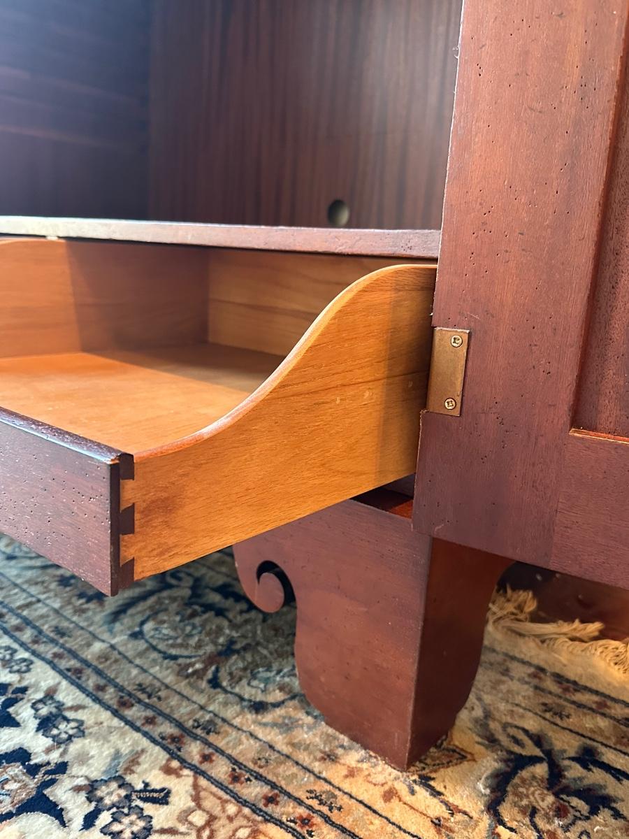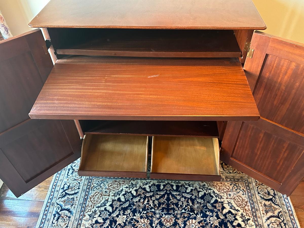 Milling Road “West Indies” armoire. Scroll apron base, paneled doors, slide-out shelves, lower drawers, and interior organizer. Purchased from Hurwitz-Mintz. Solid, quality piece.
