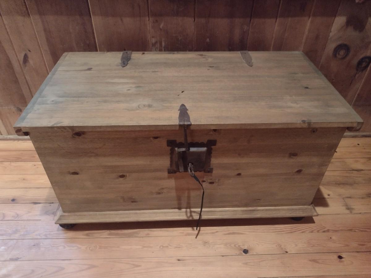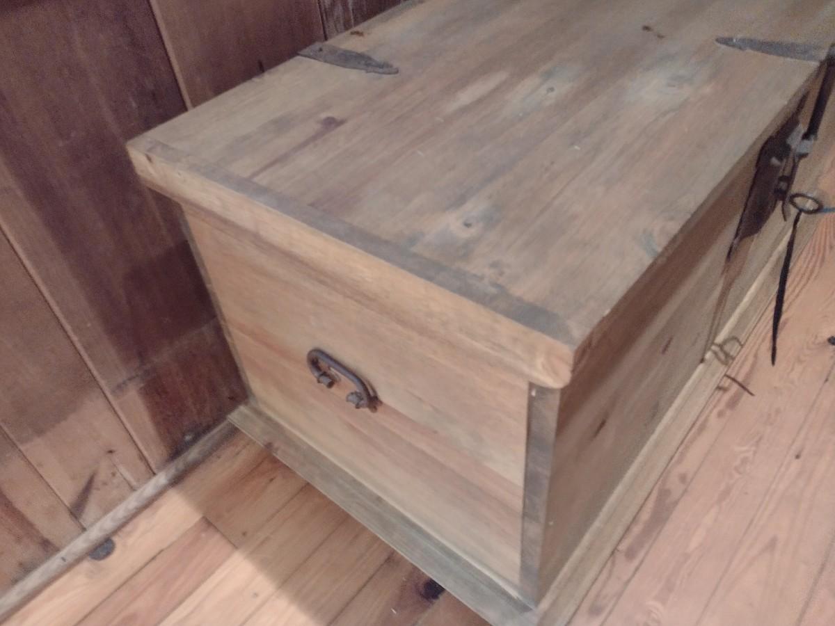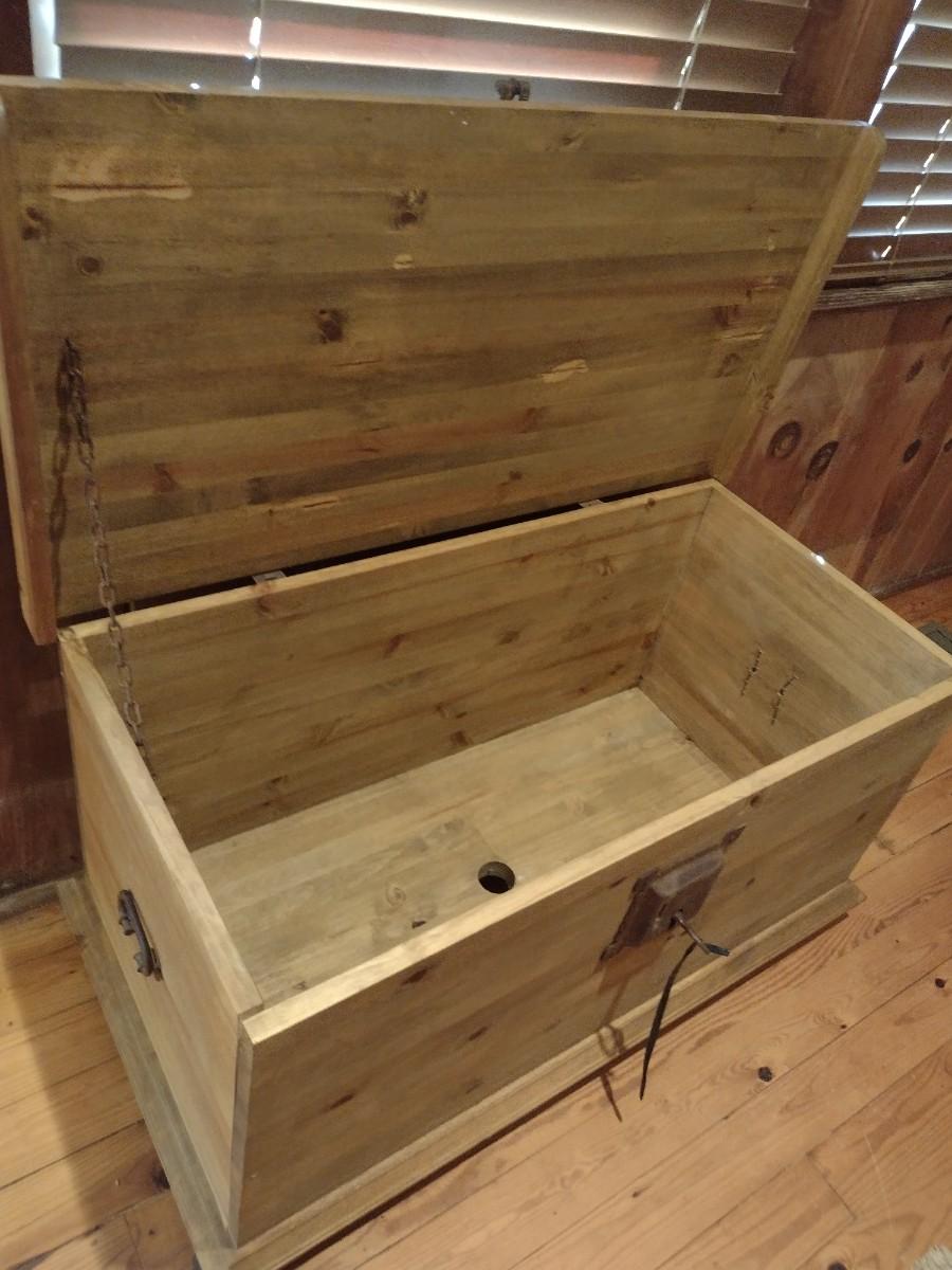 Custom Solid Natural Wood Blanket Chest on Castors. Has hole in floor and will need to be plugged as shown PLEASE NOTE:. Due to no internet connection or wireless service, all invoices must be prepaid via PayPal, Stripe, or Zelle prior to arrival at pick up. Exact change cash onsite is acceptable but absolutely no debit or credit cards at time of pick up.