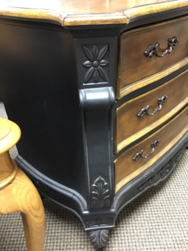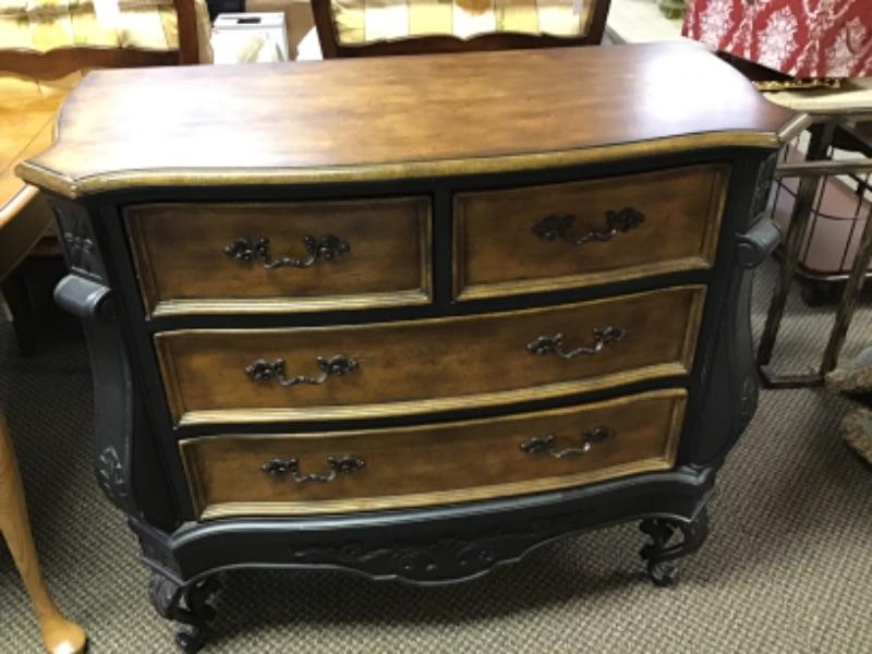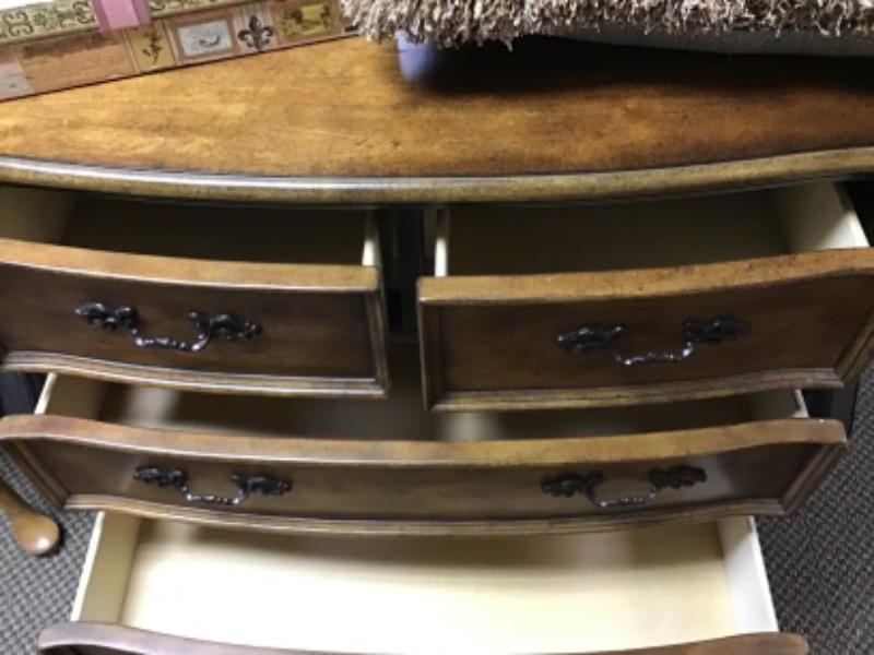 Four Drawer chest. Wood richly detailed. Measures 18.5x40 inches. Extremely clean and sturdy