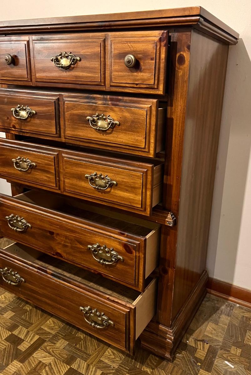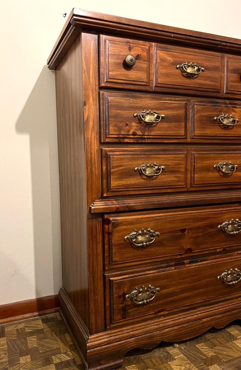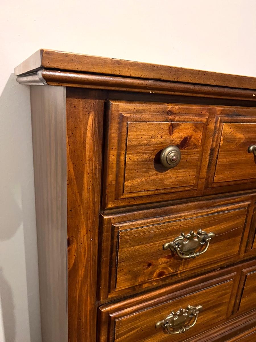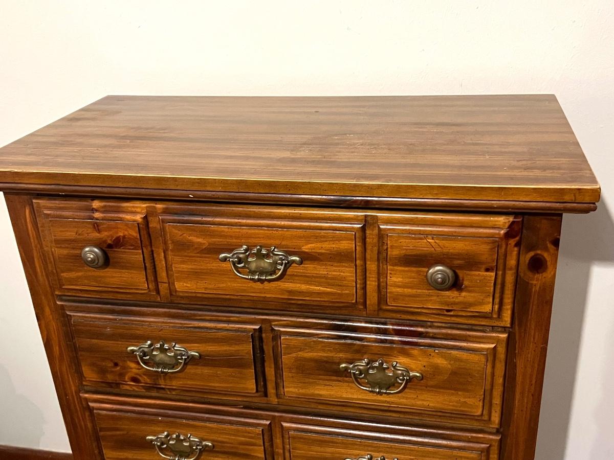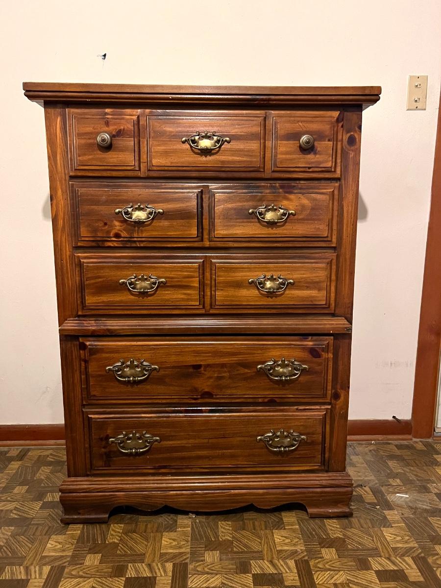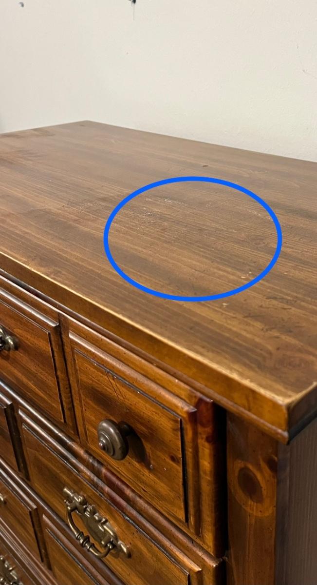 5 drawer chest of drawers. Measures 46 1/2 inches tall, 34 inches wide and 18 inches deep. All drawers work as they should. The top has an area that feels rough., not sure exactly what it is. It’s very subtle but see picture for exact condition.