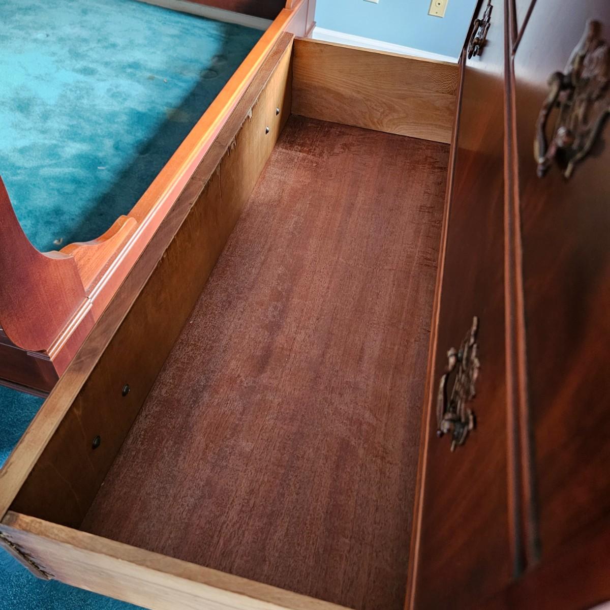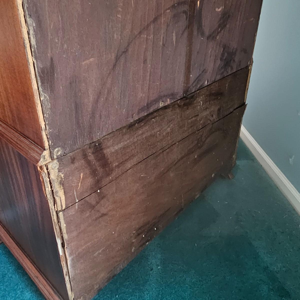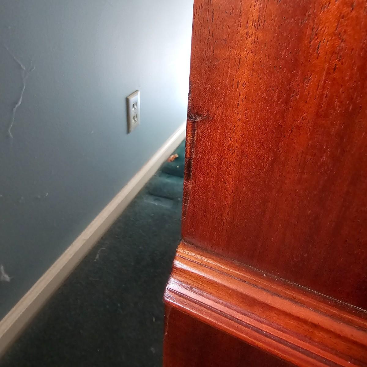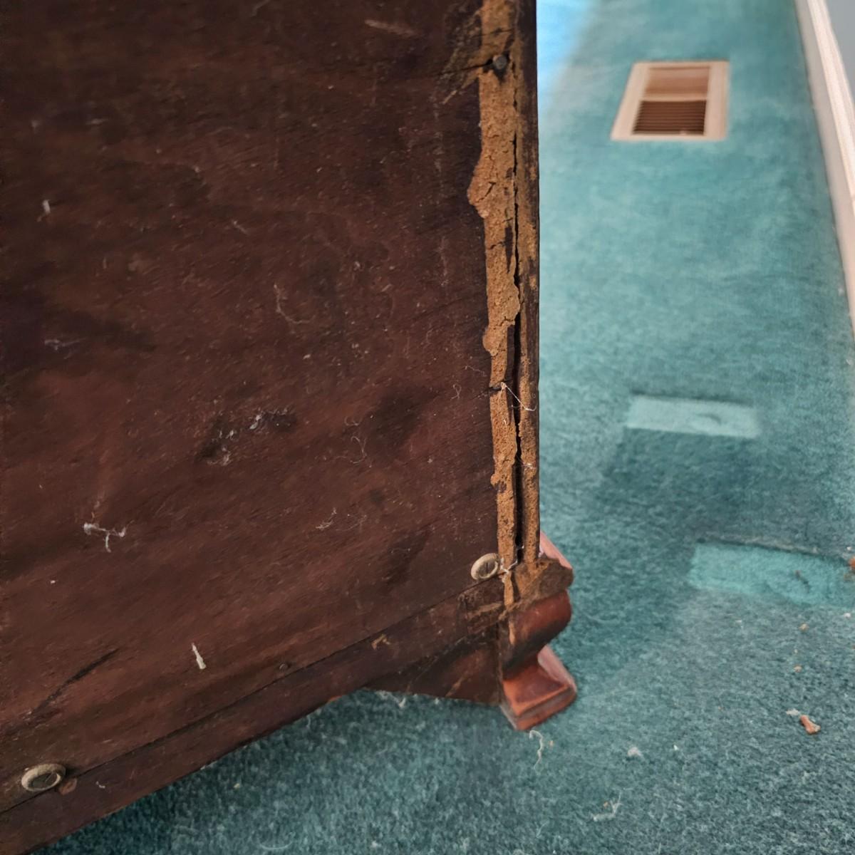 Seven-drawer wooden chest of drawers with beautiful detailed trim. Dovetailing on each drawer. Measures 36” x 20.75” x 53”H. Bottom third of back of chest appears to have been wet, there is separation of panel wood. Some veneer chipping on inside fronts of drawers, and some chipping on outside edges and feet. See photos for details. Local pickup only. Winning bidder must bring assistance to help move and load this item due to its weight and/or size.