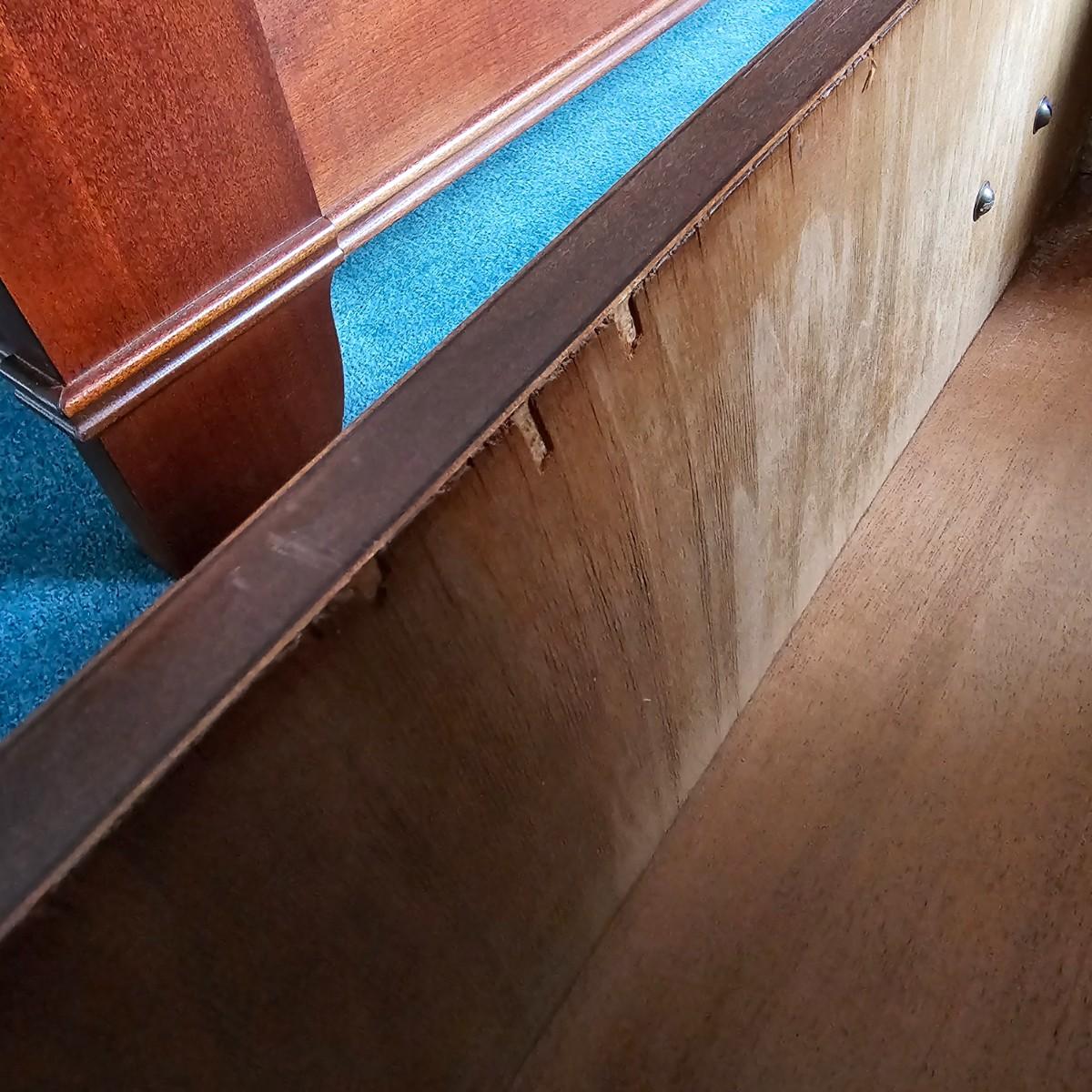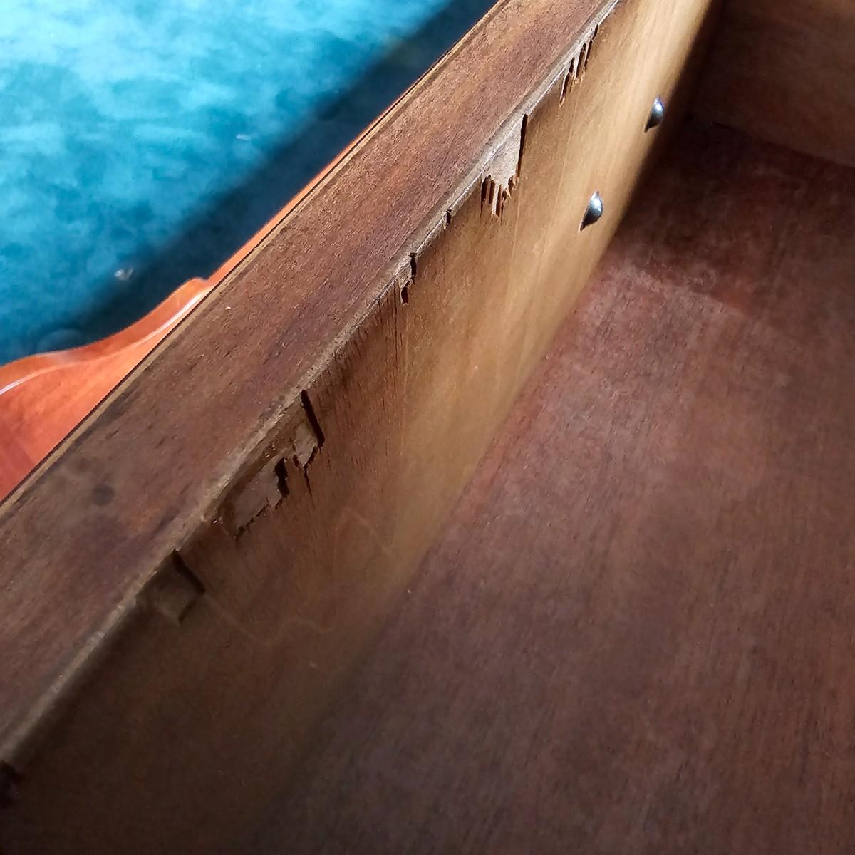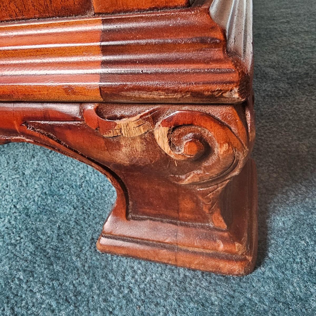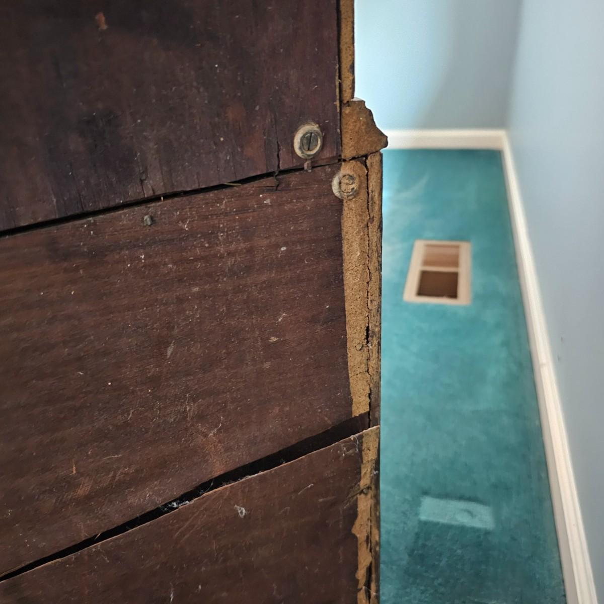Seven-drawer wooden chest of drawers with beautiful detailed trim. Dovetailing on each drawer. Measures 36” x 20.75” x 53”H. Bottom third of back of chest appears to have been wet, there is separation of panel wood. Some veneer chipping on inside fronts of drawers, and some chipping on outside edges and feet. See photos for details. Local pickup only. Winning bidder must bring assistance to help move and load this item due to its weight and/or size.