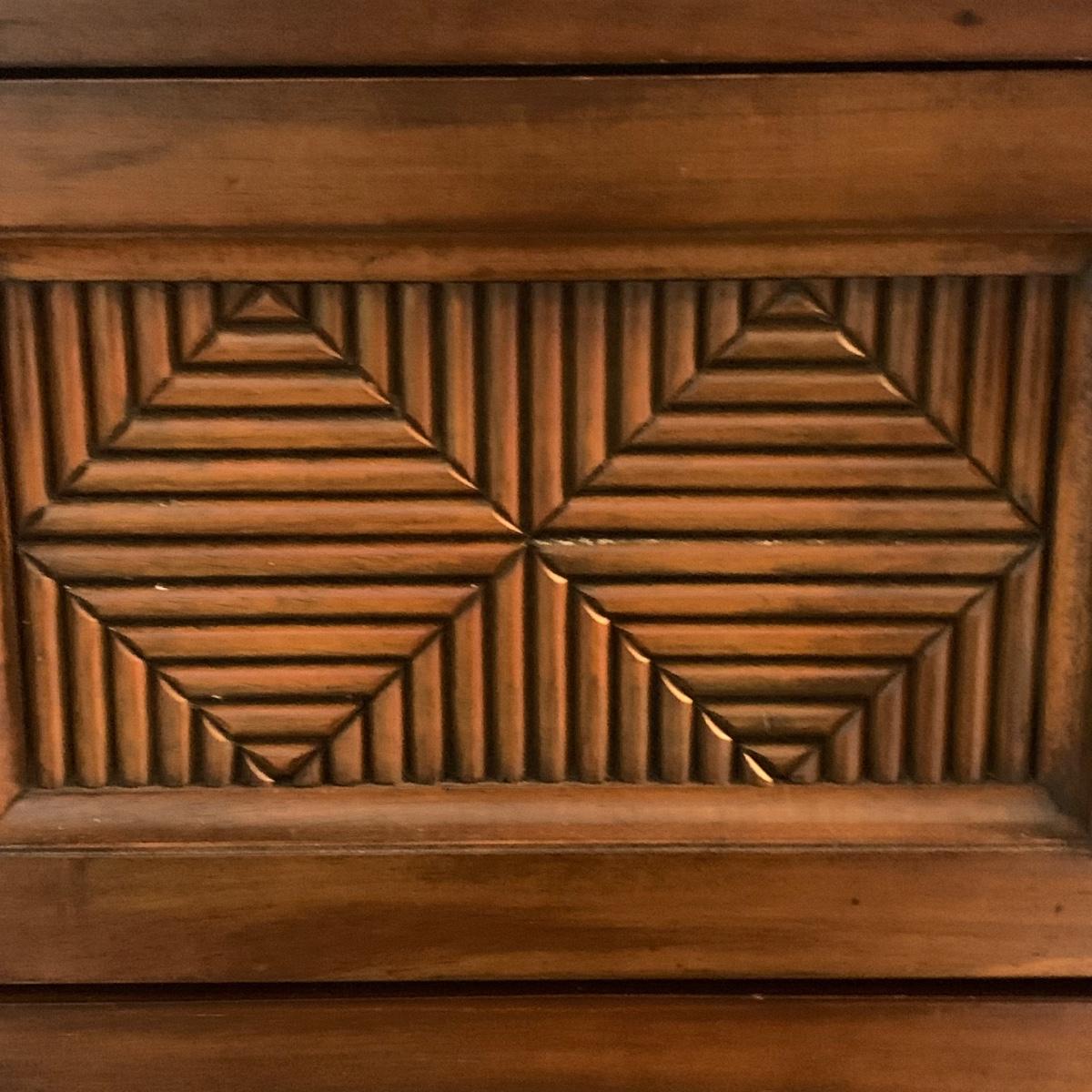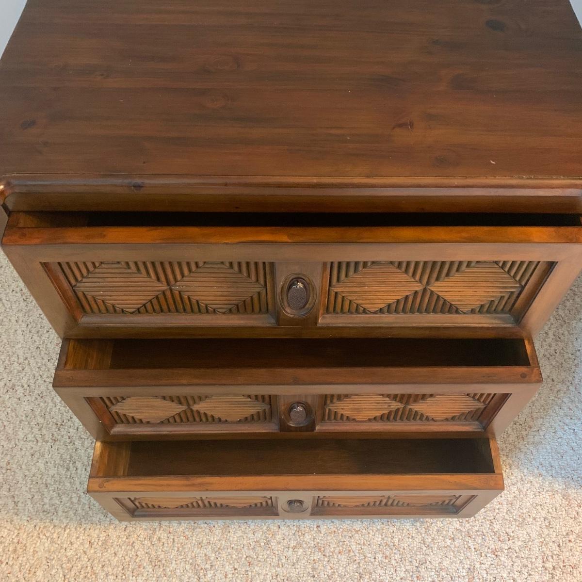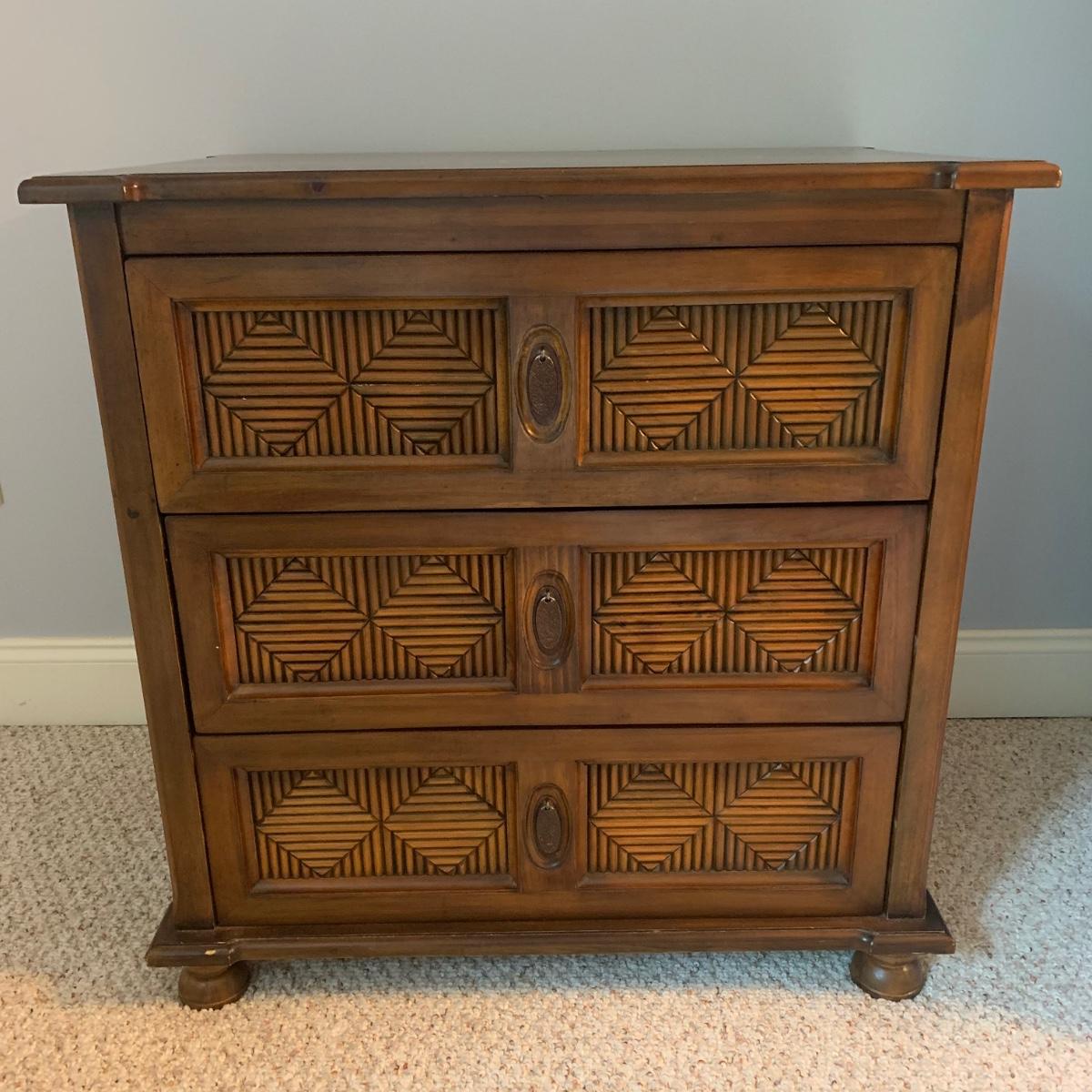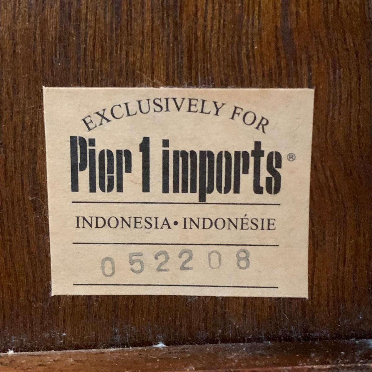Unique chest of drawers made of wood with metal charm handles, from Pier 1 Imports. Unit is footed and measures, 30.5” x 21” x 31”H. Please see photos for more details. Local pickup only. Winning bidder must bring assistance to help move and load this item due to its weight and/or size.