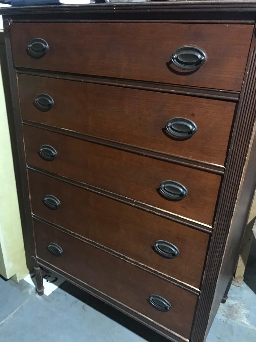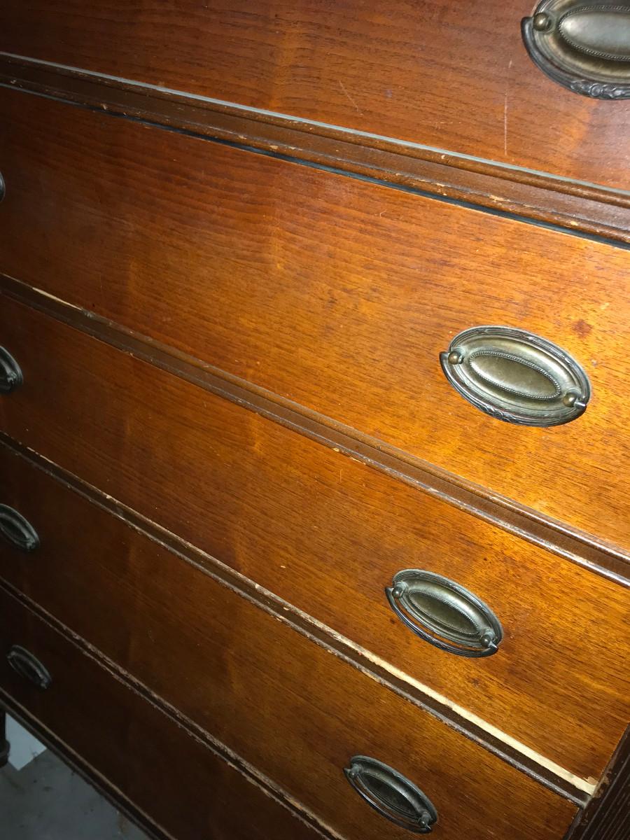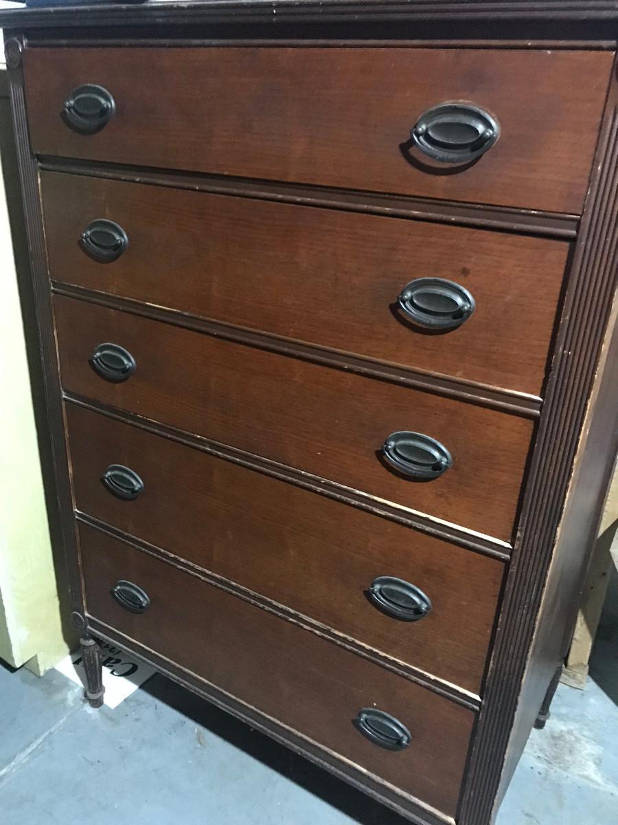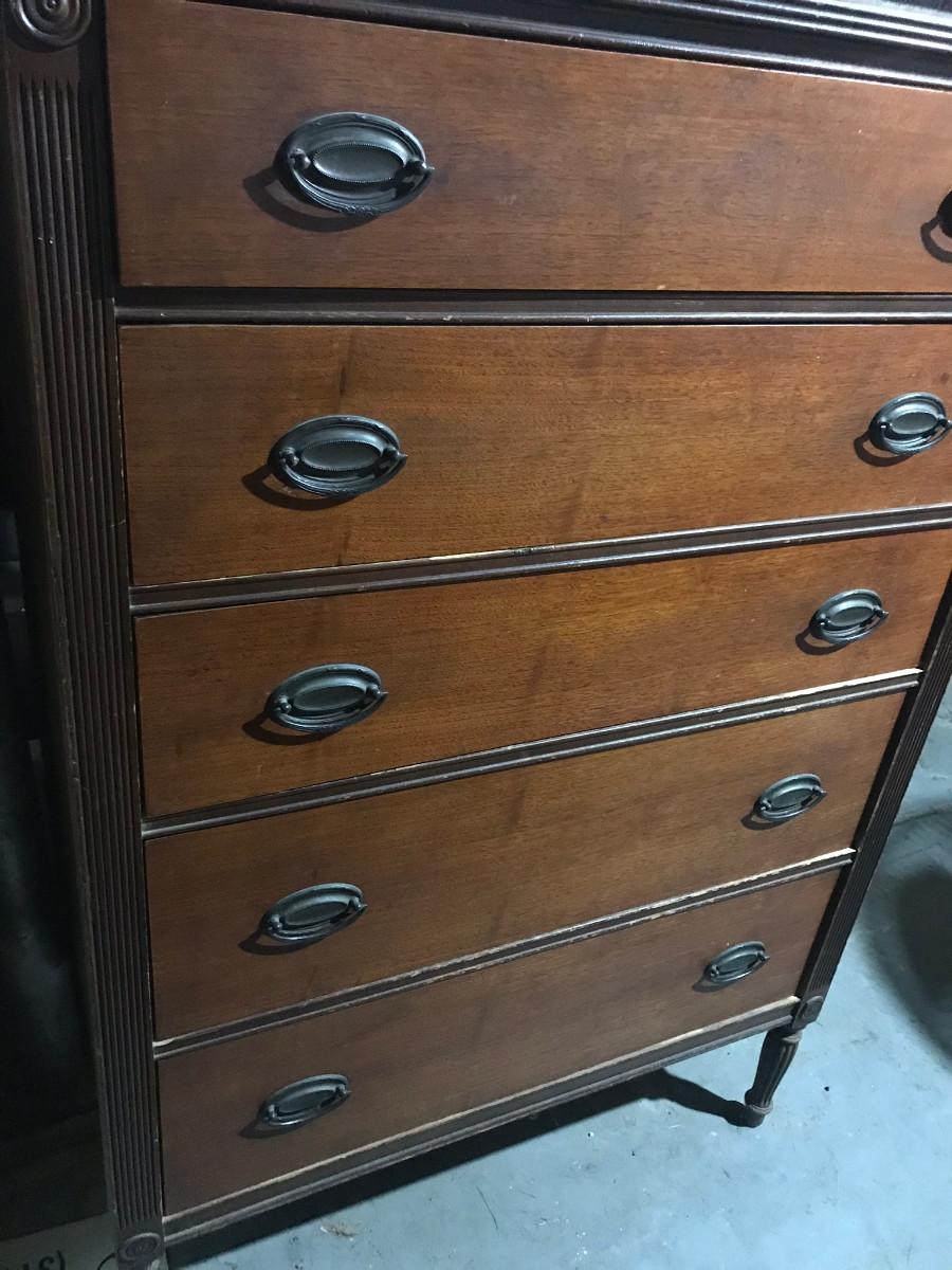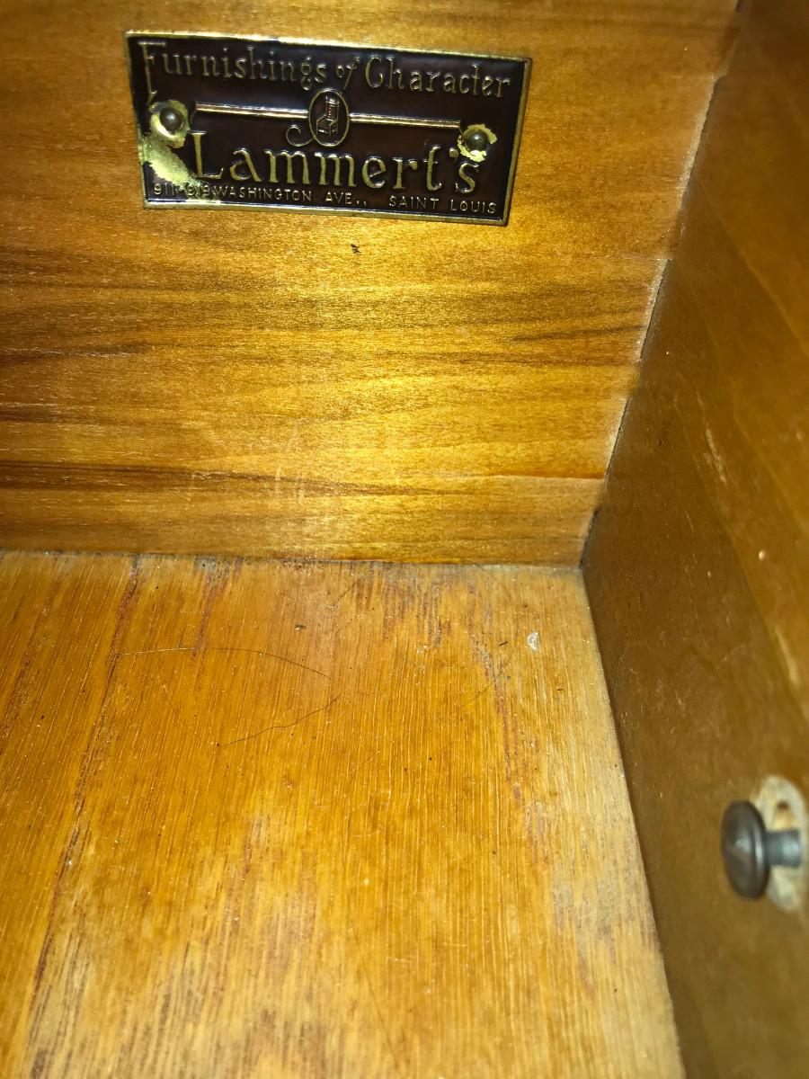 chest of drawers wooden, federal style legs possibly, metal pulls, possibly brass, exterior needs some love but interior is in excellent condition, solid wood with Lammert's furniture labels in drawer see in pics