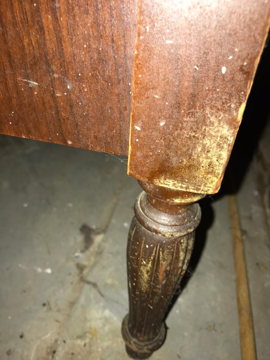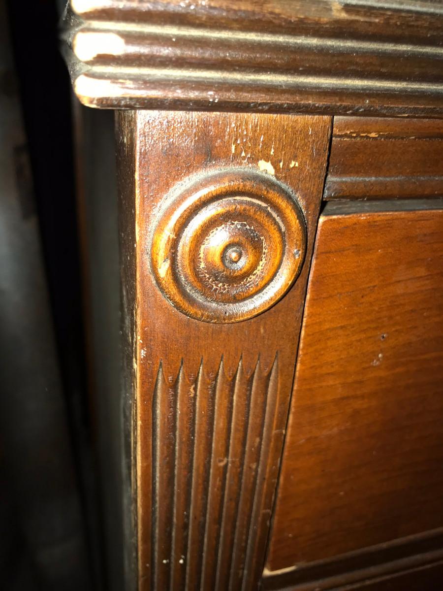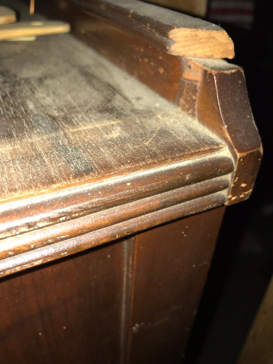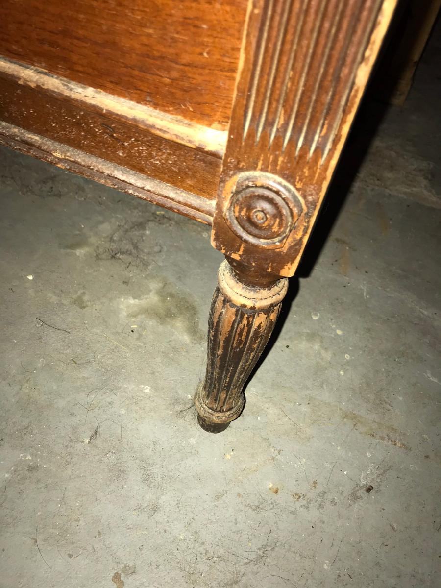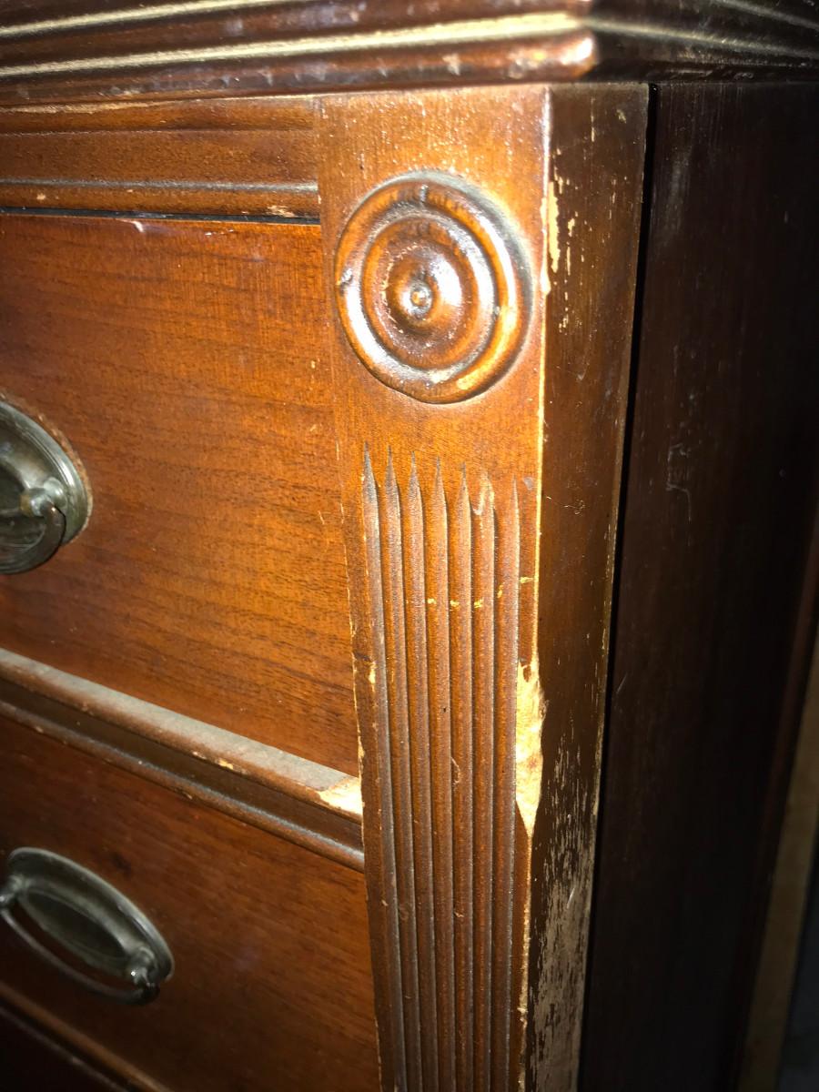 chest of drawers wooden, federal style legs possibly, metal pulls, possibly brass, exterior needs some love but interior is in excellent condition, solid wood with Lammert's furniture labels in drawer see in pics
