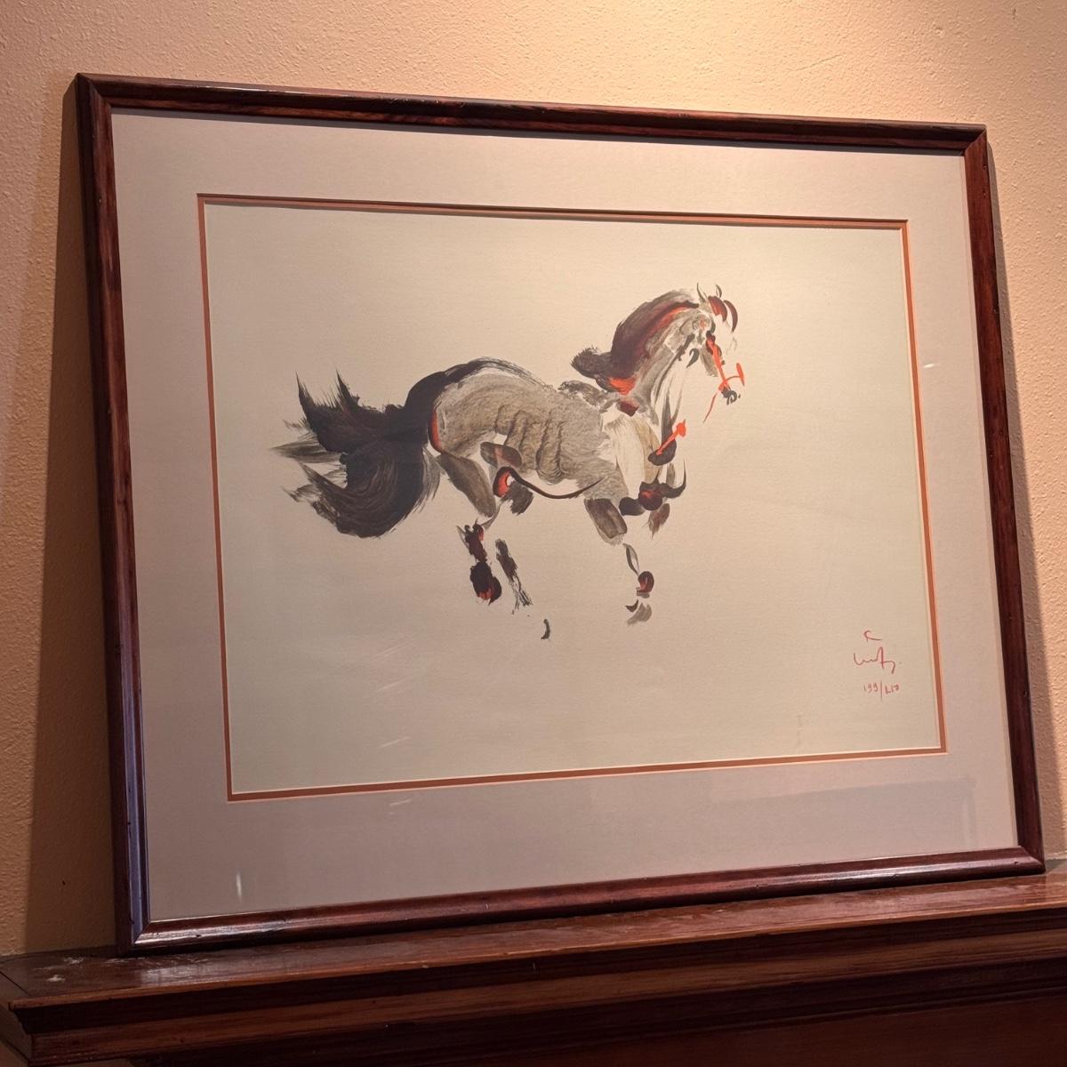 This lot includes one print that appears to be a lithograph print of “Cheval" by Kaiko Moti. The print is signed and numbered as 199/210. It appears to be an original signature. The print is double matted and protected with glass. The frame is wooden and measures 33” x 27”H. Shipping available. Shipping can be costly. We suggest contacting our preferred local shipping provider, Postage Express, with dimensions and getting an estimate before bidding: (828) 255-9250 or shipping@postageexpressnc.com.